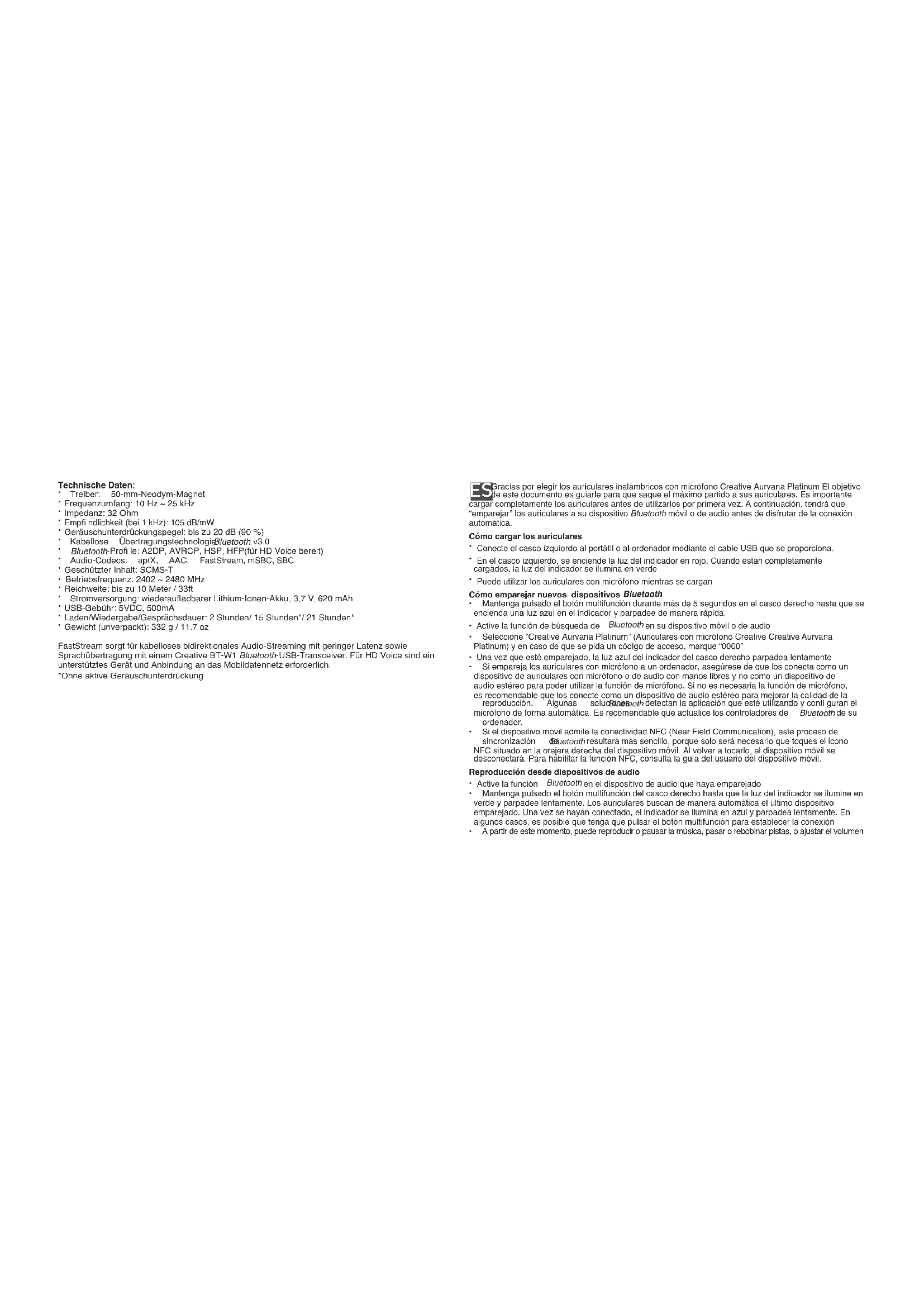 Gracias por elegir los auriculares inalámbricos con micrófono Creative Aurvana Platinum El objetivo de este documento es guiarle para que saque el máximo partido a sus auriculares. Es importante cargar completamente los auriculares antes de utilizarlos por primera vez. A continuación, tendrá que “emparejar” los auriculares a su dispositivo Bluetooth móvil o de audio antes de disfrutar de la conexión automática.Cómo cargar los auriculares Conecte el casco izquierdo al portátil o al ordenador mediante el cable USB que se proporciona. En el casco izquierdo, se enciende la luz del indicador en rojo. Cuando están completamente cargados, la luz del indicador se ilumina en verde Puede utilizar los auriculares con micrófono mientras se carganCómo emparejar nuevos dispositivos Bluetooth
