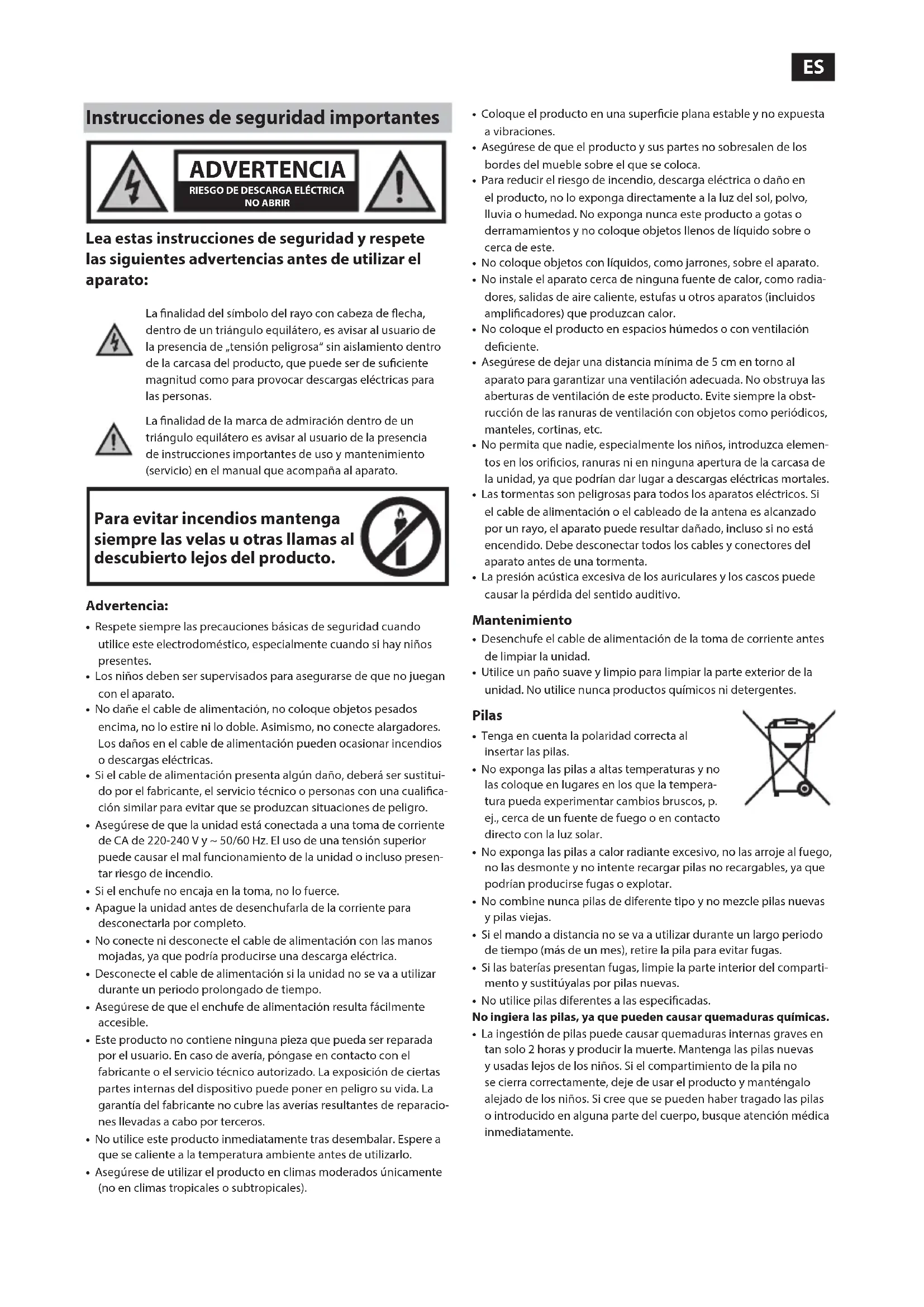 Lea estas instrucciones de seguridad y respete las siguientes advertencias antes de utilizar el aparato: La nalidad del símbolo del rayo con cabeza de echa, dentro de un triángulo equilátero, es avisar al usuario de la presencia de „tensión peligrosa“ sin aislamiento dentro de la carcasa del producto, que puede ser de suciente magnitud como para provocar descargas eléctricas para las personas.La nalidad de la marca de admiración dentro de un triángulo equilátero es avisar al usuario de la presencia de instrucciones importantes de uso y mantenimiento (servicio) en el manual que acompaña al aparato. Para evitar incendios mantenga siempre las velas u otras llamas al descubierto lejos del producto. Advertencia:• Respete siempre las precauciones básicas de seguridad cuando utilice este electrodoméstico, especialmente cuando si hay niños presentes.• Los niños deben ser supervisados para asegurarse de que no juegan con el aparato.• No dañe el cable de alimentación, no coloque objetos pesados encima, no lo estire ni lo doble. Asimismo, no conecte alargadores. Los daños en el cable de alimentación pueden ocasionar incendios o descargas eléctricas.• Si el cable de alimentación presenta algún daño, deberá ser sustitui-do por el fabricante, el servicio técnico o personas con una cualica-ción similar para evitar que se produzcan situaciones de peligro.• Asegúrese de que la unidad está conectada a una toma de corriente de CA de 220-240 V y ~ 50/60 Hz. El uso de una tensión superior puede causar el mal funcionamiento de la unidad o incluso presen-tar riesgo de incendio.• Si el enchufe no encaja en la toma, no lo fuerce.• Apague la unidad antes de desenchufarla de la corriente para desconectarla por completo.• No conecte ni desconecte el cable de alimentación con las manos mojadas, ya que podría producirse una descarga eléctrica.• Desconecte el cable de alimentación si la unidad no se va a utilizar durante un periodo prolongado de tiempo.• Asegúrese de que el enchufe de alimentación resulta fácilmente accesible.• Este producto no contiene ninguna pieza que pueda ser reparada por el usuario. En caso de avería, póngase en contacto con el fabricante o el servicio técnico autorizado. La exposición de ciertas partes internas del dispositivo puede poner en peligro su vida. La garantía del fabricante no cubre las averías resultantes de reparacio-nes llevadas a cabo por terceros.• No utilice este producto inmediatamente tras desembalar. Espere a que se caliente a la temperatura ambiente antes de utilizarlo.• Asegúrese de utilizar el producto en climas moderados únicamente (no en climas tropicales o subtropicales).• Coloque el producto en una supercie plana estable y no expuesta a vibraciones.• Asegúrese de que el producto y sus partes no sobresalen de los bordes del mueble sobre el que se coloca.• Para reducir el riesgo de incendio, descarga eléctrica o daño en el producto, no lo exponga directamente a la luz del sol, polvo, lluvia o humedad. No exponga nunca este producto a gotas o derramamientos y no coloque objetos llenos de líquido sobre o cerca de este.• No coloque objetos con líquidos, como jarrones, sobre el aparato.• No instale el aparato cerca de ninguna fuente de calor, como radia-dores, salidas de aire caliente, estufas u otros aparatos (incluidos amplicadores) que produzcan calor.• No coloque el producto en espacios húmedos o con ventilación deciente.• Asegúrese de dejar una distancia mínima de 5 cm en torno al aparato para garantizar una ventilación adecuada. No obstruya las aberturas de ventilación de este producto. Evite siempre la obst-rucción de las ranuras de ventilación con objetos como periódicos, manteles, cortinas, etc.• No permita que nadie, especialmente los niños, introduzca elemen-tos en los oricios, ranuras ni en ninguna apertura de la carcasa de la unidad, ya que podrían dar lugar a descargas eléctricas mortales.• Las tormentas son peligrosas para todos los aparatos eléctricos. Si el cable de alimentación o el cableado de la antena es alcanzado por un rayo, el aparato puede resultar dañado, incluso si no está encendido. Debe desconectar todos los cables y conectores del aparato antes de una tormenta.• La presión acústica excesiva de los auriculares y los cascos puede causar la pérdida del sentido auditivo.Mantenimiento• Desenchufe el cable de alimentación de la toma de corriente antes de limpiar la unidad.• Utilice un paño suave y limpio para limpiar la parte exterior de la unidad. No utilice nunca productos químicos ni detergentes.Pilas• Tenga en cuenta la polaridad correcta al insertar las pilas.• No exponga las pilas a altas temperaturas y no las coloque en lugares en los que la tempera-tura pueda experimentar cambios bruscos, p. ej., cerca de un fuente de fuego o en contacto directo con la luz solar.• No exponga las pilas a calor radiante excesivo, no las arroje al fuego, no las desmonte y no intente recargar pilas no recargables, ya que podrían producirse fugas o explotar.• No combine nunca pilas de diferente tipo y no mezcle pilas nuevas y pilas viejas.• Si el mando a distancia no se va a utilizar durante un largo periodo de tiempo (más de un mes), retire la pila para evitar fugas.• Si las baterías presentan fugas, limpie la parte interior del comparti-mento y sustitúyalas por pilas nuevas.• No utilice pilas diferentes a las especicadas.No ingiera las pilas, ya que pueden causar quemaduras químicas.• La ingestión de pilas puede causar quemaduras internas graves en tan solo 2 horas y producir la muerte. Mantenga las pilas nuevas y usadas lejos de los niños. Si el compartimiento de la pila no se cierra correctamente, deje de usar el producto y manténgalo alejado de los niños. Si cree que se pueden haber tragado las pilas o introducido en alguna parte del cuerpo, busque atención médica inmediatamente.