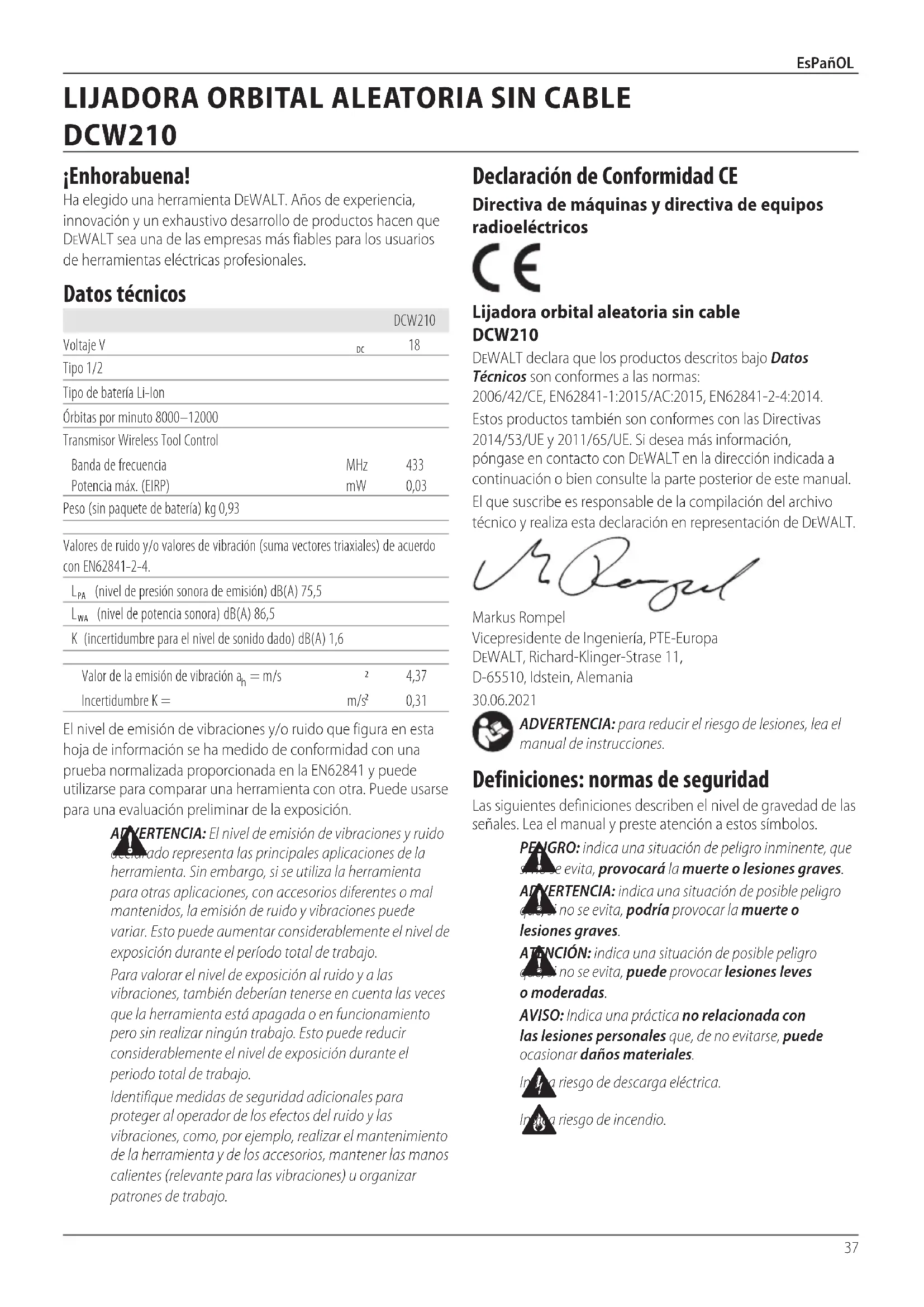 - Li-Ion cells are recyclable. Take them to your dealer or a local recycling station. The collected battery packs will be recycled or disposed ofproperly.37 EsPañOL Declaración de Conformidad CE Directiva de máquinas y directiva de equipos radioeléctricos Lijadora orbital aleatoria sin cable DCW210 DeWALT declara que los productos descritos bajo Datos Técnicos son conformes a las normas: 2006/42/CE, EN62841-1:2015/AC:2015, EN62841-2-4:2014. Estos productos también son conformes con las Directivas 2014/53/UE y 2011/65/UE. Si desea más información, póngase en contacto con DeWALT en la dirección indicada a continuación o bien consulte la parte posterior de estemanual. El que suscribe es responsable de la compilación del archivo técnico y realiza esta declaración en representación deDeWALT. Markus Rompel Vicepresidente de Ingeniería, PTE-Europa DeWALT, Richard-Klinger-Strase 11, D-65510, Idstein, Alemania