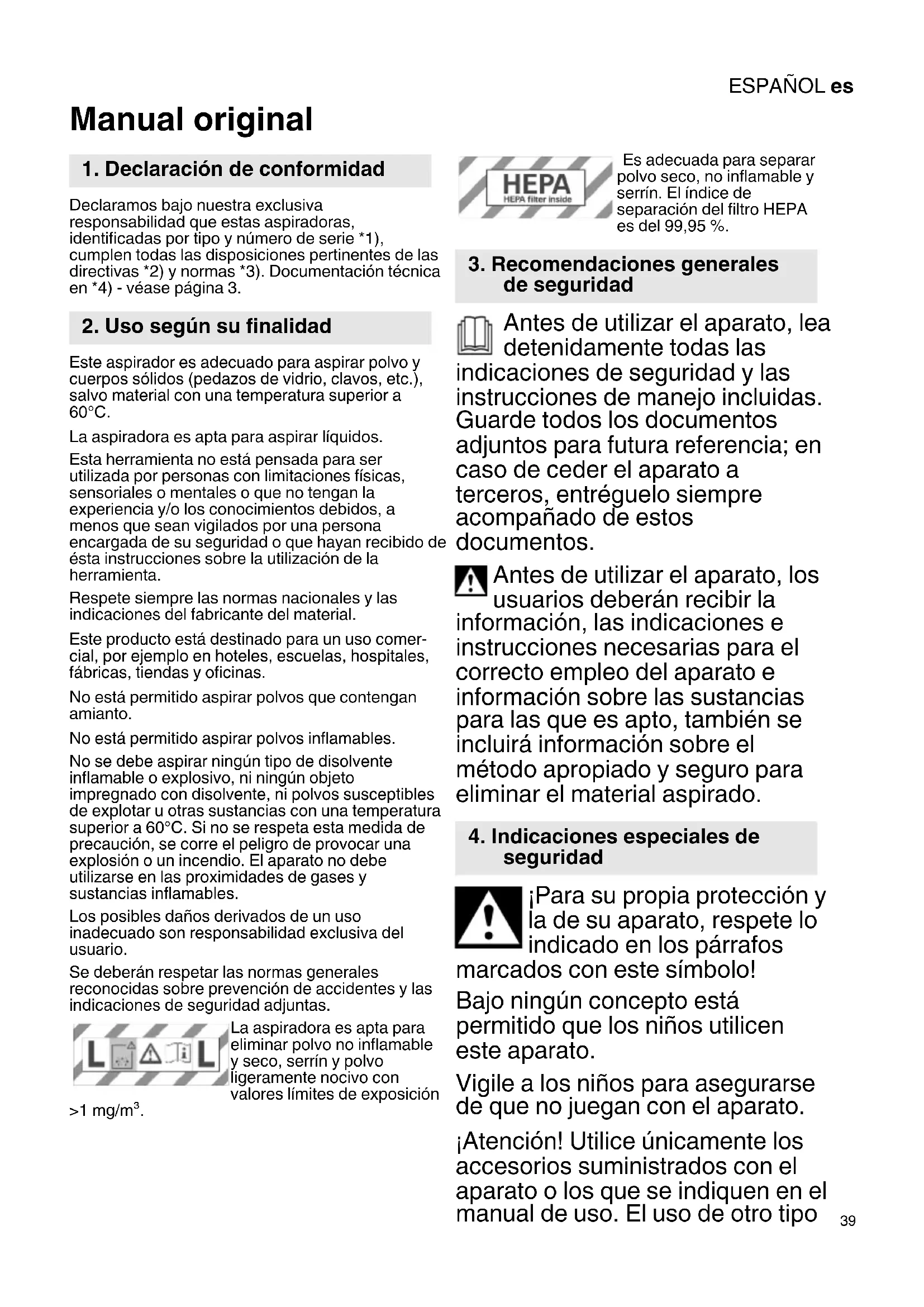 Manual original Declaramos bajo nuestra exclusiva responsabilidad que estas aspiradoras, identificadas por tipo y número de serie *1), cumplen todas las disposiciones pertinentes de las directivas *2) y normas *3). Documentación técnica en *4) - véase página 3. Este aspirador es adecuado para aspirar polvo y cuerpos sólidos (pedazos de vidrio, clavos, etc.), salvo material con una temperatura superior a 60°C. La aspiradora es apta para aspirar líquidos. Esta herramienta no está pensada para ser utilizada por personas con limitaciones físicas, sensoriales o mentales o que no tengan la experiencia y/o los conocimientos debidos, a menos que sean vigilados por una persona encargada de su seguridad o que hayan recibido de ésta instrucciones sobre la utilización de la herramienta. Respete siempre las normas nacionales y las indicaciones del fabricante del material. Este producto está destinado para un uso comer- cial, por ejemplo en hoteles, escuelas, hospitales, fábricas, tiendas y oficinas. No está permitido aspirar polvos que contengan amianto. No está permitido aspirar polvos inflamables. No se debe aspirar ningún tipo de disolvente inflamable o explosivo, ni ningún objeto impregnado con disolvente, ni polvos susceptibles de explotar u otras sustancias con una temperatura superior a 60°C. Si no se respeta esta medida de precaución, se corre el peligro de provocar una explosión o un incendio. El aparato no debe utilizarse en las proximidades de gases y sustancias inflamables. Los posibles daños derivados de un uso inadecuado son responsabilidad exclusiva del usuario. Se deberán respetar las normas generales reconocidas sobre prevención de accidentes y las indicaciones de seguridad adjuntas. La aspiradora es apta para eliminar polvo no inflamable y seco, serrín y polvo ligeramente nocivo con valores límites de exposición >1 mg/m³. Es adecuada para separar polvo seco, no inflamable y serrín. El índice de separación del filtro HEPA es del 99,95 %. Antes de utilizar el aparato, lea detenidamente todas las indicaciones de seguridad y las instrucciones de manejo incluidas. Guarde todos los documentos adjuntos para futura referencia; en caso de ceder el aparato a terceros, entréguelo siempre acompañado de estos documentos. Antes de utilizar el aparato, los usuarios deberán recibir la información, las indicaciones e instrucciones necesarias para el correcto empleo del aparato e información sobre las sustancias para las que es apto, también se incluirá información sobre el método apropiado y seguro para eliminar el material aspirado. ¡Para su propia protección y la de su aparato, respete lo indicado en los párrafos marcados con este símbolo! Bajo ningún concepto está permitido que los niños utilicen este aparato. Vigile a los niños para asegurarse de que no juegan con el aparato. ¡Atención! Utilice únicamente los accesorios suministrados con el aparato o los que se indiquen en el manual de uso. El uso de otro tipo