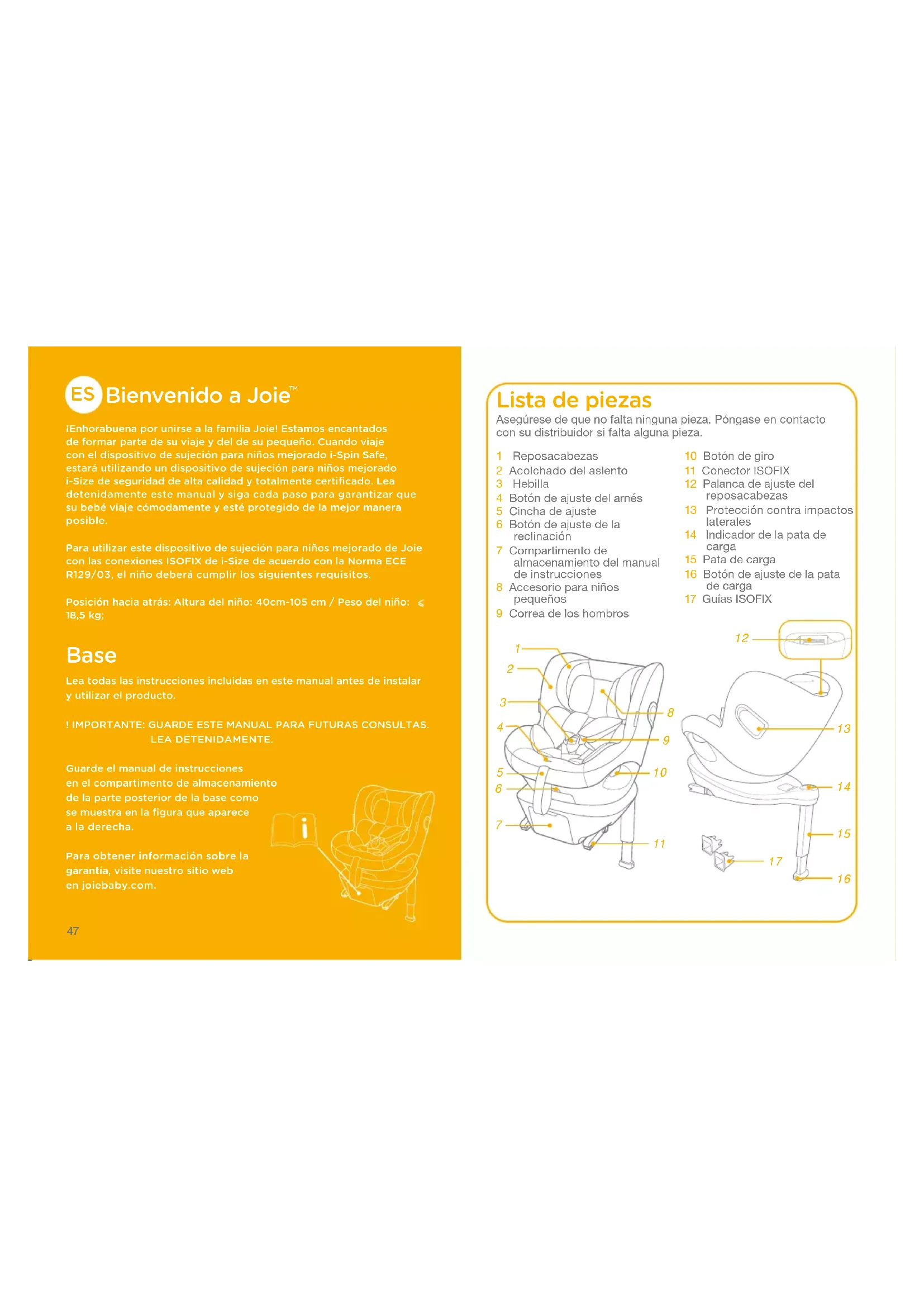 ¡Enhorabuena por unirse a la familia Joie! Estamos encantados de formar parte de su viaje y del de su pequeño. Cuando viaje con el dispositivo de sujeción para niños mejorado i-Spin Safe, estará utilizando un dispositivo de sujeción para niños mejorado i-Size de seguridad de alta calidad y totalmente certificado. Lea detenidamente este manual y siga cada paso para garantizar que su bebé viaje cómodamente y esté protegido de la mejor manera posible.Para utilizar este dispositivo de sujeción para niños mejorado de Joie con las conexiones ISOFIX de i-Size de acuerdo con la Norma ECE R129/03, el niño deberá cumplir los siguientes requisitos.Posición hacia atrás: Altura del niño: 40cm-105 cm / Peso del niño:18,5 kg; Base Lea todas las instrucciones incluidas en este manual antes de instalar y utilizar el producto.! IMPORTANTE: GUARDE ESTE MANUAL PARA FUTURAS CONSULTAS.LEA DETENIDAMENTE.Guarde el manual de instrucciones en el compartimento de almacenamiento de la parte posterior de la base como se muestra en la figura que aparece a la derecha.Para obtener información sobre la garantía, visite nuestro sitio web en joiebaby.com. Lista de piezas 1 Reposacabezas2 Acolchado del asiento3 Hebilla4 Botón de ajuste del arnés5 Cincha de ajuste6 Botón de ajuste de la reclinación7 Compartimento de almacenamiento del manual de instrucciones8 Accesorio para niños pequeños9 Correa de los hombros10 Botón de giro11 Conector ISOFIX12 Palanca de ajuste del reposacabezas13 Protección contra impactos laterales14 Indicador de la pata de carga15 Pata de carga16 Botón de ajuste de la pata de carga17 Guías ISOFIXAsegúrese de que no falta ninguna pieza. Póngase en contacto con su distribuidor si falta alguna pieza.