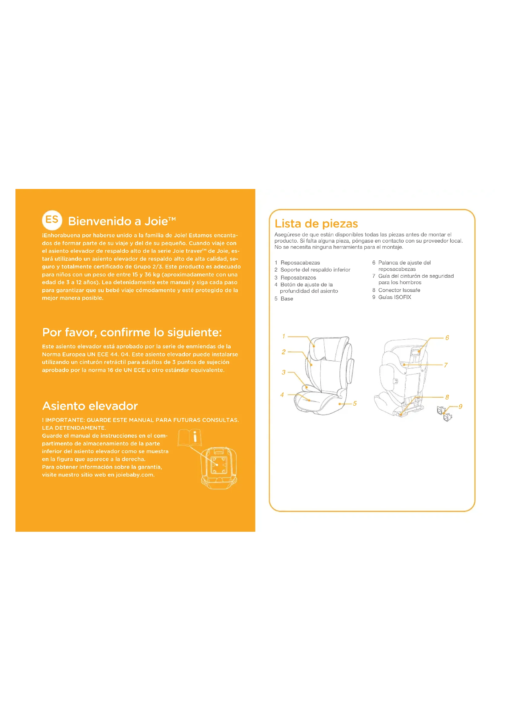 de Joie, es- tará utilizando un asiento elevador de respaldo alto de alta calidad, se- guro y totalmente certificado de Grupo 2/3. Este producto es adecuado para niños con un peso de entre 15 y 36 kg (aproximadamente con una edad de 3 a 12 años). Lea detenidamente este manual y siga cada paso para garantizar que su bebé viaje cómodamente y esté protegido de la mejor manera posible. Por favor, confirme lo siguiente: Este asiento elevador está aprobado por la serie de enmiendas de la Norma Europea UN ECE 44. 04. Este asiento elevador puede instalarse utilizando un cinturón retráctil para adultos de 3 puntos de sujeción aprobado por la norma 16 de UN ECE u otro estándar equivalente. Asiento elevador ! IMPORTANTE: GUARDE ESTE MANUAL PARA FUTURAS CONSULTAS. LEA DETENIDAMENTE. Guarde el manual de instrucciones en el com- partimento de almacenamiento de la parte inferior del asiento elevador como se muestra en la figura que aparece a la derecha. Para obtener información sobre la garantía, visite nuestro sitio web en joiebaby.com.