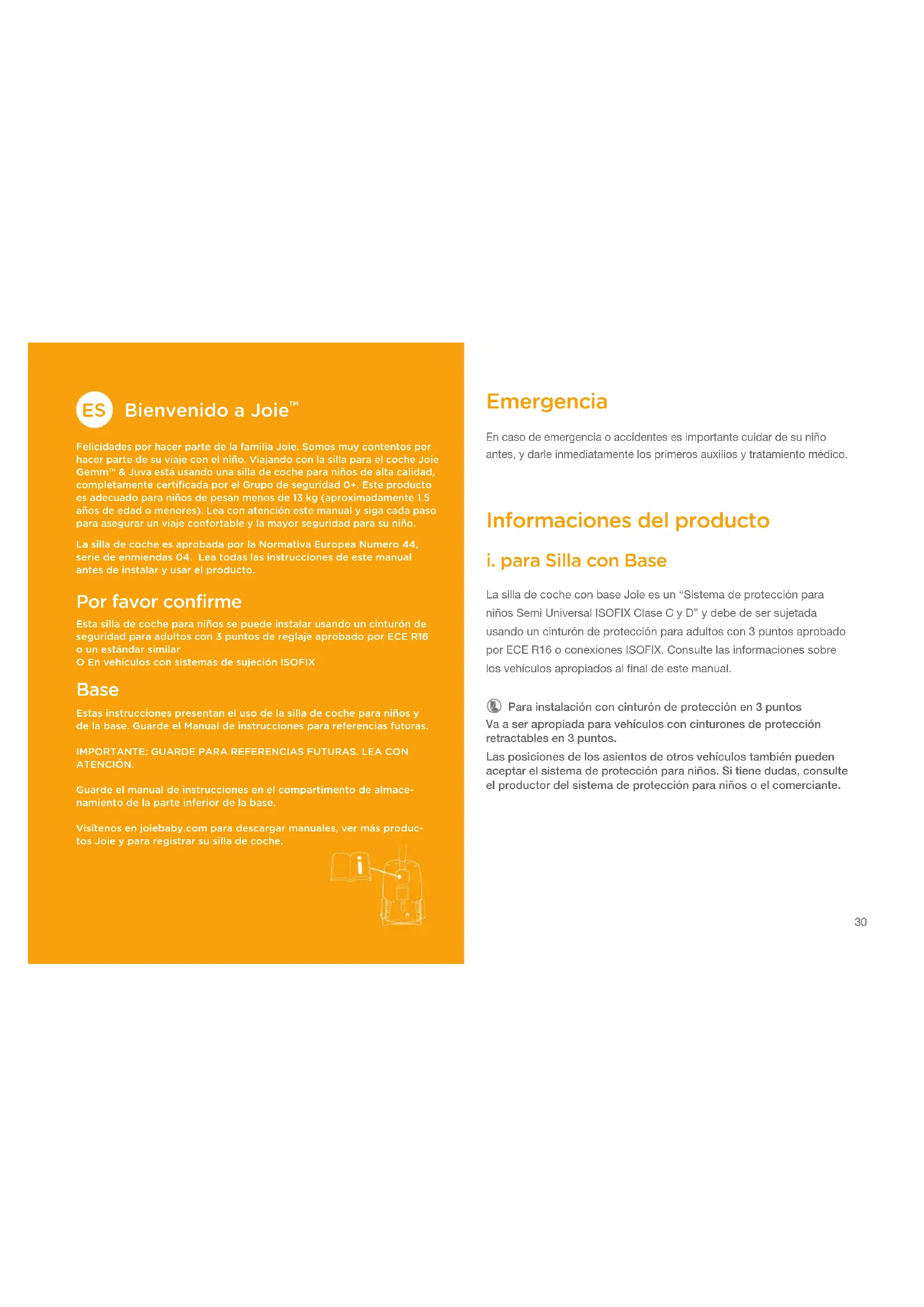 Felicidades por hacer parte de la familia Joie. Somos muy contentos por hacer parte de su viaje con el niño. Viajando con la silla para el coche Joie Gemm™ & Juva está usando una silla de coche para niños de alta calidad, completamente certificada por el Grupo de seguridad 0+. Este producto es adecuado para niños de pesan menos de 13 kg (aproximadamente 1.5 años de edad o menores). Lea con atención este manual y siga cada paso para asegurar un viaje confortable y la mayor seguridad para su niño. La silla de coche es aprobada por la Normativa Europea Numero 44, serie de enmiendas 04. Lea todas las instrucciones de este manual antes de instalar y usar el producto. Por favor confirme Esta silla de coche para niños se puede instalar usando un cinturón de seguridad para adultos con 3 puntos de reglaje aprobado por ECE R16 o un estándar similar O En vehículos con sistemas de sujeción ISOFIX Base Estas instrucciones presentan el uso de la silla de coche para niños y de la base. Guarde el Manual de instrucciones para referencias futuras. IMPORTANTE: GUARDE PARA REFERENCIAS FUTURAS. LEA CON ATENCIÓN. Guarde el manual de instrucciones en el compartimento de almace- namiento de la parte inferior de la base. Visítenos en joiebaby.com para descargar manuales, ver más produc- tos Joie y para registrar su silla de coche. Emergencia En caso de emergencia o accidentes es importante cuidar de su niño antes, y darle inmediatamente los primeros auxilios y tratamiento médico. Informaciones del producto