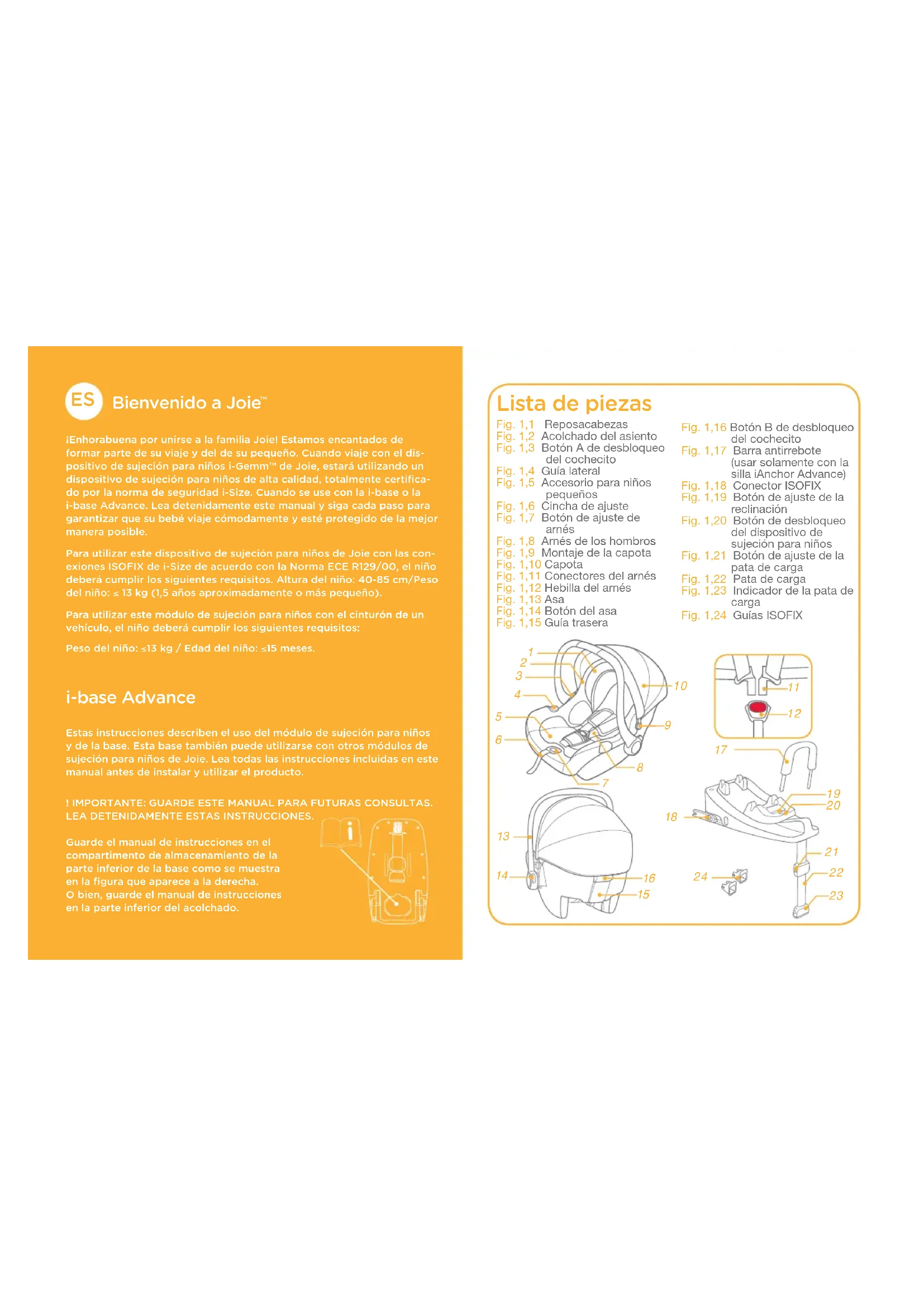 ¡Enhorabuena por unirse a la familia Joie! Estamos encantados de formar parte de su viaje y del de su pequeño. Cuando viaje con el dis-positivo de sujeción para niños i-Gemm™ de Joie, estará utilizando un dispositivo de sujeción para niños de alta calidad, totalmente certifica-do por la norma de seguridad i-Size. Cuando se use con la i-base o la i-base Advance. Lea detenidamente este manual y siga cada paso para garantizar que su bebé viaje cómodamente y esté protegido de la mejor manera posible.Para utilizar este dispositivo de sujeción para niños de Joie con las con-exiones ISOFIX de i-Size de acuerdo con la Norma ECE R129/00, el niño deberá cumplir los siguientes requisitos. Altura del niño: 40-85 cm/Peso del niño: ≤ 13 kg (1,5 años aproximadamente o más pequeño).Para utilizar este módulo de sujeción para niños con el cinturón de un vehículo, el niño deberá cumplir los siguientes requisitos:Peso del niño: ≤13 kg / Edad del niño: ≤15 meses. i-base Advance Estas instrucciones describen el uso del módulo de sujeción para niños y de la base. Esta base también puede utilizarse con otros módulos de sujeción para niños de Joie. Lea todas las instrucciones incluidas en este manual antes de instalar y utilizar el producto.! IMPORTANTE: GUARDE ESTE MANUAL PARA FUTURAS CONSULTAS. LEA DETENIDAMENTE ESTAS INSTRUCCIONES.Guarde el manual de instrucciones en el compartimento de almacenamiento de la parte inferior de la base como se muestra en la figura que aparece a la derecha. O bien, guarde el manual de instrucciones en la parte inferior del acolchado. Lista de piezas Fig. 1,1 Reposacabezas Fig. 1,2 Acolchado del asiento Fig. 1,3 Botón A de desbloqueo del cochecito Fig. 1,4 Guía lateral Fig. 1,5 Accesorio para niños pequeños Fig. 1,6 Cincha de ajuste Fig. 1,7 Botón de ajuste de arnés Fig. 1,8 Arnés de los hombros Fig. 1,9 Montaje de la capota Fig. 1,10 Capota Fig. 1,11 Conectores del arnés Fig. 1,12 Hebilla del arnés Fig. 1,13 Asa Fig. 1,14 Botón del asa Fig. 1,15 Guía trasera Fig. 1,16 Botón B de desbloqueo del cochecito Fig. 1,17 Barra antirrebote (usar solamente con la silla iAnchor Advance) Fig. 1,18 Conector ISOFIX Fig. 1,19 Botón de ajuste de la reclinación Fig. 1,20 Botón de desbloqueo del dispositivo de sujeción para niños Fig. 1,21 Botón de ajuste de la pata de carga Fig. 1,22 Pata de carga Fig. 1,23 Indicador de la pata de carga Fig. 1,24 Guías ISOFIX67 68 ADVERTENCIA ! Antes de comprar este dispositivo de sujeción para niños, asegúrese de que se pueda instalar correctamente en su vehículo. ! NINGÚN dispositivo de sujeción para niños puede garantizar una protección total contra lesiones en caso de accidente. Sin embargo, un uso adecuado de este dispositivo de sujeción para niños reducirá el riesgo de lesiones graves o, incluso, de muerte del niño. ! Para utilizar este dispositivo de sujeción para niños con las conexiones ISOFIX de acuerdo con la Norma ECE R129/00, el niño deberá cumplir los siguientes requisitos: Altura del niño: 40-85 cm/Peso del niño: ≤ 13 kg (1,5 años aproxima