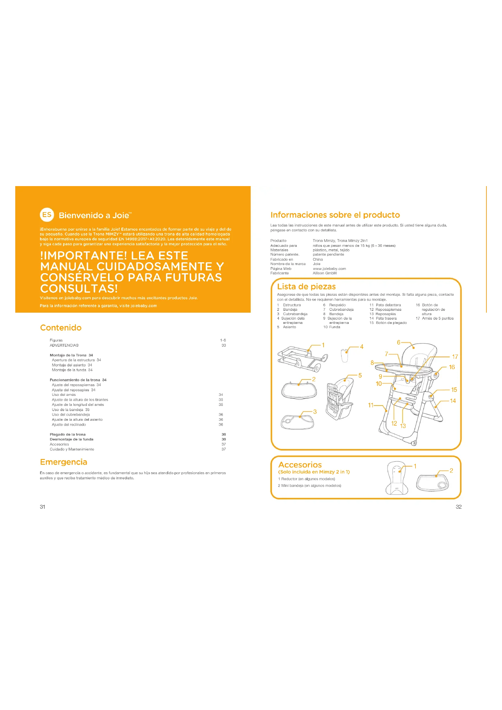 CONSULTAS! Visítenos en joiebaby.com para descubrir muchos más excitantes productos Joie.Para la información referente a garantía, visite joiebaby.com Contenido Figuras 1-6ADVERTENCIAS 33Montaje de la Trona 34 Apertura de la estructura 34 Montaje del asiento 34 Montaje de la funda 34Funcionamiento de la trona 34 Ajuste del reposapiernas 34 Ajuste del reposapies 34 Uso del arnés 34 Ajuste de la altura de los tirantes 35 Ajuste de la longitud del arnés 35 Uso de la bandeja 35 Uso del cubrebandeja 36 Ajuste de la altura del asiento 36 Ajuste del reclinado 36Plegado de la trona 36Desmontaje de la funda 36Accesorios 37Cuidado y Mantenimiento 37 Emergencia En caso de emergencia o accidente, es fundamental que su hijo sea atendido por profesionales en primeros auxilios y que reciba tratamiento médico de inmediato. Informaciones sobre el producto Lea todas las instrucciones de este manual antes de utilizar este producto. Si usted tiene alguna duda, póngase en contacto con su detallista.Producto Trona Mimzy, Trona Mimzy 2in1Adecuado para niños que pesan menos de 15 kg (6 - 36 meses)Materiales plástico, metal, tejido Número patente. patente pendienteFabricado en ChinaNombre de la marca Joie Página Web www.joiebaby.com Fabricante Allison GmbH33