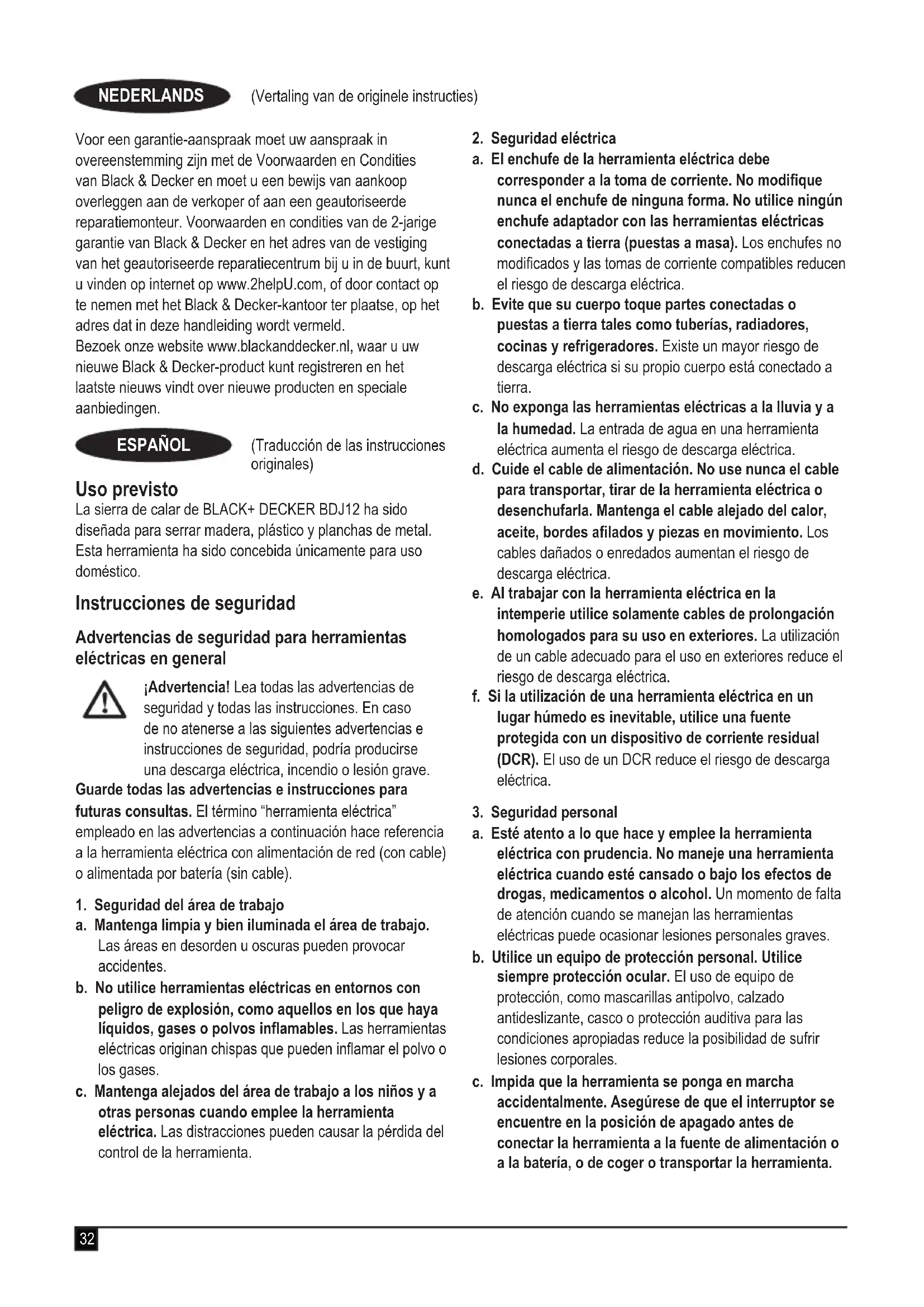 Sierra de calar BDJ12 Black & Decker declara que los productos descritos en “datos técnicos” cumplen las siguientes normas: 2006/42/EC, EN62841-1:2015 , EN62841-2-11:2016. Estos productos también cumplen las Directivas 2014/30/UE y 2011/65/UE.38 (Traducción de las instrucciones originales) ESPAÑOL Para más información, póngase en contacto con Black & Decker en la siguiente dirección o consulte la parte posterior del manual. El abajo rmante es el responsable de la compilación del archivo técnico y realiza esta declaración en representación de Black & Decker. A. P. Smith Director Técnico Black & Decker Europa, 270Bath Road, Slough, Berkshire, SL1 4DX Reino Unido 30/04/2019 Garantía Black & Decker confía en la calidad de sus productos y ofrece a los consumidores una garantía de 24 meses a partir de la fecha de compra. Esta garantía es adicional a sus derechos legales y no los menoscaba en modo alguno. La garantía es válida dentro de los territorios de los Estados Miembros de la Unión Europea y del Área de Libre Comercio Europea. Para reclamar la garantía, la reclamación se debe presentar de conformidad con las condiciones de Black & Decker. Tendrá que adjuntar un justicante de compra al vendedor o al agente técnico autorizado. Las condiciones de la garantía de 2 años de Black & Decker y la ubicación de su agente técnico autorizado más cercano se pueden obtener en Internet en www.2helpU.com o poniéndose en contacto con su ocina local de Black & Decker en la dirección que se indica en este manual. Visite nuestro sitio web www.blackanddecker.co.uk para registrar su nuevo producto Black & Decker y recibir noticias sobre nuevos productos y ofertas especiales. (Tradução das instruções originais) PORTUGUÊS Utilização pretendida A serra eléctrica BLACK+DECKER BDJ12 foi concebida para serrar madeira, plástico e chapas metálicas. Esta ferramenta destina-se apenas para utilização doméstica. Instruções de segurança Avisos de segurança gerais para ferramentas eléctricas Atenção! Leia todos os avisos de segurança e todas as instruções. O não cumprimento dos seguintes avisos e instruções pode resultar em choque elétrico, incêndio e/ou ferimentos graves. Guarde todos os avisos e instruções para futura referência. A expressão “ferramenta eléctrica” utilizada a seguir refere-se a ferramentas eléctricas com ligação à corrente eléctrica (com cabo) ou com bateria (sem os).