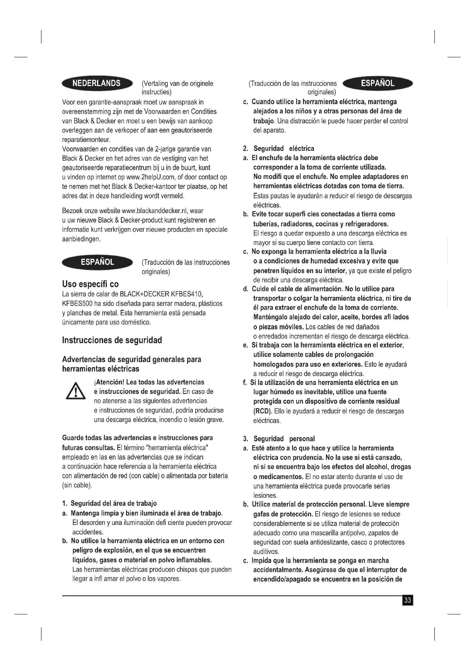 R. LaverickEngineering ManagerBlack & Decker Europe, 210 Bath Road, Slough, Berkshire, SL1 3YD Reino Unido30.05.2018 Garantía Black & Decker confía en la calidad de sus productos y ofrece a los consumidores una garantía de 24 meses a partir de la fecha de compra. Esta garantía es adicional a sus derechos legales y no los menoscaba en modo alguno. La garantía es válida dentro de los territorios de los Estados Miembros de la Unión Europea y del Área de Libre Comercio Europea.Para reclamar la garantía, la reclamación se debe presentar de conformidad con las condiciones de Black & Decker. Tendrá que adjuntar un justifi cante de compra al vendedor o al agente técnico autorizado. Las condiciones de la garantía de 2 años de Black & Decker y la ubicación de su agente técnico autorizado más cercano se pueden obtener en Internet en www.2helpU.com o poniéndose en contacto con su ofi cina local de Black & Decker en la dirección que se indica en este manual.Visite nuestro sitio web www.blackanddecker.co.uk para registrar su nuevo producto Black & Decker y recibir noticias sobre nuevos productos y ofertas especiales. Utilização prevista A serrote de ponta BLACK+DECKER KFBES410, KFBES500 foi concebida para serrar madeira, plásticos e chapas metálicas. Esta ferramenta destina-se apenas a utilização doméstica. Instruções de segurança Avisos de segurança gerais para ferramentas eléctricas