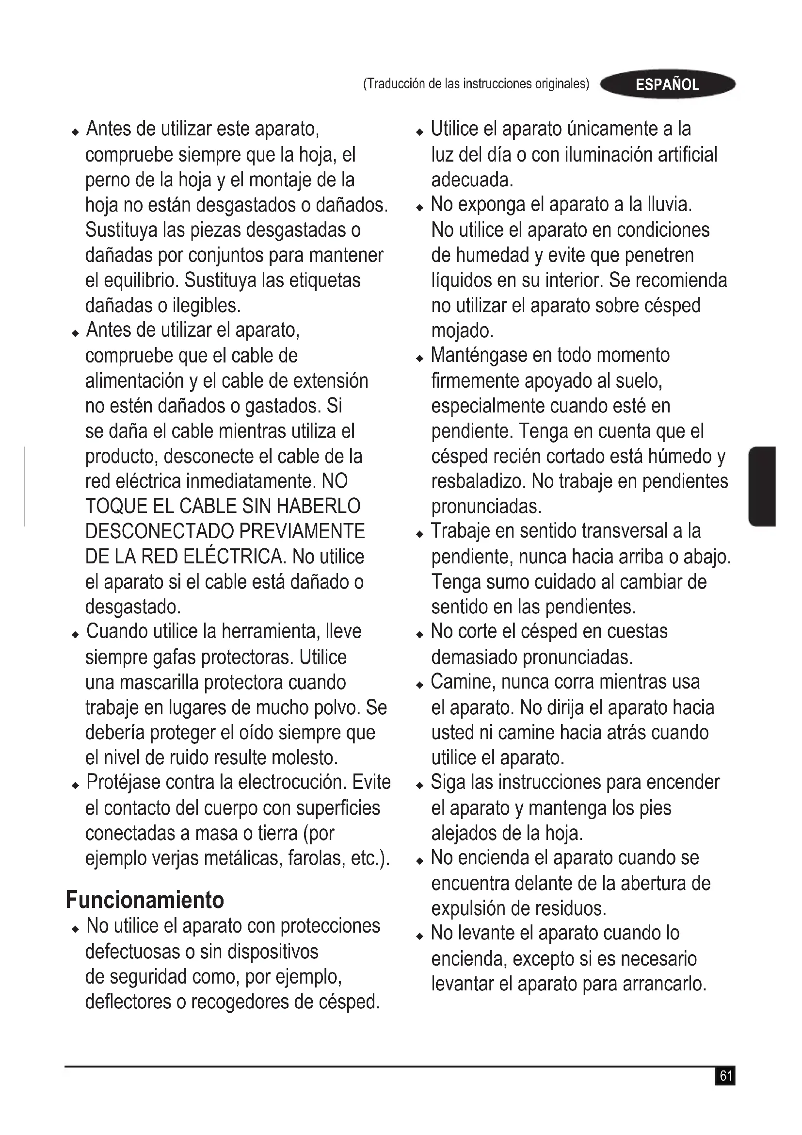 DESCONECTADO PREVIAMENTE DE LA RED ELÉCTRICA. No utilice el aparato si el cable está dañado o desgastado. u Cuando utilice la herramienta, lleve siempre gafas protectoras. Utilice una mascarilla protectora cuando trabaje en lugares de mucho polvo. Se debería proteger el oído siempre que el nivel de ruido resulte molesto. u Protéjase contra la electrocución. Evite el contacto del cuerpo con supercies conectadas a masa o tierra (por ejemplo verjas metálicas, farolas, etc.). Funcionamiento u No utilice el aparato con protecciones defectuosas o sin dispositivos de seguridad como, por ejemplo, deectores o recogedores de césped. u Utilice el aparato únicamente a la luz del día o con iluminación articial adecuada. u No exponga el aparato a la lluvia. No utilice el aparato en condiciones de humedad y evite que penetren líquidos en su interior. Se recomienda no utilizar el aparato sobre césped mojado. u Manténgase en todo momento rmemente apoyado al suelo, especialmente cuando esté en pendiente. Tenga en cuenta que el césped recién cortado está húmedo y resbaladizo. No trabaje en pendientes pronunciadas. u Trabaje en sentido transversal a la pendiente, nunca hacia arriba o abajo. Tenga sumo cuidado al cambiar de sentido en las pendientes. u No corte el césped en cuestas demasiado pronunciadas. u Camine, nunca corra mientras usa el aparato. No dirija el aparato hacia usted ni camine hacia atrás cuando utilice el aparato. u Siga las instrucciones para encender el aparato y mantenga los pies alejados de la hoja. u No encienda el aparato cuando se encuentra delante de la abertura de expulsión de residuos. u No levante el aparato cuando lo encienda, excepto si es necesario levantar el aparato para arrancarlo.62 (Traducción de las instrucciones originales) ESPAÑOL En ese caso, no levante el aparato más de lo imprescindiblemente necesario y levante sólo la parte que esté lejos del usuario. Asegúrese de mantener ambas manos en posición de trabajo antes de volver a dejar el aparato en el suelo. u Si debe levantar el aparato y transportarlo para atravesar supercies que no sean de césped o para dirigirse al área de trabajo, apague el aparato y espere a que las cuchillas se detengan por completo. u No levante ni transporte el aparato hasta que la hoja se detenga por completo. u Mantenga las manos y los pies apartados de la hoja. u No coloque las manos ni los pies cerca o debajo de piezas giratorias. u Manténgase alejado en todo momento de las aberturas de expulsión de residuos. u Antes de dejar el aparato sin vigilancia o de eliminar una obstrucción, o cuando se disponga a cambiar, limpiar o revisar alguna de sus piezas, apáguelo, desenchufe el cable de la toma de corriente y asegúrese de que las piezas móviles se han detenido por completo. Después de golpear un objeto extraño. Compruebe que la máquina no tenga daños, si lo tiene repárelos antes de volver a ponerla en marcha y utilizarla. u Si el aparato empieza a vibrar de forma inusual o si choca con un objeto extraño, apague el aparato y desenchufe el cable de la toma de corriente. Compruebe los daños del aparado, sustituya o repare las piezas dañadas y je las piezas sueltas. u Tenga sumo cuidado en mantener el cable de alimentación lejos de la hoja. Tenga cuidado con la posición del cable en todo momento. u Después de apagar el aparato, el motor continuará en marcha durante unos segundos. No intente forzar la hoja para que se pare. Mantenimiento y almacenamiento u Antes de utilizar el aparato, compruebe que no tenga piezas dañadas ni defectuosas. Compruebe que las piezas móviles se encuentran correctamente alineadas y en buenas condiciones, que no hay piezas rotas, y que los dispositivos de protección e interruptores están en buenas condiciones, así como cualquier otro elemento que pudiera afectar al funcionamiento de la herramienta. Asegúrese de que el aparato funciona correctamente y realiza las funciones para las que ha sido diseñado. No utilice el aparato con protecciones o cierres dañados ni mal colocados. No utilice el aparato si presenta alguna pieza dañada o defectuosa. No utilice el aparato si no es posible encenderlo y apagarlo con el interruptor.63 (Traducción de las instrucciones originales) ESPAÑOL Solicite al servicio técnico autorizado la reparación o sustitución de las piezas dañadas o defectuosas. u Compruebe con regularidad que el cable no ha sufrido daños. Si se llegase a dañar el cable, deberá ser sustituido por un agente autorizado para evitar cualquier situación de riesgo. Inspeccione los cables de extensión periódicamente. Si el cable de extensión está dañado o es defectuoso, sustitúyalo inmediatamente. u Mantenga todas las tuercas, pernos y tornillos del aparato apretados para asegurar unas condiciones de trabajo seguras. u Compruebe que el recolector de hierba no está dañado o desgastado y sustitúyalo si es necesario. No utilice nunca el aparato sin este recolector. u Tenga cuidado durante el ajuste del aparato para evitar que se le enganchen los dedos entre las hojas en movimiento y las piezas jas del aparato. u Cuando revise las cuchillas tenga cuidado porque, aunque la fuente de alimentación esté desconectada, aún se pueden mover. u Cuando no lo utilice, guarde el aparato en un lugar seco. Los niños no deben tener acceso a los aparatos guardados. u Deje enfriar siempre el aparato antes de guardarlo. u Asegúrese de que sólo se utilizan los repuestos de corte del tipo correcto. u Utilice únicamente piezas de repuesto y accesorios recomendados por BLACK+DECKER. Instrucciones de seguridad adicionales para cortacéspedes u Utilice siempre un cable de prolongación aprobado que sea adecuado para la entrada de corriente de esta herramienta (consulte los datos técnicos). El cable de prolongación debe ser adecuado para su uso en exteriores y presentar las indicaciones oportunas. Se puede utilizar un cable de prolongación HO5VV-F de 1.5 mm2 y de hast