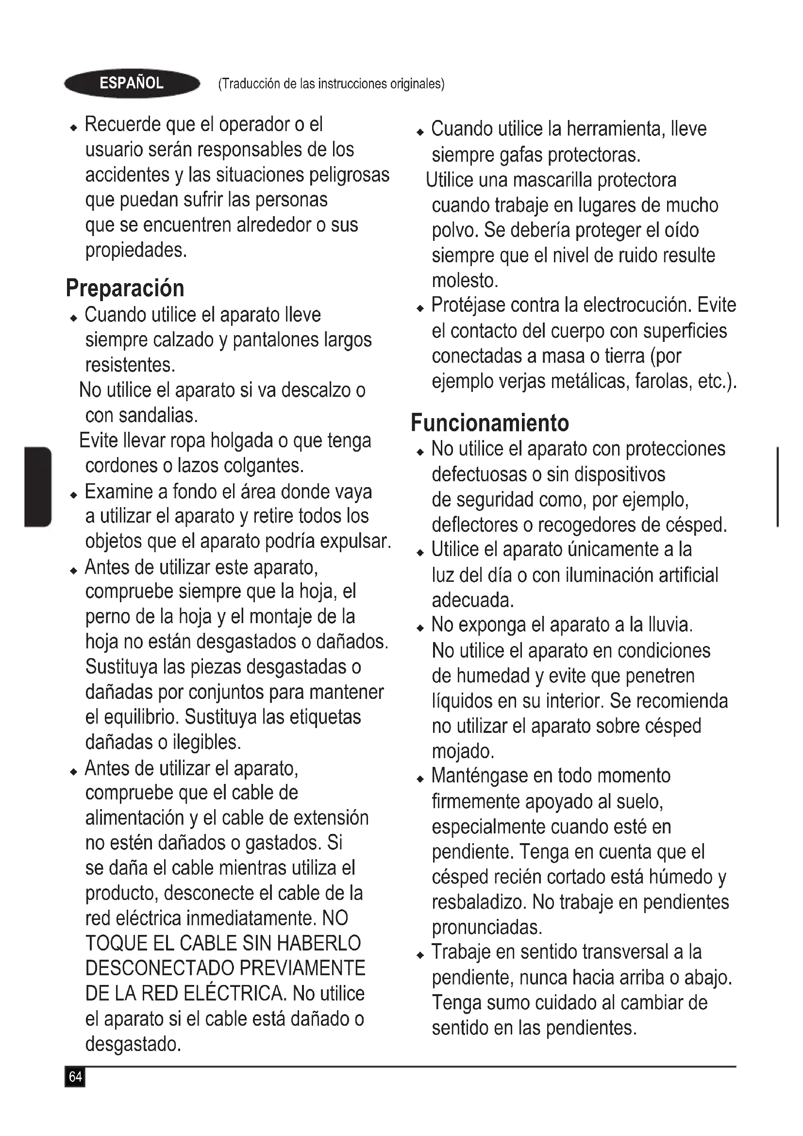 DESCONECTADO PREVIAMENTE DE LA RED ELÉCTRICA. No utilice el aparato si el cable está dañado o desgastado. u Cuando utilice la herramienta, lleve siempre gafas protectoras. Utilice una mascarilla protectora cuando trabaje en lugares de mucho polvo. Se debería proteger el oído siempre que el nivel de ruido resulte molesto. u Protéjase contra la electrocución. Evite el contacto del cuerpo con supercies conectadas a masa o tierra (por ejemplo verjas metálicas, farolas, etc.). Funcionamiento u No utilice el aparato con protecciones defectuosas o sin dispositivos de seguridad como, por ejemplo, deectores o recogedores de césped. u Utilice el aparato únicamente a la luz del día o con iluminación articial adecuada. u No exponga el aparato a la lluvia. No utilice el aparato en condiciones de humedad y evite que penetren líquidos en su interior. Se recomienda no utilizar el aparato sobre césped mojado. u Manténgase en todo momento rmemente apoyado al suelo, especialmente cuando esté en pendiente. Tenga en cuenta que el césped recién cortado está húmedo y resbaladizo. No trabaje en pendientes pronunciadas. u Trabaje en sentido transversal a la pendiente, nunca hacia arriba o abajo. Tenga sumo cuidado al cambiar de sentido en las pendientes.65 (Traducción de las instrucciones originales) ESPAÑOL u No corte el césped en cuestas demasiado pronunciadas. u Camine, nunca corra mientras usa el aparato. No dirija el aparato hacia usted ni camine hacia atrás cuando utilice el aparato. u Siga las instrucciones para encender el aparato y mantenga los pies alejados de la hoja. u No encienda el aparato cuando se encuentra delante de la abertura de expulsión de residuos. u No levante el aparato cuando lo encienda, excepto si es necesario levantar el aparato para arrancarlo. En ese caso, no levante el aparato más de lo imprescindiblemente necesario y levante sólo la parte que esté lejos del usuario. Asegúrese de mantener ambas manos en posición de trabajo antes de volver a dejar el aparato en el suelo. u Si debe levantar el aparato y transportarlo para atravesar supercies que no sean de césped o para dirigirse al área de trabajo, apague el aparato y espere a que las cuchillas se detengan por completo. u No levante ni transporte el aparato hasta que la hoja se detenga por completo. u Mantenga las manos y los pies apartados de la hoja. u No coloque las manos ni los pies cerca o debajo de piezas giratorias. u Manténgase alejado en todo momento de las aberturas de expulsión de residuos. u Antes de dejar el aparato sin vigilancia o de eliminar una obstrucción, o cuando se disponga a cambiar, limpiar o revisar alguna de sus piezas, apáguelo, desenchufe el cable de la toma de corriente y asegúrese de que las piezas móviles se han detenido por completo. Después de golpear un objeto extraño. Compruebe que la máquina no tenga daños, si lo tiene repárelos antes de volver a ponerla en marcha y utilizarla. u Si el aparato empieza a vibrar de forma inusual o si choca con un objeto extraño, apague el aparato y desenchufe el cable de la toma de corriente. Compruebe los daños del aparado, sustituya o repare las piezas dañadas y je las piezas sueltas. u Tenga sumo cuidado en mantener el cable de alimentación lejos de la hoja. Tenga cuidado con la posición del cable en todo momento. u Después de apagar el aparato, el motor continuará en marcha durante unos segundos. No intente forzar la hoja para que se pare. Mantenimiento y almacenamiento u Antes de utilizar el aparato, compruebe que no tenga piezas dañadas ni defectuosas.66 (Traducción de las instrucciones originales) ESPAÑOL Compruebe que las piezas móviles se encuentran correctamente alineadas y en buenas condiciones, que no hay piezas rotas, y que los dispositivos de protección e interruptores están en buenas condiciones, así como cualquier otro elemento que pudiera afectar al funcionamiento de la herramienta. Asegúrese de que el aparato funciona correctamente y realiza las funciones para las que ha sido diseñado. No utilice el aparato con protecciones o cierres dañados ni mal colocados. No utilice el aparato si presenta alguna pieza dañada o defectuosa. No utilice el aparato si no es posible encenderlo y apagarlo con el interruptor. Solicite al servicio técnico autorizado la reparación o sustitución de las piezas dañadas o defectuosas. u Compruebe con regularidad que el cable no ha sufrido daños. Si se llegase a dañar el cable, deberá ser sustituido por un agente autorizado para evitar cualquier situación de riesgo. Inspeccione los cables de extensión periódicamente. Si el cable de extensión está dañado o es defectuoso, sustitúyalo inmediatamente. u Mantenga todas las tuercas, pernos y tornillos del aparato apretados para asegurar unas condiciones de trabajo seguras. u Compruebe que el recolector de hierba no está dañado o desgastado y sustitúyalo si es necesario. No utilice nunca el aparato sin este recolector. u Tenga cuidado durante el ajuste del aparato para evitar que se le enganchen los dedos entre las hojas en movimiento y las piezas jas del aparato. u Cuando revise las cuchillas tenga cuidado porque, aunque la fuente de alimentación esté desconectada, aún se pueden mover. u Cuando no lo utilice, guarde el aparato en un lugar seco. Los niños no deben tener acceso a los aparatos guardados. u Deje enfriar siempre el aparato antes de guardarlo. u Asegúrese de que sólo se utilizan los repuestos de corte del tipo correcto. u Utilice únicamente piezas de repuesto y accesorios recomendados por BLACK+DECKER. Instrucciones de seguridad adicionales para cortacéspedes u Utilice siempre un cable de prolongación aprobado que sea adecuado para la entrada de corriente de esta herramienta (consulte los datos técnicos). El cable de prolongación debe ser adecuado para su uso en exteriores y presentar las indicaciones oportunas. Se puede utilizar un cable de prolongación HO5VV-F de 1.5 mm2 y de hast