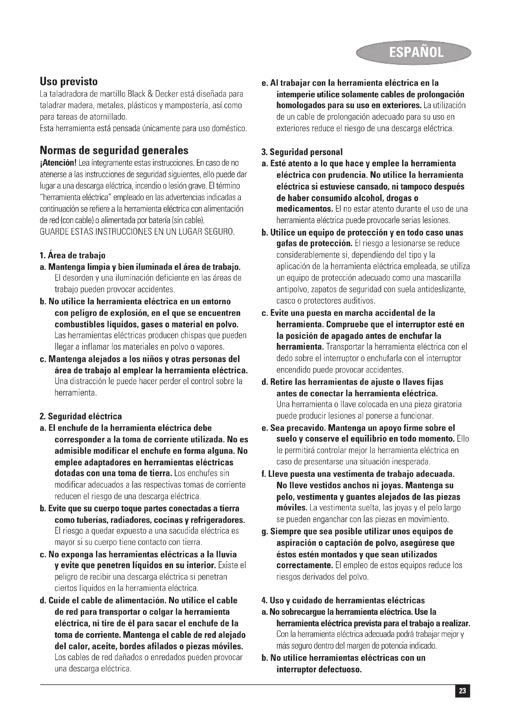 (incertidumbre de potencia acústica) 3 dB(A) Kevin Hewitt Director de Ingeniería del Consumidor Spennymoor, County Durham DL16 6JG, Reino Unido 1-9-200527 Garantía Black & Decker confía plenamente en la calidad de sus productos y ofrece una garantía extraordinaria. Esta declaración de garantía es una añadido, y en ningún caso un perjuicio para sus derechos estatutarios. La garantía es válida dentro de los territorios de los Estados Miembros de la Unión Europea y de los de la Zona Europea de Libre Comercio. Si un producto Black & Decker resultará defectuoso debido a materiales o mano de obra defectuosos o a la falta de conformidad, Black & Decker garantiza, dentro de los 24 meses de la fecha de compra, la sustitución de las piezas defectuosas, la reparación de los productos sujetos a un desgaste y rotura razonables o la sustitución de tales productos para garantizar al cliente el mínimo de inconvenientes, a menos que: ◆ El producto haya sido utilizado con propósitos comerciales, profesionales o de alquiler; ◆ El producto haya sido sometido a un uso inadecuado o negligente; ◆ El producto haya sufrido daños causados por objetos o sustancias extrañas o accidentes; ◆ Se hayan realizado reparaciones por parte de personas que no sean los servicios de reparación autorizados o personal de servicios de Black & Decker; Para reclamar en garantía, será necesario que presente la prueba de compra al vendedor o al servicio técnico de reparaciones autorizado. Pueden consultar la dirección de su servicio técnico más cercano poniéndose en contacto con la oficina local de Black & Decker en la dirección que se indica en este manual. Como alternativa, se puede consultar en Internet, en la dirección siguiente, la lista de servicios técnicos autorizados e información completa de nuestros servicios de postventa y contactos: www.2helpU.com. Regístrese en nuestro sitio Web www.blackanddecker.com para mantenerse al día sobre nuestros productos y ofertas especiales. Encontrará información adicional sobre la marca Black & Decker y nuestra gama de productos en www.blackanddecker.com.28 PORTUGUÊS Utilização O seu berbequim Black & Decker foi concebido para perfurar madeira, metal, plástico e maçonaria, assim como para fins de aparafusamento. Esta ferramenta destina-se apenas ao doméstico. Regras gerais de segurança Advertência! Leia todas as instruções. O não cumprimento das instruções a seguir podem causar choque eléctrico, incêndio e/ ou graves lesões. O termo “ferramenta eléctrica” utilizado a seguir refere-se a ferramentas eléctricas com ligação à corrente eléctrica (com fios) ou operadas a bateria (sem fios). GUARDE BEM ESTAS INSTRUÇÕES.