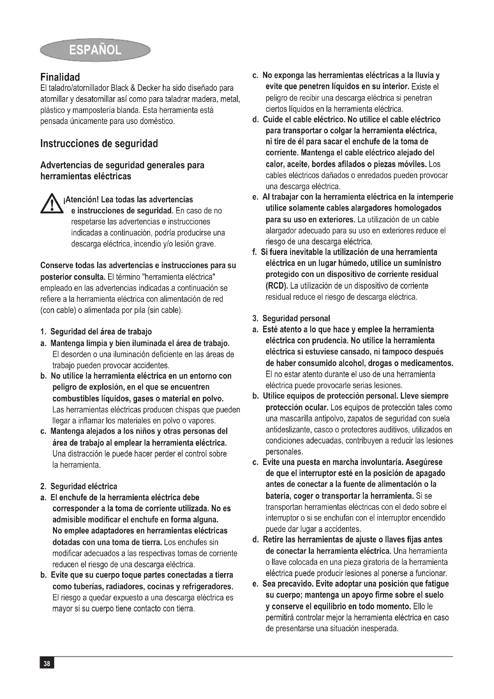 con la marca (17). Deslice el selector de dos marchas (5) hacia la parte frontal de la herramienta (2ª marcha). Selector de dos marchas (fig. G) Para taladrar acero y para trabajos de atornillado, deslice el selector de dos marchas (5) hacia la parte posterior de la herramienta (1ª marcha). Para taladrar materiales que no sean de acero, deslice el selector de dos marchas (5) hacia la parte delantera de la herramienta (2ª marcha). Taladrado/atornillado Seleccione la rotación directa o inversa usando la guía de deslizamiento de avance/retroceso (2). Para encender la herramienta, presione el interruptor (1). La velocidad de la herramienta dependerá de hasta dónde pulse el interruptor. Para apagar la herramienta, suelte el interruptor. Consejos para un uso óptimo Perforación Aplique siempre una suave presión en línea recta con la broca. Justo antes de que la punta de la broca atraviese la pieza de trabajo, disminuya la presión sobre la herramienta. Use un bloque de madera como soporte de piezas de trabajo que puedan astillarse. Use brocas de pala para taladrar agujeros de gran diámetro en madera. Use brocas de acero rápido (HSS) para taladrar metal. Use brocas de mampostería para taladrar mampostería blanda. Use un lubricante para taladrar metales distintos del hierro fundido y el latón. Haga una marca con un punzón de perforar en el centro del orificio que desea taladrar para mayor precisión. Atornillado Use siempre el tipo y el tamaño adecuado de punta. Si le resulta difícil apretar los tornillos, intente aplicar una pequeña cantidad de jabón o líquido jabonoso como lubricante. Sujete siempre la herramienta y la punta en línea recta con el tornillo. Mantenimiento Su herramienta Black & Decker está diseñada para que funcione durante un largo período de tiempo con un mantenimiento mínimo. El funcionamiento satisfactorio continuado depende de un cuidado apropiado y una limpieza periódica de la herramienta. Su cargador no requiere ningún mantenimiento aparte de una limpieza periódica. ¡Atención! Antes de efectuar cualquier mantenimiento en la herramienta, retire la batería de la herramienta. Desenchufe el cargador antes de limpiarlo. Limpie periódicamente las ranuras de ventilación de la herramienta y del cargador con un cepillo suave o un paño seco.43 ESPAÑOL Limpie periódicamente la carcasa del motor con un paño húmedo. No utilice ninguna sustancia limpiadora abrasiva o que contenga disolventes. Abra periódicamente el portabrocas y golpéelo suavemente para extraer el polvo del interior. Protección del medio ambiente
