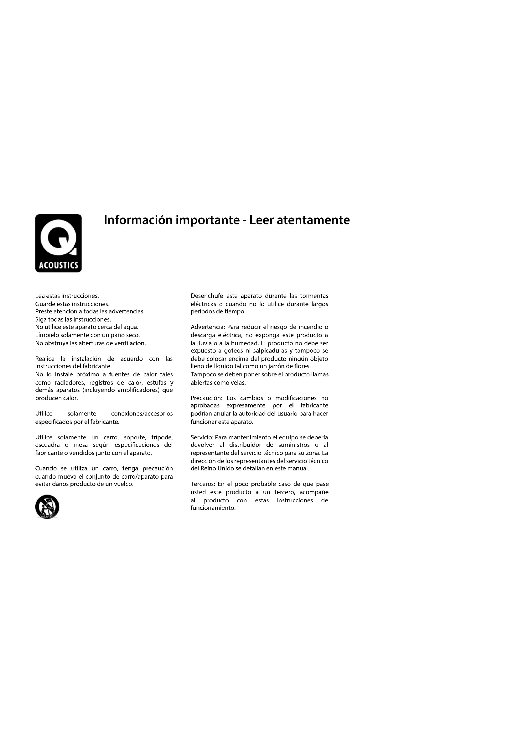 2.3kHz 170mm x 955mm x 285mm 390mm x 980mm x 305mm 18.5kgES Manual del usuario y especicaciones del producto Concept SeriesLea estas instrucciones. Guarde estas instrucciones. Preste atención a todas las advertencias. Siga todas las instrucciones. No utilice este aparato cerca del agua. Límpielo solamente con un paño seco. No obstruya las aberturas de ventilación. Realice la instalación de acuerdo con las instrucciones del fabricante. No lo instale próximo a fuentes de calor tales como radiadores, registros de calor, estufas y demás aparatos (incluyendo amplicadores) que producen calor. Utilice solamente conexiones/accesorios especicados por el fabricante. Utilice solamente un carro, soporte, trípode, escuadra o mesa según especicaciones del fabricante o vendidos junto con el aparato. Cuando se utiliza un carro, tenga precaución cuando mueva el conjunto de carro/aparato para evitar daños producto de un vuelco. Desenchufe este aparato durante las tormentas eléctricas o cuando no lo utilice durante largos períodos de tiempo. Advertencia: Para reducir el riesgo de incendio o descarga eléctrica, no exponga este producto a la lluvia o a la humedad. El producto no debe ser expuesto a goteos ni salpicaduras y tampoco se debe colocar encima del producto ningún objeto lleno de líquido tal como un jarrón de ores. Tampoco se deben poner sobre el producto llamas abiertas como velas. Precaución: Los cambios o modicaciones no aprobadas expresamente por el fabricante podrían anular la autoridad del usuario para hacer funcionar este aparato. Servicio: Para mantenimiento el equipo se debería devolver al distribuidor de suministros o al representante del servicio técnico para su zona. La dirección de los representantes del servicio técnico del Reino Unido se detallan en este manual. Terceros: En el poco probable caso de que pase usted este producto a un tercero, acompañe al producto con estas instrucciones de funcionamiento. Información importante - Leer atentamenteIntroducción Q Acoustics Concept Series es una gama de altavoces diseñados para satisfacer las más altas expectativas de los acionados a la música de 2 canales y de los apasionados a las películas exigentes. La gama se compone de: Concept 20: Altavoz estantería compacto con un controlador de graves de 125mm. Concept 40: Soporte de suelo con dos controladores de graves de 125mm. Antes de realizar ninguna conexión a sus altavoces, asegúrese de que todas las unidades activas en su sistema se encuentran desconectadas de la red. Cuando ponga en marcha su sistema de sonido o fuentes de entrada cambiantes, coloque el control principal del volumen a un nivel bajo. Suba el nivel gradualmente. NUNCA haga funcionar su sistema de sonido a todo volumen. La posición del control de volumen es engañosa y no indica el nivel de potencia del sistema. Utilizar conguraciones de volumen alto puede dañar su oído. NO conecte los terminales de su altavoz al suministro de la red. Q Acoustics Concept Series NO exponga sus altavoces a frío, calor, humedad o luz solar excesivos. Si hace funcionar sus altavoces sin sus rejillas, tenga la precaución de proteger de daños los controladores. NO utilice soportes provisionales. Coloque el soporte aprobado por Q Acoustics de acuerdo con las instrucciones y utilice los accesorios suministrados. Su distribuidor le aconsejará. NO desmonte el altavoz. Invalidará la garantía. Desembalar sus altavoces Desembale totalmente las cajas. Levante los altavoces del embalaje sujetando las cajas. No utilice las bolsas de plástico para levantarlos. Los Concept 40 son pesados - busque ayuda para levantarlos, si fuese necesario. Cuando manipule los altavoces, no los arrastre por el suelo puesto que esto podría causar daños - levántelos antes de desplazarlos. Dentro de la caja encontrará: El/los altavoz/altavoces y este manual del producto. Compruebe el producto detenidamente. Si algún artículo está dañado o falta, informe de ello a su distribuidor lo antes posible. Conserve el embalaje para un transporte futuro. Si se deshace del embalaje, hágalo siguiendo toda la normativa sobre reciclado en su zona.Colocar los soportes del suelo y los apoyos cónicos - Concept 40 Preparación