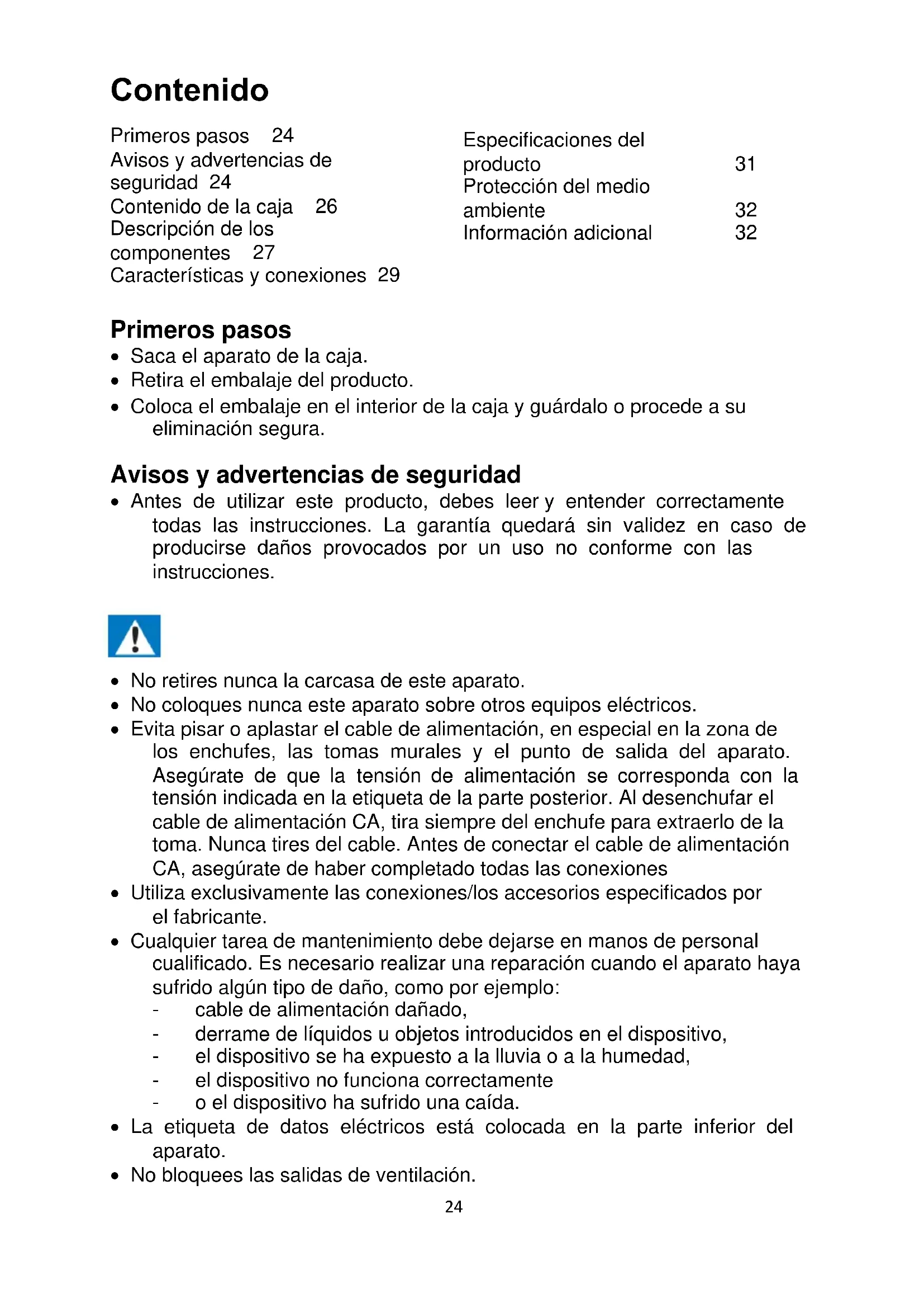 Contenido Primeros pasos 24 Avisos y advertencias de seguridad 24 Contenido de la caja 26 Descripción de los componentes 27 Características y conexiones 29 Primeros pasos