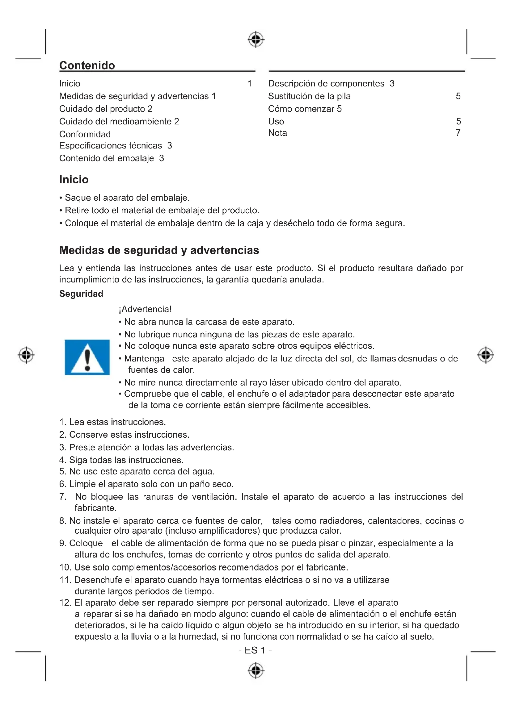 Contenido Inicio 1 Medidas de seguridad y advertencias 1 Cuidado del producto 2 Cuidado del medioambiente 2 Conformidad Especicaciones técnicas 3 Contenido del embalaje 3 Descripción de componentes 3 Sustitución de la pila Cómo comenzar 5 Uso 5 Nota Inicio