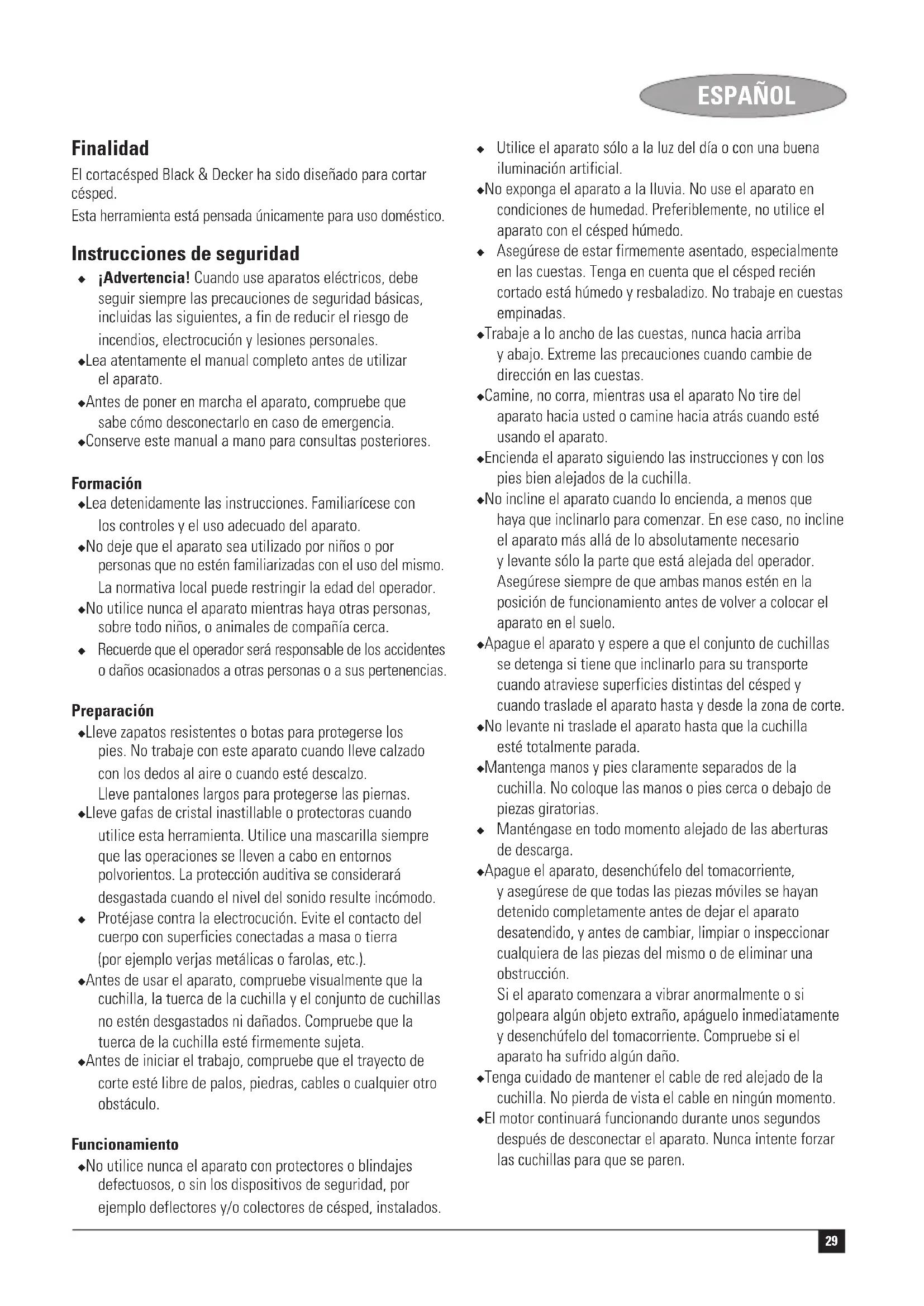 Kevin Hewitt Director of Consumer Engineering Spennymoor, County Durham DL16 6JG, Verenigd Koninkrijk 1-8-2004 Garantie Black & Decker heeft vertrouwen in zijn producten en biedt een uitstekende garantie. Deze garantiebepalingen vormen een aanvulling op uw wettelijke rechten en beperken deze niet. De garantie geldt in de lidstaten van de Europese Unie en de Europese Vrijhandelsassociatie. Mocht uw Black & Decker product binnen 24 maanden na datum van aankoop defect raken tengevolge van materiaal- of constructiefouten, dan garanderen wij de kosteloze vervanging van defecte onderdelen, de reparatie van het product of de vervanging van het product, tenzij: ◆ Het product is gebruikt voor handelsdoeleinden, professionele toepassingen of verhuurdoeleinden; ◆ Het product onoordeelkundig is gebruikt; ◆ Het product is beschadigd door invloeden van buitenaf of door een ongeval; ◆ Reparaties zijn uitgevoerd door anderen dan onze servicecentra of Black & Decker personeel. Om een beroep op de garantie te doen, dient u een aankoopbewijs te overhandigen aan de verkoper of een van onze servicecentra. U kunt het adres van het dichtstbijzijnde servicecentrum opvragen via de adressen op de achterzijde van deze handleiding. U kunt ook een lijst van onze servicecentra en meer informatie m.b.t. onze klantenservice vinden op het volgende Internet-adres: www.2helpU.com Meld u aan op onze website www.blackanddecker.nl om te worden geïnformeerd over nieuwe producten en speciale aanbiedingen. Verdere informatie over het merk Black & Decker en onze producten vindt u op www.blackanddecker.nl29 ESPAÑOL Finalidad El cortacésped Black & Decker ha sido diseñado para cortar césped. Esta herramienta está pensada únicamente para uso doméstico. Instrucciones de seguridad ◆ ¡Advertencia! Cuando use aparatos eléctricos, debe seguir siempre las precauciones de seguridad básicas, incluidas las siguientes, a fin de reducir el riesgo de incendios, electrocución y lesiones personales. ◆ Lea atentamente el manual completo antes de utilizar el aparato. ◆ Antes de poner en marcha el aparato, compruebe que sabe cómo desconectarlo en caso de emergencia. ◆ Conserve este manual a mano para consultas posteriores. Formación ◆ Lea detenidamente las instrucciones. Familiarícese con los controles y el uso adecuado del aparato. ◆ No deje que el aparato sea utilizado por niños o por personas que no estén familiarizadas con el uso del mismo. La normativa local puede restringir la edad del operador. ◆ No utilice nunca el aparato mientras haya otras personas, sobre todo niños, o animales de compañía cerca. ◆ Recuerde que el operador será responsable de los accidentes o daños ocasionados a otras personas o a sus pertenencias. Preparación ◆ Lleve zapatos resistentes o botas para protegerse los pies. No trabaje con este aparato cuando lleve calzado con los dedos al aire o cuando esté descalzo. Lleve pantalones largos para protegerse las piernas. ◆ Lleve gafas de cristal inastillable o protectoras cuando utilice esta herramienta. Utilice una mascarilla siempre que las operaciones se lleven a cabo en entornos polvorientos. La protección auditiva se considerará desgastada cuando el nivel del sonido resulte incómodo. ◆ Protéjase contra la electrocución. Evite el contacto del cuerpo con superficies conectadas a masa o tierra (por ejemplo verjas metálicas o farolas, etc.). ◆ Antes de usar el aparato, compruebe visualmente que la cuchilla, la tuerca de la cuchilla y el conjunto de cuchillas no estén desgastados ni dañados. Compruebe que la tuerca de la cuchilla esté firmemente sujeta. ◆ Antes de iniciar el trabajo, compruebe que el trayecto de corte esté libre de palos, piedras, cables o cualquier otro obstáculo. Funcionamiento ◆ No utilice nunca el aparato con protectores o blindajes defectuosos, o sin los dispositivos de seguridad, por ejemplo deflectores y/o colectores de césped, instalados. ◆ Utilice el aparato sólo a la luz del día o con una buena iluminación artificial. ◆ No exponga el aparato a la lluvia. No use el aparato en condiciones de humedad. Preferiblemente, no utilice el aparato con el césped húmedo. ◆ Asegúrese de estar firmemente asentado, especialmente en las cuestas. Tenga en cuenta que el césped recién cortado está húmedo y resbaladizo. No trabaje en cuestas empinadas. ◆ Trabaje a lo ancho de las cuestas, nunca hacia arriba y abajo. Extreme las precauciones cuando cambie de dirección en las cuestas. ◆ Camine, no corra, mientras usa el aparato No tire del aparato hacia usted o camine hacia atrás cuando esté usando el aparato. ◆ Encienda el aparato siguiendo las instrucciones y con los pies bien alejados de la cuchilla. ◆ No incline el aparato cuando lo encienda, a menos que haya que inclinarlo para comenzar. En ese caso, no incline el aparato más allá de lo absolutamente necesario y levante sólo la parte que está alejada del operador. Asegúrese siempre de que ambas manos estén en la posición de funcionamiento antes de volver a colocar el aparato en el suelo. ◆ Apague el aparato y espere a que el conjunto de cuchillas se detenga si tiene que inclinarlo para su transporte cuando atraviese superficies distintas del césped y cuando traslade el aparato hasta y desde la zona de corte. ◆ No levante ni traslade el aparato hasta que la cuchilla esté totalmente parada. ◆ Mantenga manos y pies claramente separados de la cuchilla. No coloque las manos o pies cerca o debajo de piezas giratorias. ◆ Manténgase en todo momento alejado de las aberturas de descarga. ◆ Apague el aparato, desenchúfelo del tomacorriente, y asegúrese de que todas las piezas móviles se hayan detenido completamente antes de dejar el aparato desatendido, y antes de cambiar, limpiar o inspeccionar cualquiera de las piezas del mismo o de eliminar una obstrucción. Si el aparato comenzara a vibrar anormalmente o si golpeara algún objeto extraño, apáguelo inme