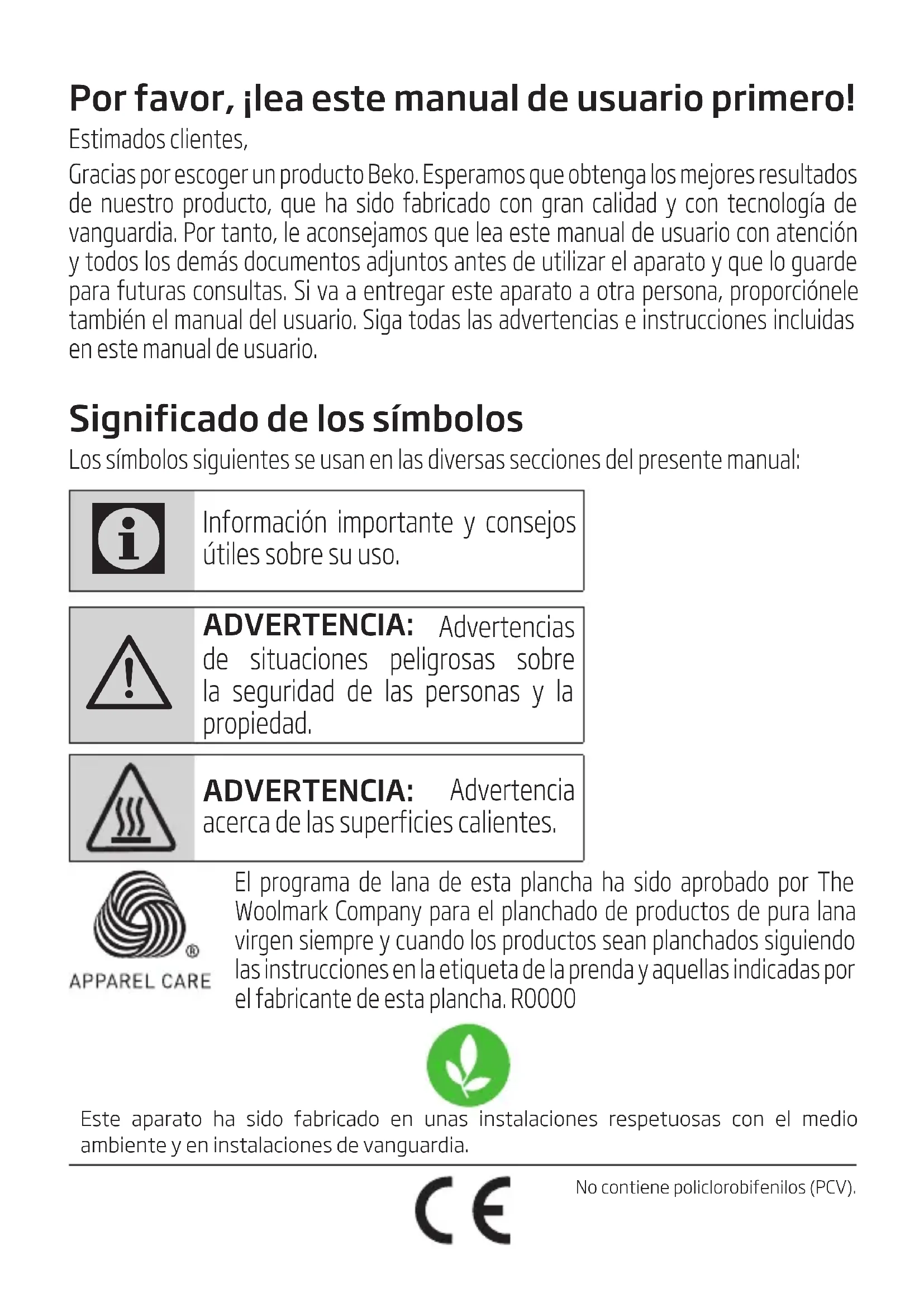 ADVERTENCIA: Advertencias de situaciones peligrosas sobre la seguridad de las personas y la propiedad. ADVERTENCIA: Advertencia acerca de las superficies calientes. El programa de lana de esta plancha ha sido aprobado por The Woolmark Company para el planchado de productos de pura lana virgen siempre y cuando los productos sean planchados siguiendo las instrucciones en la etiqueta de la prenda y aquellas indicadas por el fabricante de esta plancha. R0000 No contiene policlorobifenilos (PCV).Este aparato ha sido fabricado en unas instalaciones respetuosas con el medio ambiente y en instalaciones de vanguardia.56 / ES Plancha al vapor / Manual de usuario Esta sección contiene instrucciones de seguridad que ayudarán a la protección contra los riesgos de lesiones personales o daño a la propiedad. El incumplimiento de estas instrucciones causará la pérdida de la garantía.