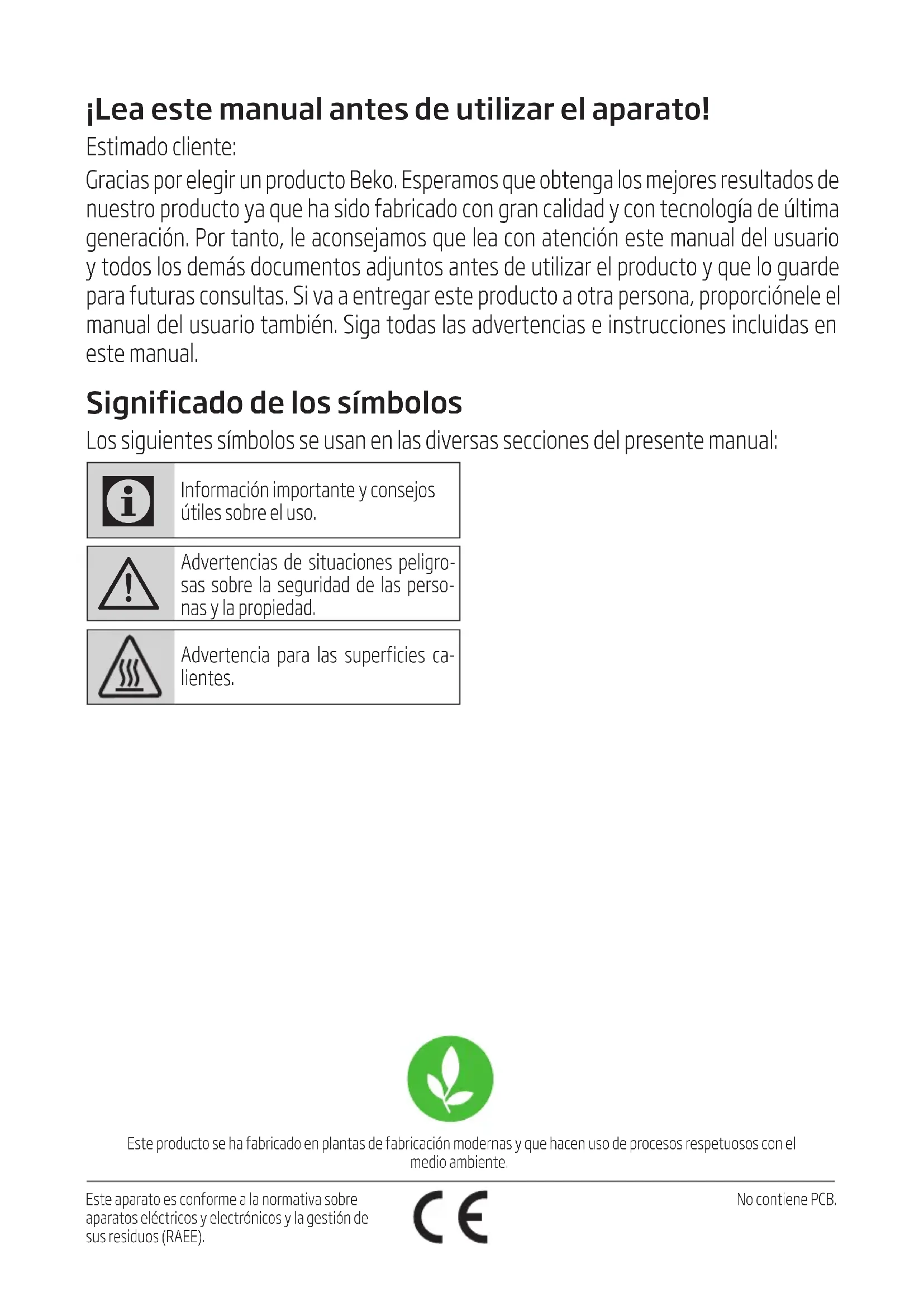 Prima di contattare l’assistenza tecnica, al fine di agevolare la gestione della chiamata, è necessario avere a portata di mano il modello del prodotto e il documento fiscale di acquisto.¡Lea este manual antes de utilizar el aparato! Estimado cliente: Gracias por elegir un producto Beko. Esperamos que obtenga los mejores resultados de nuestro producto ya que ha sido fabricado con gran calidad y con tecnología de última generación. Por tanto, le aconsejamos que lea con atención este manual del usuario y todos los demás documentos adjuntos antes de utilizar el producto y que lo guarde para futuras consultas. Si va a entregar este producto a otra persona, proporciónele el manual del usuario también. Siga todas las advertencias e instrucciones incluidas en este manual. Significado de los símbolos Los siguientes símbolos se usan en las diversas secciones del presente manual: