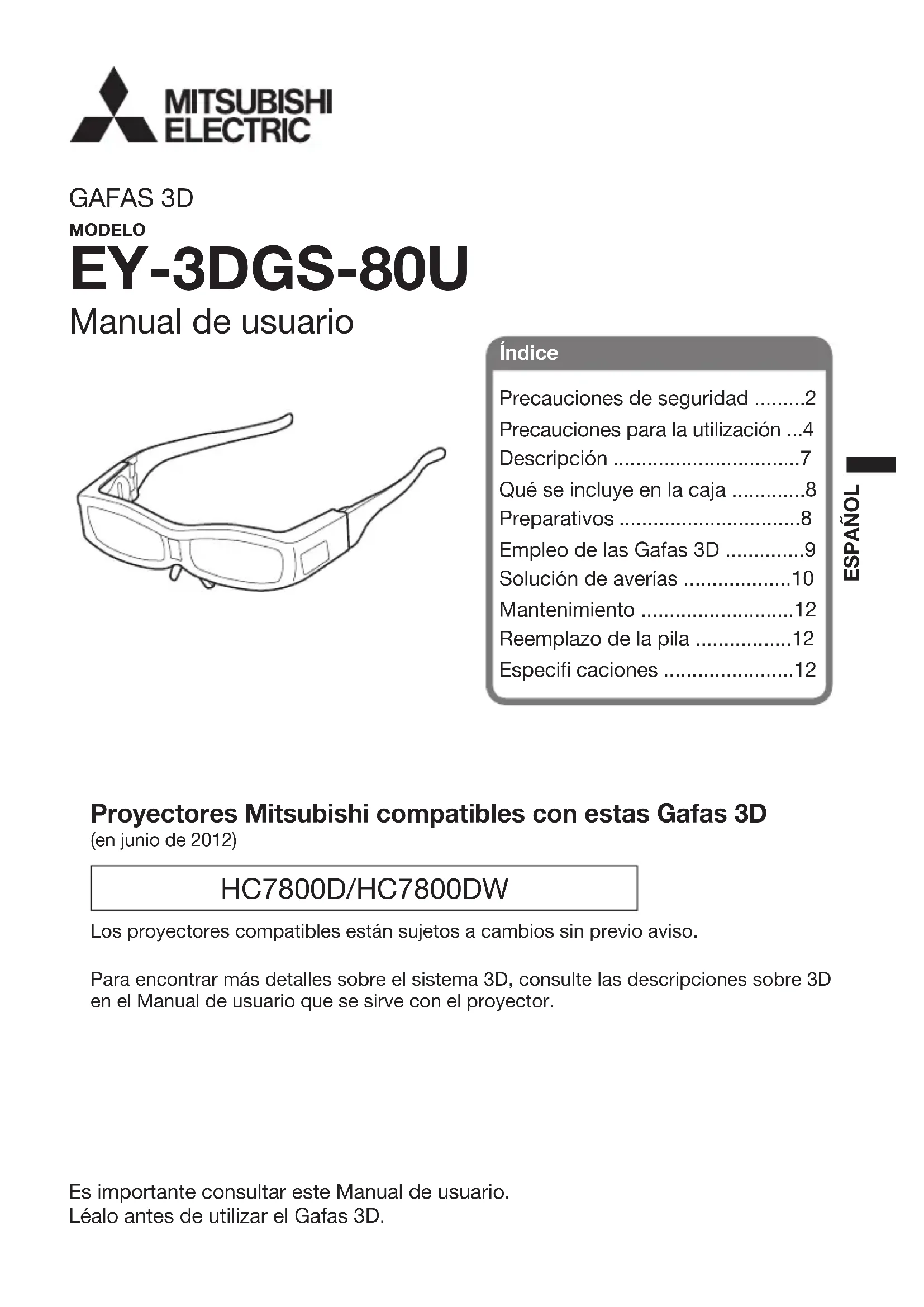 EY3DGS80U - Gafas 3D MITSUBISHI - Manual de uso y guía de instrucciones gratis