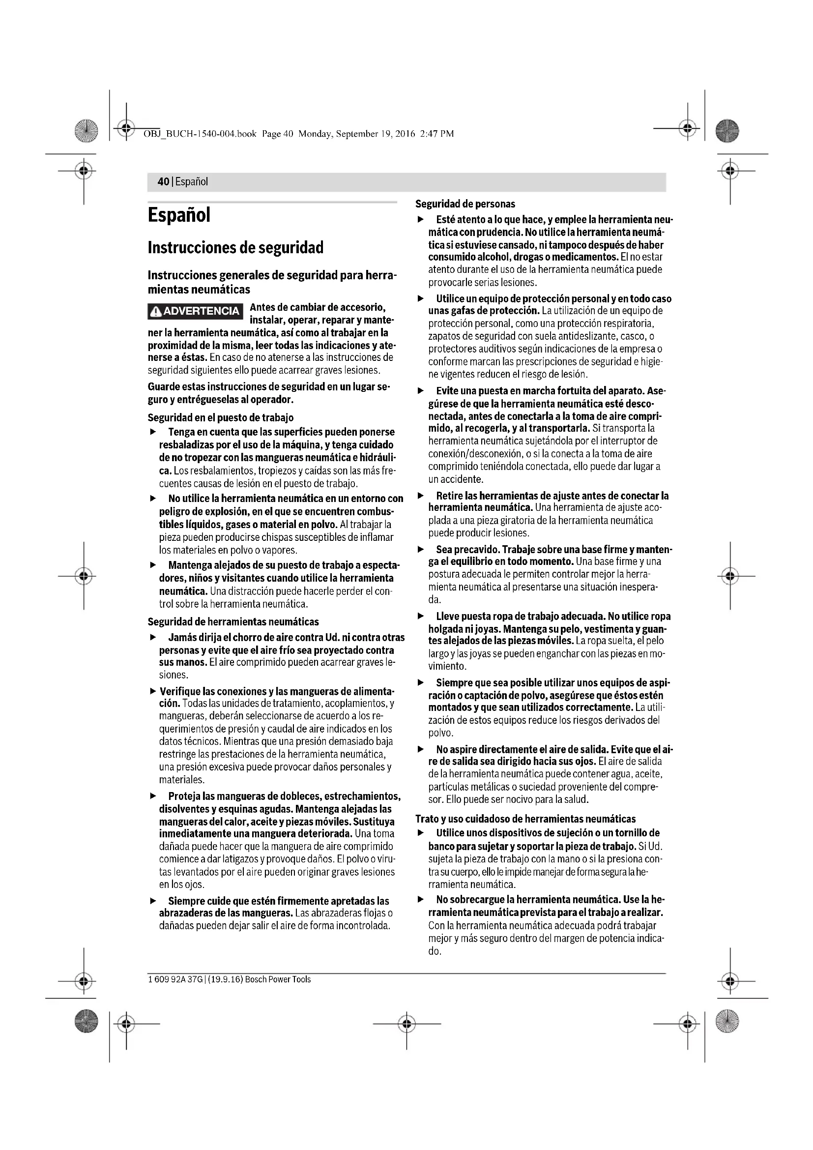 NPT Rosca Whitworth National pipe thread Rosca de conexión OBJ_BUCH-1540-004.book Page 42 Monday, September 19, 2016 2:47 PMEspañol | 43 Bosch Power Tools 1 609 92A 37G | (19.9.16) Descripción y prestaciones del pro- ducto Lea íntegramente estas advertencias de pe- ligro e instrucciones. En caso de no atenerse a las advertencias de peligro e instrucciones si- guientes, ello puede ocasionar una descarga eléctrica, un incendio y/o lesión grave. Despliegue y mantenga abierta la solapa con la imagen de la herramienta neumática mientras lee las instrucciones de ser- vicio. Utilización reglamentaria La herramienta neumática ha sido diseñada para taladrar en madera, metal, cerámica y plástico. Componentes principales La numeración de los componentes está referida a las imáge- nes en la página ilustrada. Algunas de las imágenes son repre- sentaciones esquemáticas que pueden diferir de su herra- mienta neumática. 1 Husillo de taladrar 2 Zona de agarre(p. ej. para una empuñadura adicional) 3 Interruptor de palanca para conexión/desconexión 4 Gancho 5 Boquilla de conexión 6 Entrecaras en husillo de taladrar 7 Interruptor de conexión/desconexión 8 Salida de aire con silenciador 9 Empuñadura adicional* 10 Ranuras para el estribo de suspensión 11 Abrazadera 12 Manguera de descarga de aire 13 Tornillo de sujeción de tapa de la carcasa 14 Tapa de la carcasa 15 Salida de aire con tuerca hexagonal 16 Junta anular 17 Kit para descarga de aire (descentralizada) 18 Racor de conexión en kit para descarga de aire 19 Silenciador en kit para descarga de aire 20 Racor de conexión en entrada de aire 21 Manguera de toma de aire 22 Manguera de descarga de aire centralizada 23 Portabrocas de corona dentada 24 Portabrocas de sujeción rápida 25 Llave del portabrocas 26 Alojamiento del útil 27 Casquillo posterior 28 Casquillo anterior 29 Selector de sentido de giro *Los accesorios descritos e ilustrados no corresponden al material que se adjunta de serie. La gama completa de accesorios opciona- les se detalla en nuestro programa de accesorios. Declaración de conformidad Declaramos bajo nuestra exclusiva responsabilidad que el producto descrito en los “Datos técnicos” cumple con todas las disposiciones correspondientes de las Directivas 2006/42/CE inclusive sus modificaciones y está en conformi- dad con las siguientes normas: EN ISO 11148-3. Expediente técnico (2006/42/CE) en: Robert Bosch Power Tools GmbH, PT/ETM9, 70538 Stuttgart, GERMANY Robert Bosch Power Tools GmbH70538 Stuttgart, GERMANYStuttgart, 01.01.2017 Datos técnicos Henk Becker Executive Vice President Engineering Helmut Heinzelmann Head of Product Certification PT/ETM9 0 607 153 5../0 607 154 101 Estas herramientas neumáticas pertenecen a la serie CLEAN. La técnica CLEAN de Bosch protege al operador y al ambiente ya que opera sin aceite y además por su menor consumo de ai- re y energía. Sin embargo, también es posible su operación con aire oleo- so. consumption optimized – consumo de aire optimizado lubrication free – libre de aceite ergonomic – ergonómica air tool – herramienta neumática noise reduction – ruido reducido OBJ_BUCH-1540-004.book Page 43 Monday, September 19, 2016 2:47 PM44 | Español 1 609 92A 37G | (19.9.16) Bosch Power Tools Taladradora neumática Recta Pistola Nº de artículo