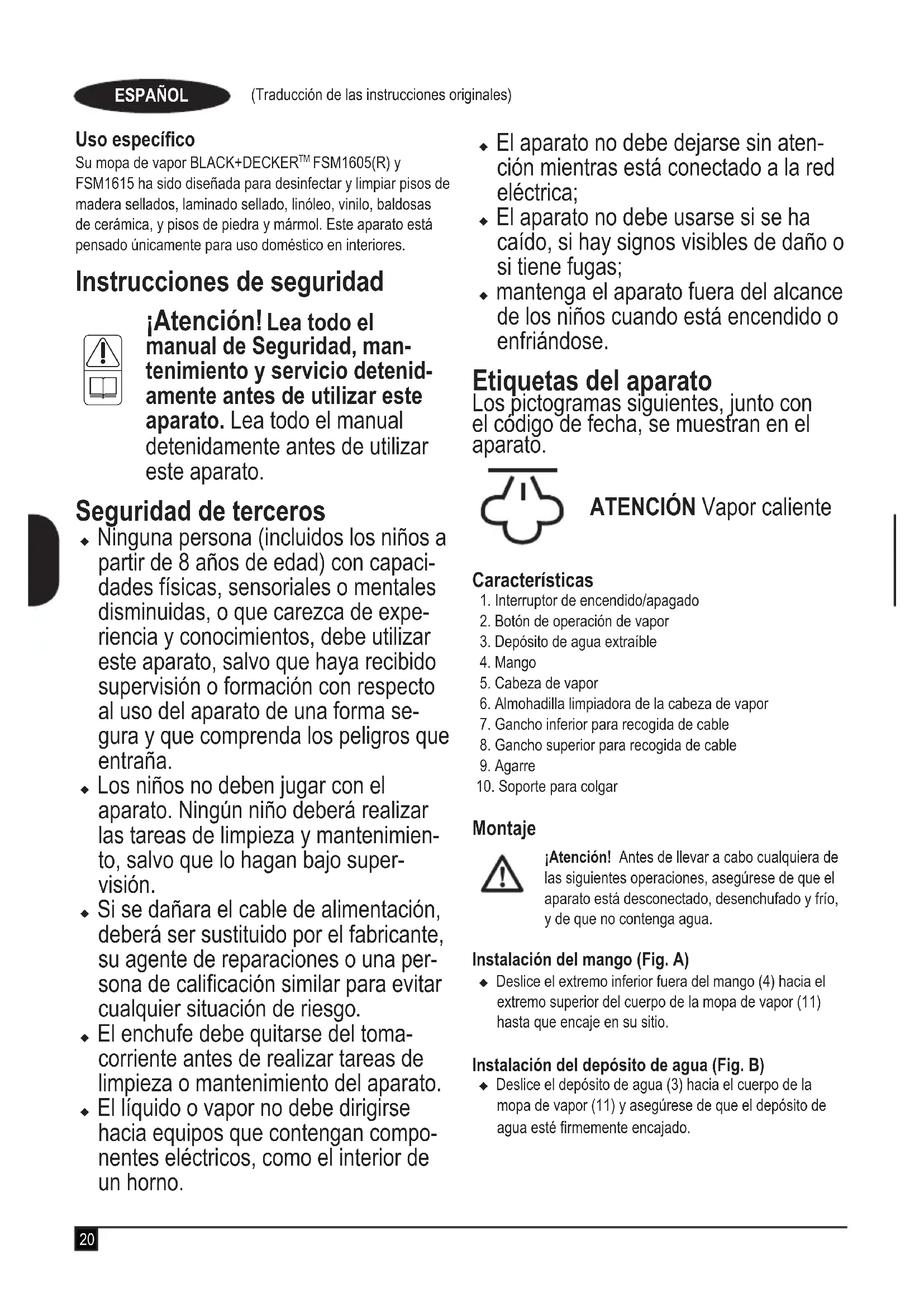 montagehoofdstuk binnenin de handleiding voor een juiste montage van de onderdelen en accessoires.20 (Traducción de las instrucciones originales) ESPAÑOL Uso especíco Su mopa de vapor BLACK+DECKER FSM1605(R) y FSM1615 ha sido diseñada para desinfectar y limpiar pisos de madera sellados, laminado sellado, linóleo, vinilo, baldosas de cerámica, y pisos de piedra y mármol. Este aparato está pensado únicamente para uso doméstico en interiores. Instrucciones de seguridad