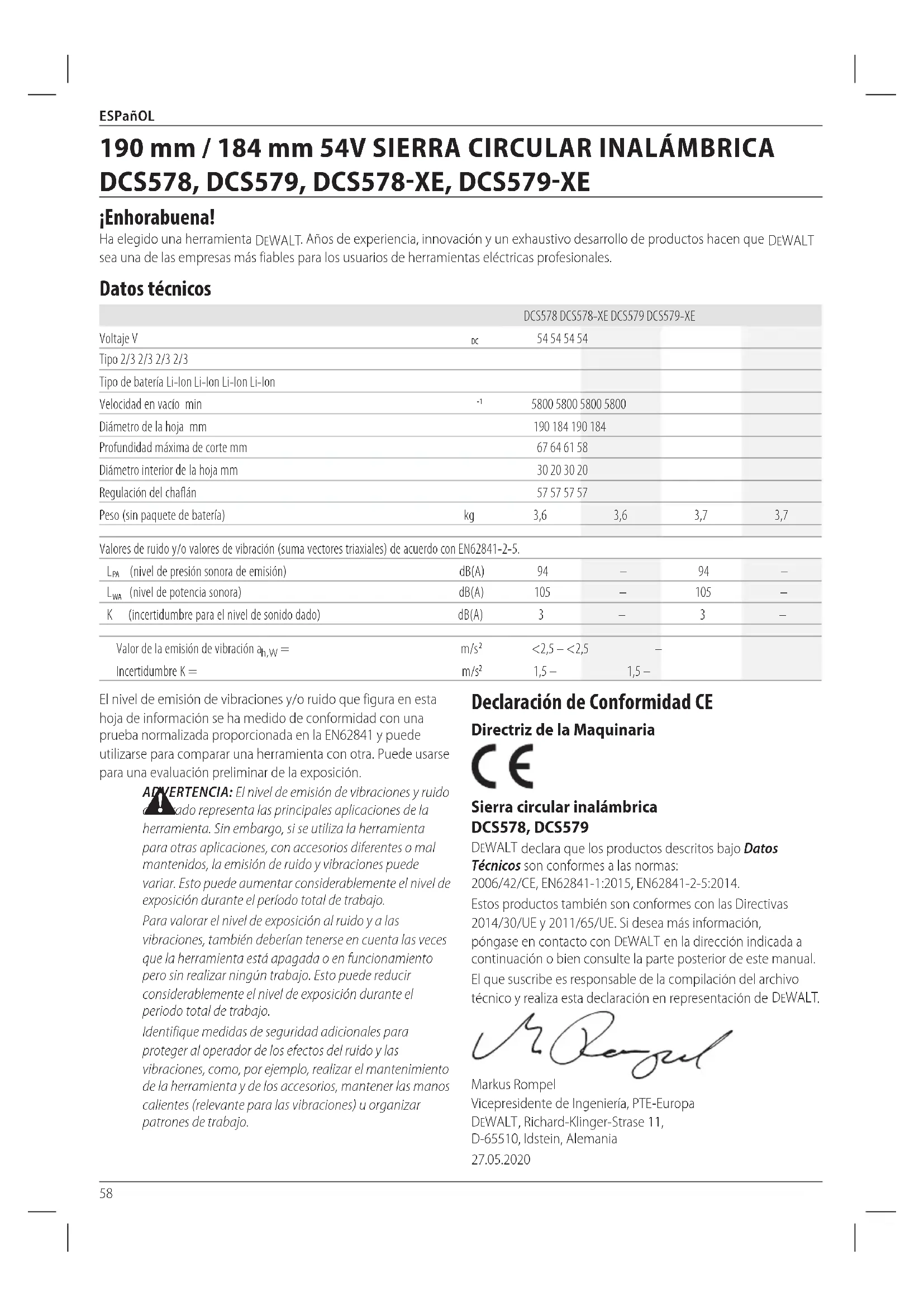 - Li-Ion cells are recyclable. Take them to your dealer or a local recycling station. The collected battery packs will be recycled or disposed ofproperly.58 ESPañOL Declaración de Conformidad CE Directriz de la Maquinaria Sierra circular inalámbrica DCS578, DCS579 DeWALT declara que los productos descritos bajo Datos Técnicos son conformes a las normas: 2006/42/CE, EN62841-1:2015, EN62841-2-5:2014. Estos productos también son conformes con las Directivas 2014/30/UE y 2011/65/UE. Si desea más información, póngase en contacto con DeWALT en la dirección indicada a continuación o bien consulte la parte posterior de estemanual. El que suscribe es responsable de la compilación del archivo técnico y realiza esta declaración en representación de DeWALT