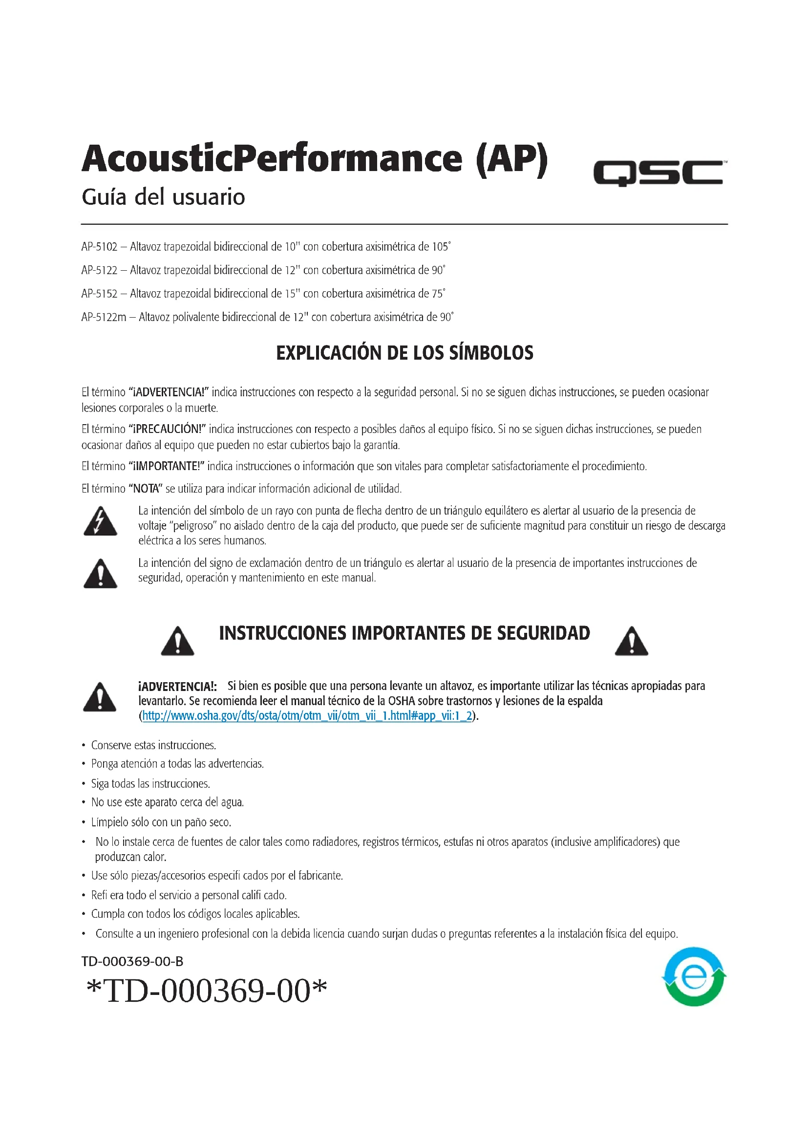 ¡ADVERTENCIA!: Si bien es posible que una persona levante un altavoz, es importante utilizar las técnicas apropiadas para levantarlo. Se recomienda leer el manual técnico de la OSHA sobre trastornos y lesiones de la espalda (http://www.osha.gov/dts/osta/otm/otm_vii/otm_vii_1.html#app_vii:1_2).• Conserve estas instrucciones.• Ponga atención a todas las advertencias.• Siga todas las instrucciones.• No use este aparato cerca del agua.• Límpielo sólo con un paño seco.