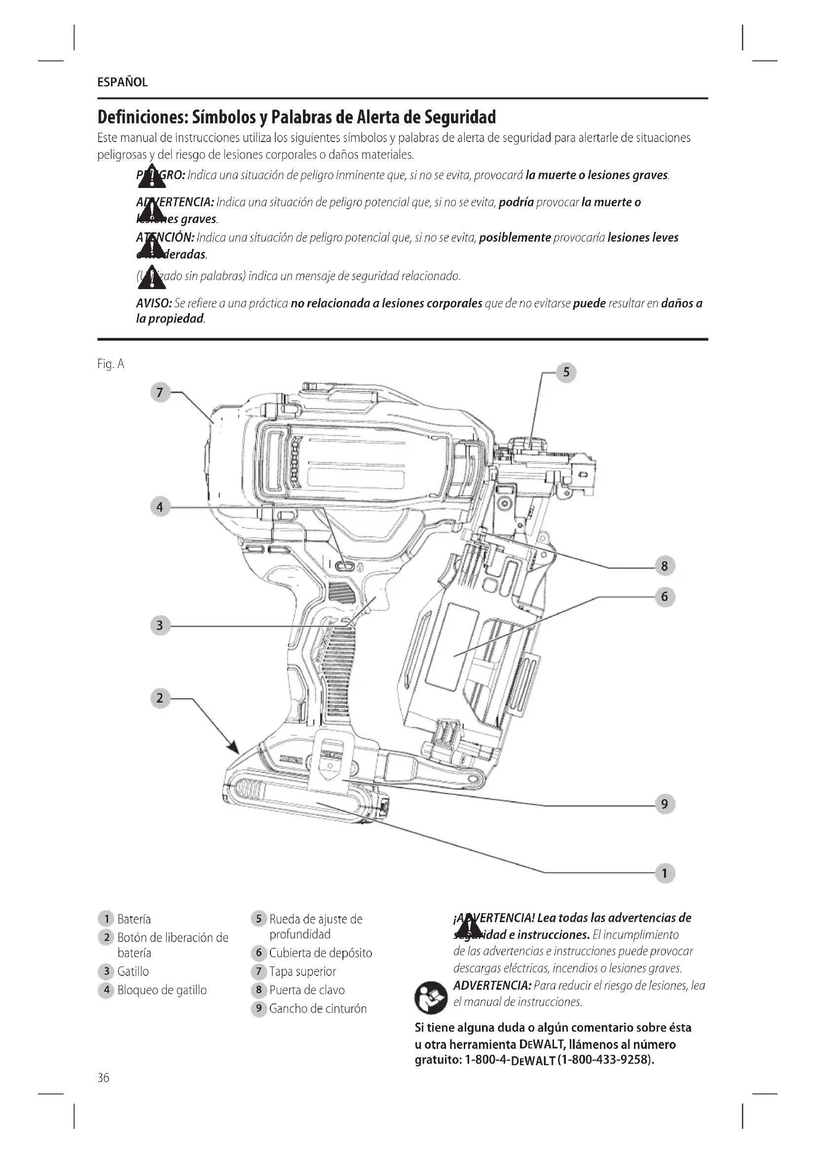 ¡ADVERTENCIA! Lea todas las advertencias de seguridad e instrucciones. El incumplimiento de las advertencias e instrucciones puede provocar descargas eléctricas, incendios o lesionesgraves. ADVERTENCIA: Para reducir el riesgo de lesiones, lea el manual deinstrucciones. Si tiene alguna duda o algún comentario sobre ésta u otra herramienta DeWALT , llámenos al número gratuito: 1-800-4- DeWALT (1-800-433-9258).