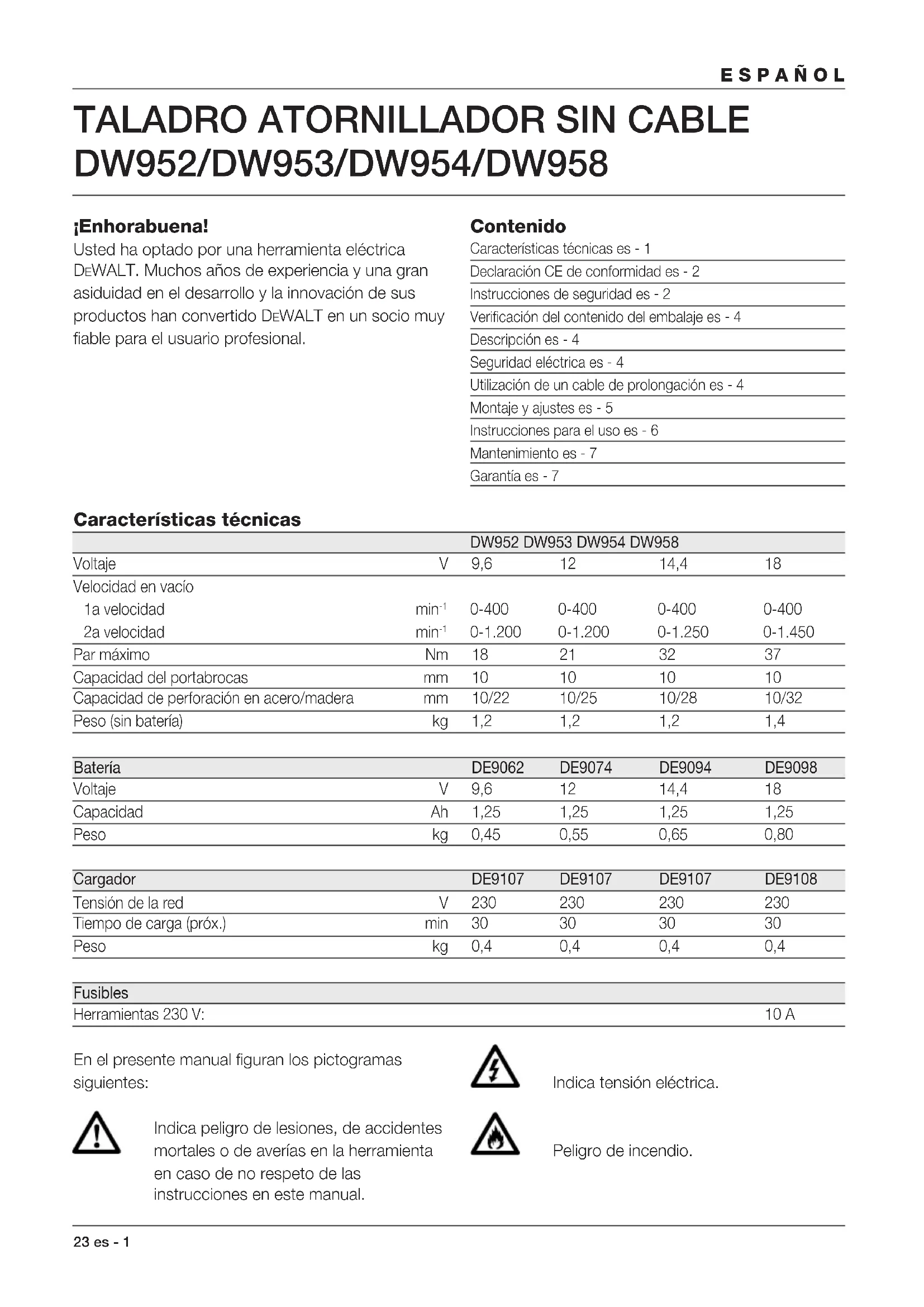 0-1.200 0-1.200 0-1.250 0-1.450 Par máximo Nm 18 21 32 37 Capacidad del portabrocas mm 10 10 10 10 Capacidad de perforación en acero/madera mm 10/22 10/25 10/28 10/32 Peso (sin batería) kg 1,2 1,2 1,2 1,4 Batería DE9062 DE9074 DE9094 DE9098 Voltaje V 9,6 12 14,4 18 Capacidad Ah 1,25 1,25 1,25 1,25 Peso kg 0,45 0,55 0,65 0,80 Cargador DE9107 DE9107 DE9107 DE9108 Tensión de la red V 230 230 230 230 Tiempo de carga (próx.) min 30 30 30 30 Peso kg 0,4 0,4 0,4 0,4 Fusibles Herramientas 230 V: 10 A En el presente manual figuran los pictogramas siguientes: Indica peligro de lesiones, de accidentes mortales o de averías en la herramienta en caso de no respeto de las instrucciones en este manual. Indica tensión eléctrica. Peligro de incendio.ESPAÑOL es - 2 24 Declaración CE de conformidad DW952/DW953/DW954/DW958 DEWALT certifica que estas herramientas eléctricas han sido construidas de acuerdo a las normas siguientes: 89/392/CEE, 89/336/CEE, 73/23/CEE, EN 50144, EN 55104 / EN 55014-2, EN 55014, EN 61000-3-2 & EN 61000-3-3. Para información más detallada, contacte a DEWALT, véase abajo o consulte el dorso de este manual. El nivel de la presión acústica de acuerdo con las normas 86/188/CEE & 89/392/CEE, medida de acuerdo con EN 50144: DW952 DW953 DW954 DW958