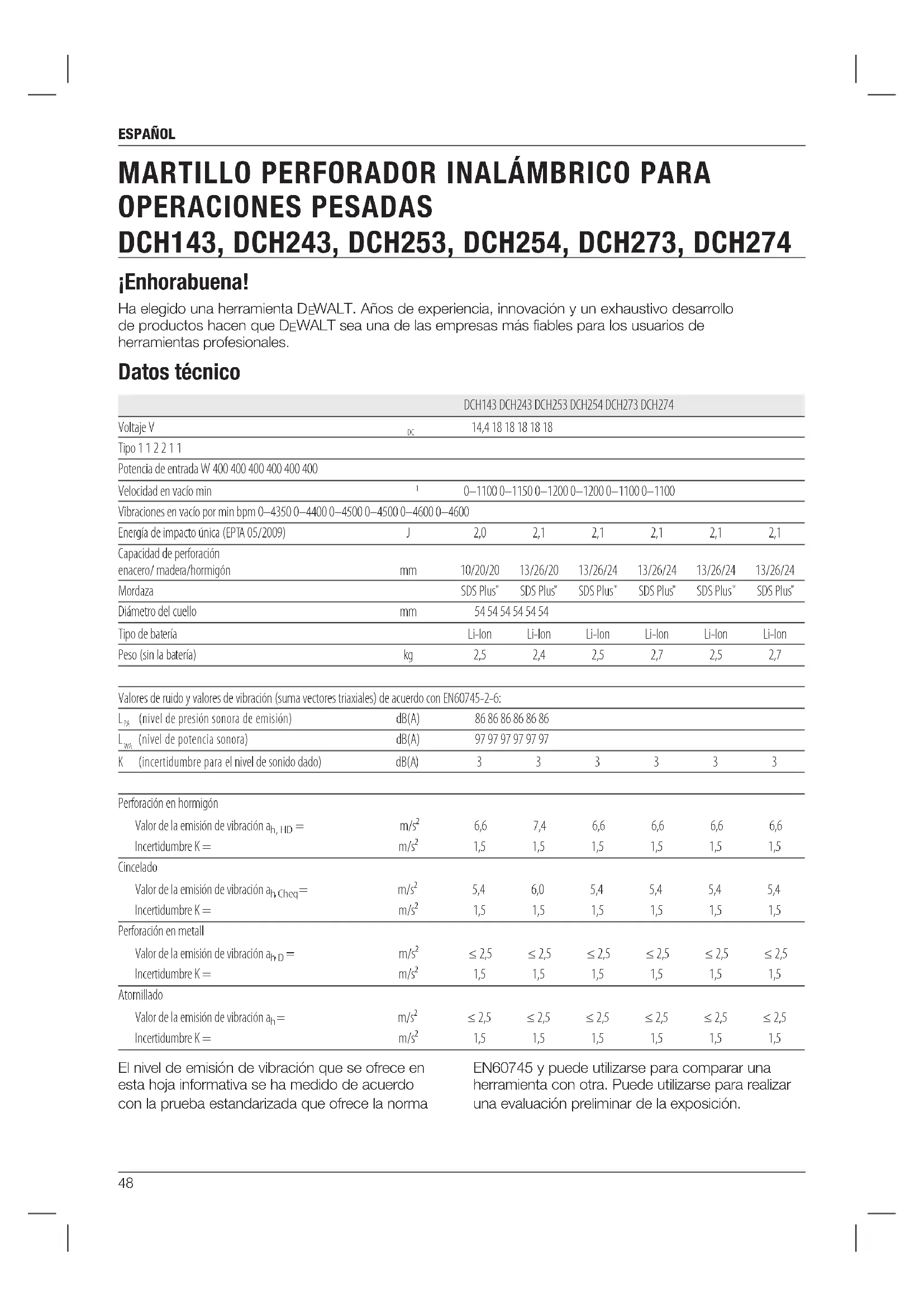 M. Manguito N. botón de indicación de combustible O. cubierta de polvo P. Collarín de bloqueo Q. Mandril sin llave (DCH273, DCH274) R. Gancho para cinturón (DCH273, DCH274) S. Botón del selector de modo T. Conexión sistema eléctrico de extracción de polvo USO PREVISTO Los taladros percutores rotatorios sin cable DCH143, DCH243, DCH253, DCH254, DCH273 y DCH274 han sido diseñados para tareas de taladrado y taladrado de percusión profesionales, así como para aplicaciones de atornillado y cincelado. NO deben usarse en condiciones húmedas ni en presencia de líquidos o gasesinflamables. Estos martillos perforadores son herramientas eléctricasprofesionales. NO permita que los niños toquen la herramienta. El uso de esta herramienta por parte de operadores inexpertos requieresupervisión. Retraso por batería caliente/fría. No realizar pruebas con objetos conductores. No cargar baterías deterioradas. No exponer al agua. Cambiar inmediatamente los cables defectuosos. Cargar sólo entre 4 ˚C y 40 ˚C. Sólo para uso en interior. Desechar las baterías con el debido respeto al medio ambiente. Cargue los paquetes de baterías DeWALT únicamente con los cargadores DeWALT indicados. Cargar los paquetes de baterías con baterías distintas a las indicadas por DeWALT en un cargador DeWALT , puede hacer que las baterías exploten o causar otras situaciones peligrosas. No queme el paquete de baterías. Contenido del embalaje El embalaje contiene: 1 Martillo perforador giratorio inalámbrico 1 Empuñadura lateral y varilla de profundidad 1 Cargador 1 Paquete de pila (D1, L1, M1, P1) 2 Paquetes de pilas (D2, L2, M2, P2) 3 Paquetes de pilas (D3, L3, M3, P3) 1 Mandril sin llave (DCH254, DCH274) 1 Caja kit 1 Manual de instrucciones NOTA: los paquetes de pilas, los cargadores y las cajas no están incluidos en los modelosN.