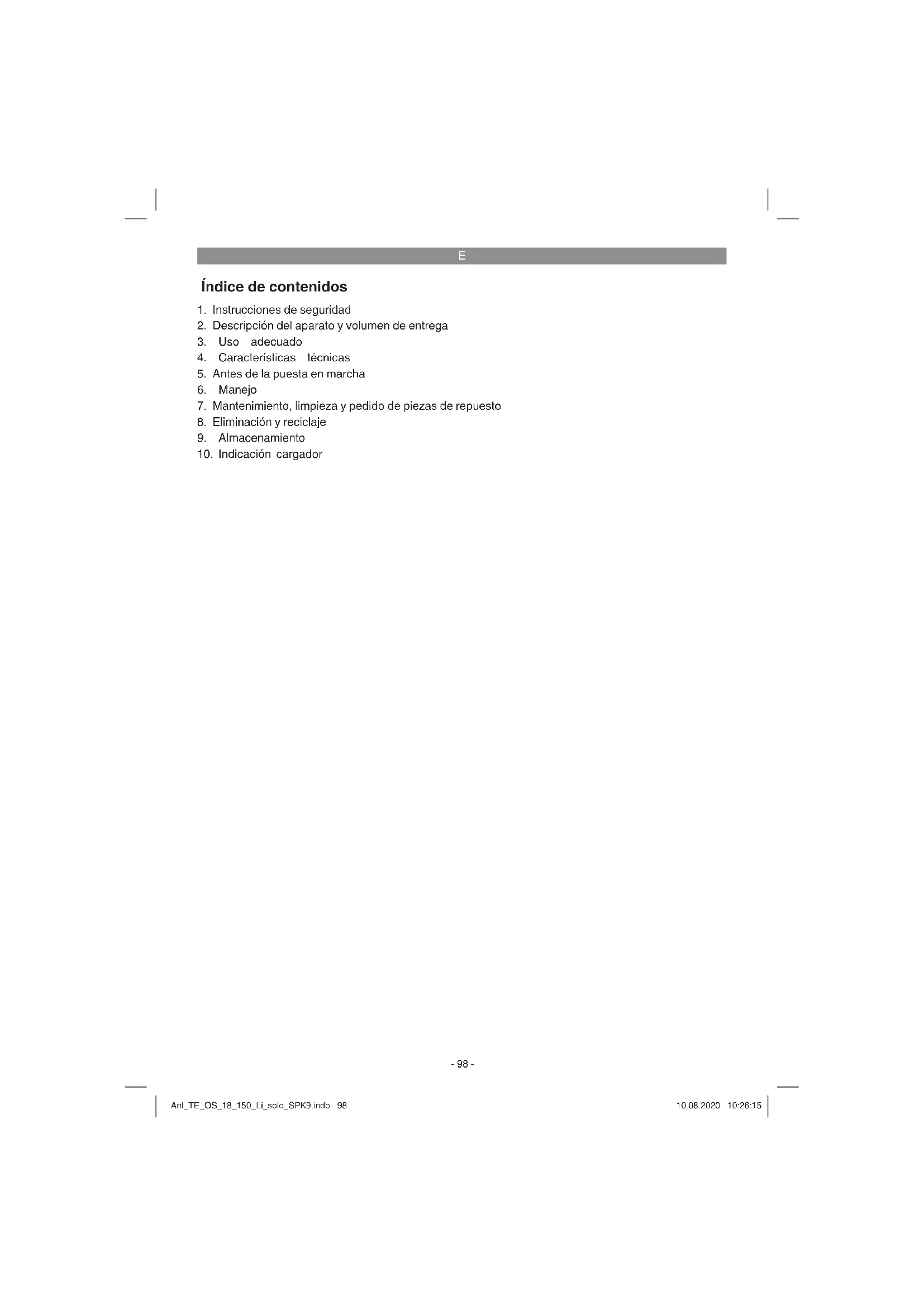 La máquina ha sido concebida para lijar madera, metal, plástico y materiales similares utilizando el papel abrasivo correspondiente. La máquina no está indicada para lijar en húmedo. Utilizar la máquina sólo en los casos que se indi- can explícitamente como de uso adecuado. Cual- quier otro uso no será adecuado. En caso de uso inadecuado, el fabricante no se hace responsable de daños o lesiones de cualquier tipo; el respon- sable es el usuario u operario de la máquina. Tener en consideración que nuestro aparato no está indicado para un uso comercial, industrial o en taller. No asumiremos ningún tipo de garantía cuando se utilice el aparato en zonas industria- les, comerciales o talleres, así como actividades similares. Anl_TE_OS_18_150_Li_solo_SPK9.indb 100Anl_TE_OS_18_150_Li_solo_SPK9.indb 100 10.08.2020 10:26:1610.08.2020 10:26:16E