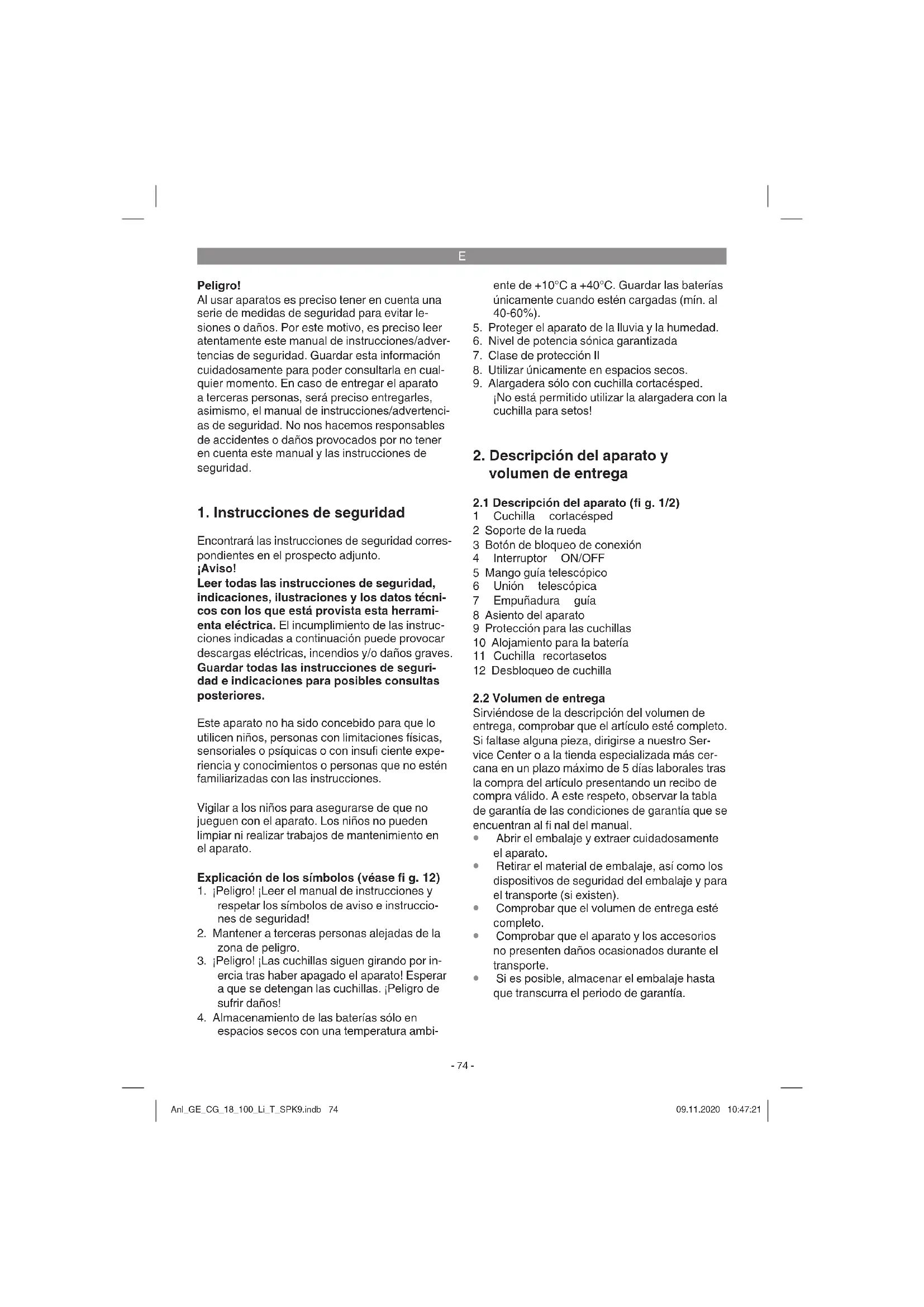 El aparato está protegido por un embalaje para evitar daños producidos por el transporte. Este embalaje es materia prima y, por eso, se puede volver a utilizar o llevar a un punto de reciclaje. El aparato y sus accesorios están compuestos de diversos materiales, como, p. ej., metal y plástico. Los aparatos defectuosos no deben tirarse a la basura doméstica. Para su eliminación adecu- ada, el aparato debe entregarse a una entidad recolectora prevista para ello. En caso de no Anl_GE_CG_18_100_Li_T_SPK9.indb 78Anl_GE_CG_18_100_Li_T_SPK9.indb 78 09.11.2020 10:47:2109.11.2020 10:47:21E