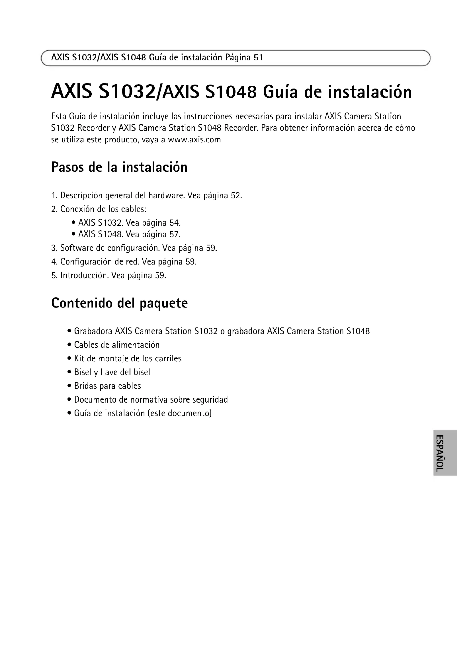 11AXIS S1032/AXIS S1048 Guía de instalación Página 53 ESPAÑOL Desembale e instale la grabadora Desembale el sistema e identifique cada artículo, vea Contenido del paquete en página 51. Monte los carriles e instale la grabadora AXIS en el bastidor tal y como indican las instrucciones de seguridad y las de instalación del bastidor, suministradas con el sistema.Página 54 AXIS S1032/AXIS S1048 Guía de instalación Conexión de los cables - AXIS S1032 Advertencia: Antes de iniciar ninguno de los procedimientos de esta sección, lea la información de seguridad suministrada con su ordenador. Para obtener más información, vea www.axis.com NOTA: Puede que no se incluyan algunos dispositivos si no los ha pedido.