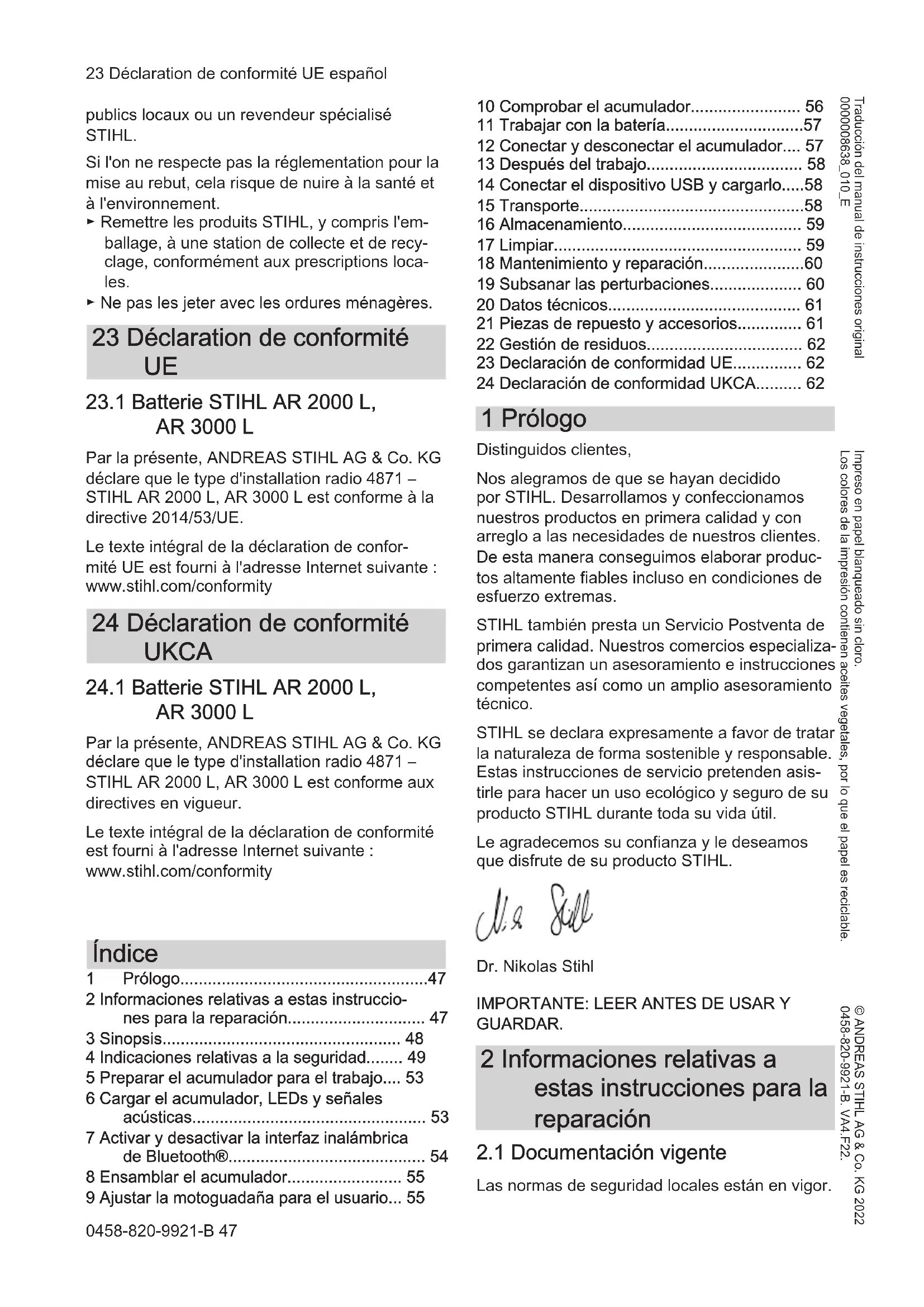 - 24 Declaración de conformidad UKCA 1 Prólogo Distinguidos clientes, Nos alegramos de que se hayan decidido por STIHL. Desarrollamos y confeccionamos nuestros productos en primera calidad y con arreglo a las necesidades de nuestros clientes. De esta manera conseguimos elaborar produc‐ tos altamente fiables incluso en condiciones de esfuerzo extremas. STIHL también presta un Servicio Postventa de primera calidad. Nuestros comercios especializa‐ dos garantizan un asesoramiento e instrucciones competentes así como un amplio asesoramiento técnico. STIHL se declara expresamente a favor de tratar la naturaleza de forma sostenible y responsable. Estas instrucciones de servicio pretenden asis‐ tirle para hacer un uso ecológico y seguro de su producto STIHL durante toda su vida útil. Le agradecemos su confianza y le deseamos que disfrute de su producto STIHL. Dr. Nikolas Stihl p. 62