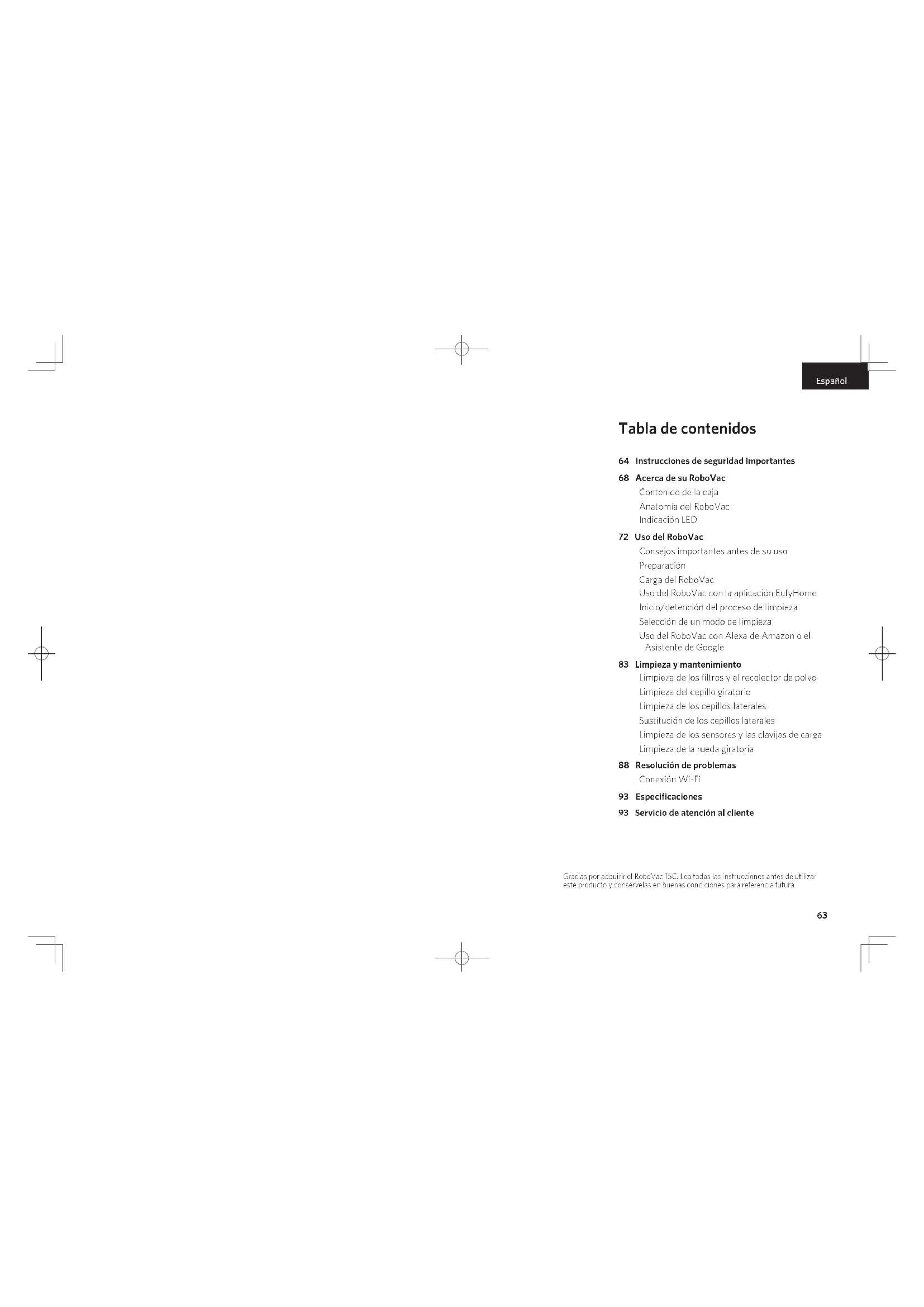 - Google Home es una marca comercial de Google Inc.68 69 Español Español Acerca de su RoboVac Contenido de la caja RoboVac 15C Adaptador de alimentación Herramienta de limpieza Cepillos laterales (4) Base de carga Mando a distancia (2 pilas AAA) Filtro de alto rendimiento adicional Manual del propietario y otros documentos Filtro de espuma adicional Sujetacables (5) Anatomía del RoboVac Parte superior y lateral Botón para iniciar/detener la limpieza automática Luz de estado de Wi-Fi Paragolpes Recolector de polvo Botón liberador del recolector de polvo Sensor de infrarrojos Parte inferior Sensores de caídaClavijas de cargaCompartimento de la bateríaProtección del cepilloCepillo giratorioInterruptor principal (inicio/pausa)Rueda giratoriaCepillos lateralesRuedasRecolector de polvo70 71 Español Español Recolector de polvo Prefiltro Filtro de espuma Filtro de alto rendimiento Entrada de succión Recolector de polvo Entrada de succión Base de carga Clavijas de cargaLuz de estadoCompartimento para guardar el cable de alimentaciónToma de alimentación Mando a distancia