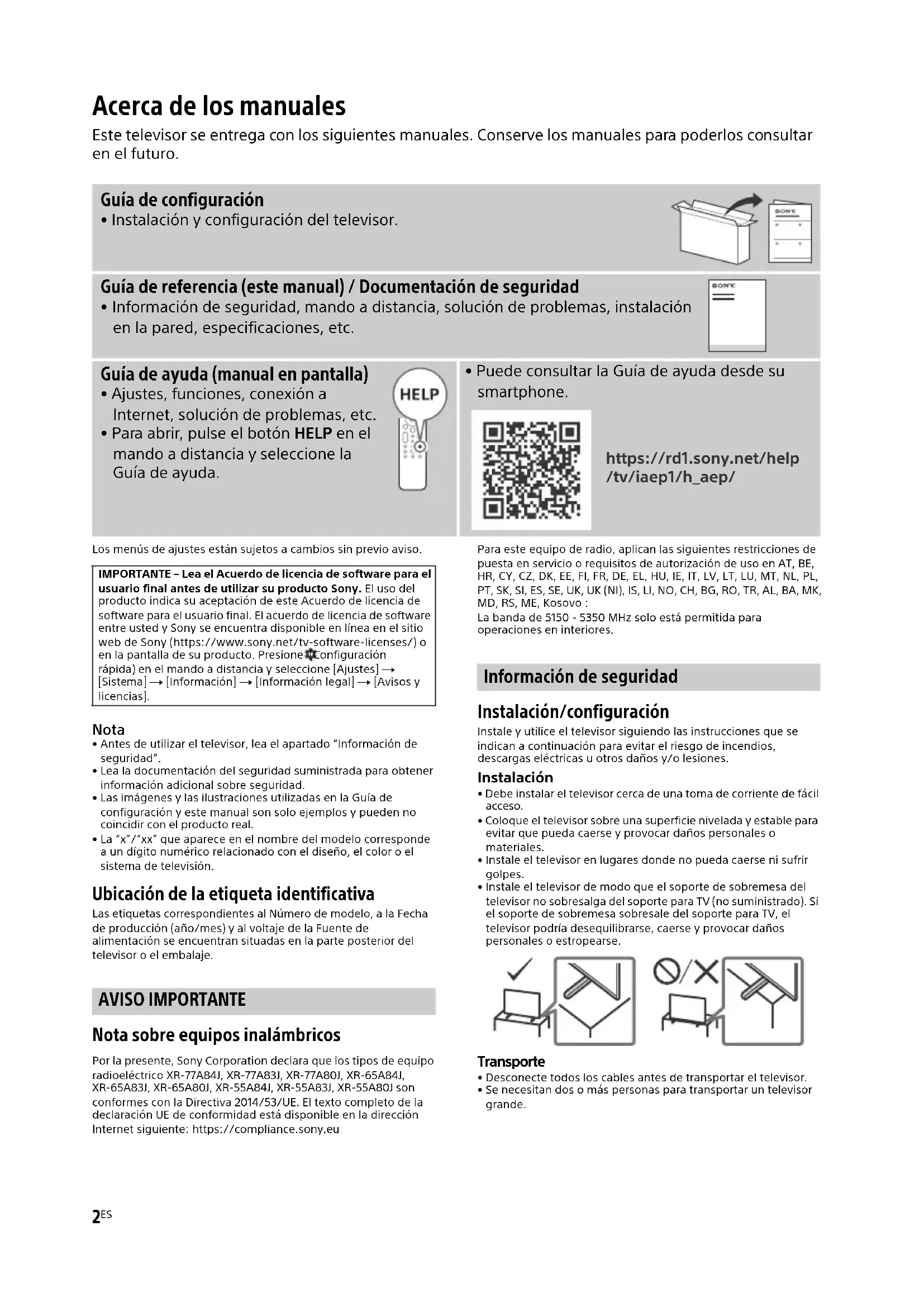 - Antes de utilizar el televisor, lea el apartado “Información de seguridad”.• Lea la documentación del seguridad suministrada para obtener información adicional sobre seguridad.• Las imágenes y las ilustraciones utilizadas en la Guía de configuración y este manual son solo ejemplos y pueden no coincidir con el producto real.• La “x”/“xx” que aparece en el nombre del modelo corresponde a un dígito numérico relacionado con el diseño, el color o el sistema de televisión. Ubicación de la etiqueta identificativa Las etiquetas correspondientes al Número de modelo, a la Fecha de producción (año/mes) y al voltaje de la Fuente de alimentación se encuentran situadas en la parte posterior del televisor o el embalaje. AVISO IMPORTANTE Nota sobre equipos inalámbricos Por la presente, Sony Corporation declara que los tipos de equipo radioeléctrico XR-77A84J, XR-77A83J, XR-77A80J, XR-65A84J, XR-65A83J, XR-65A80J, XR-55A84J, XR-55A83J, XR-55A80J son conformes con la Directiva 2014/53/UE. El texto completo de la declaración UE de conformidad está disponible en la dirección Internet siguiente: https://compliance.sony.euPara este equipo de radio, aplican las siguientes restricciones de puesta en servicio o requisitos de autorización de uso en AT, BE, HR, CY, CZ, DK, EE, FI, FR, DE, EL, HU, IE, IT, LV, LT, LU, MT, NL, PL, PT, SK, SI, ES, SE, UK, UK (NI), IS, LI, NO, CH, BG, RO, TR, AL, BA, MK, MD, RS, ME, Kosovo :La banda de 5150 - 5350 MHz solo está permitida para operaciones en interiores. Información de seguridad Instalación/configuración Instale y utilice el televisor siguiendo las instrucciones que se indican a continuación para evitar el riesgo de incendios, descargas eléctricas u otros daños y/o lesiones. Instalación