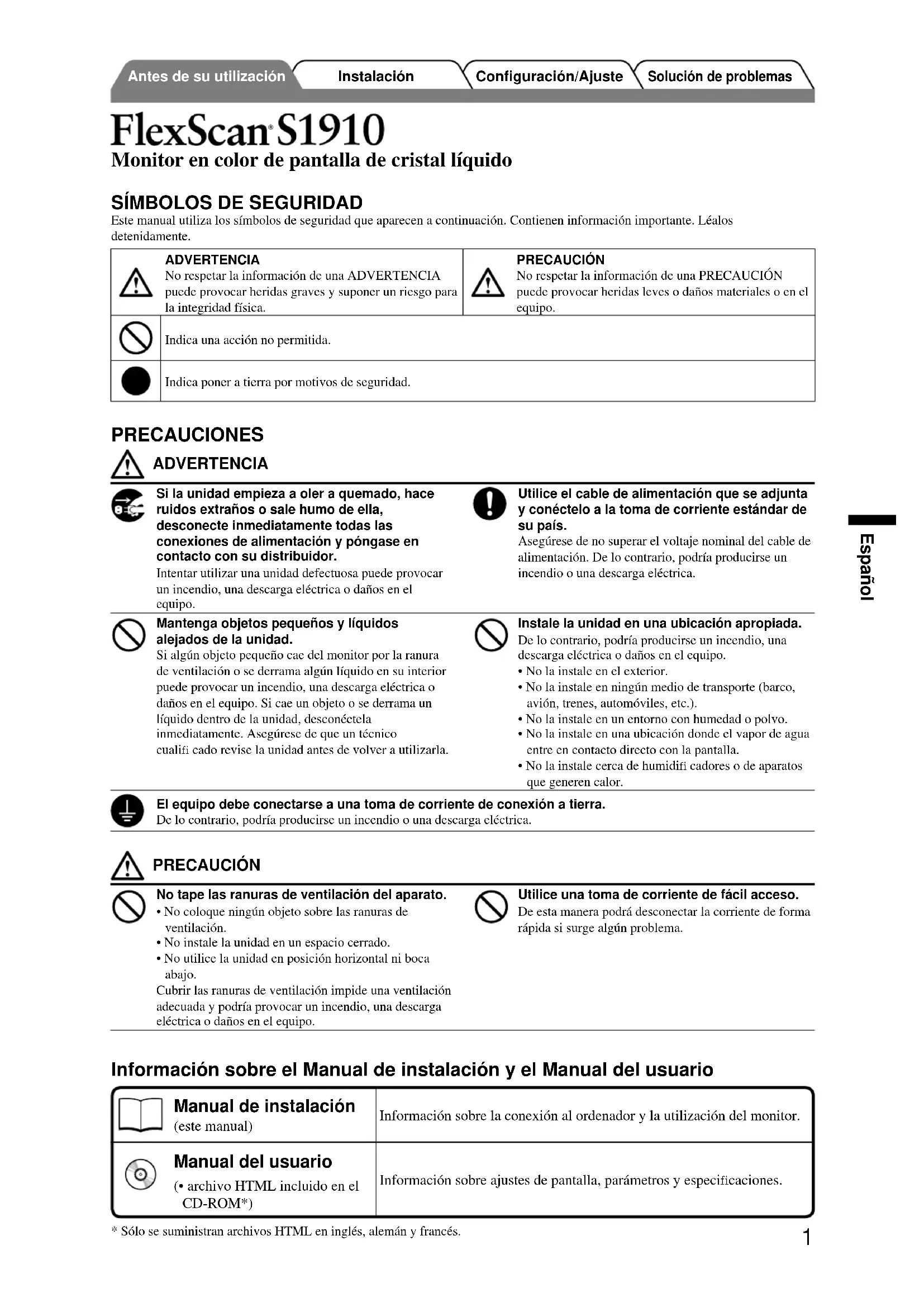Este manual utiliza los símbolos de seguridad que aparecen a continuación. Contienen información importante. Léalos detenidamente.ADVERTENCIANo respetar la información de una ADVERTENCIA puede provocar heridas graves y suponer un riesgo para la integridad física.PRECAUCIÓNNo respetar la información de una PRECAUCIÓN puede provocar heridas leves o daños materiales o en el equipo.Indica una acción no permitida.Indica poner a tierra por motivos de seguridad. PRECAUCIONES ADVERTENCIA Si la unidad empieza a oler a quemado, hace ruidos extraños o sale humo de ella, desconecte inmediatamente todas las conexiones de alimentación y póngase en contacto con su distribuidor.Intentar utilizar una unidad defectuosa puede provocar un incendio, una descarga eléctrica o daños en el equipo.Utilice el cable de alimentación que se adjunta y conéctelo a la toma de corriente estándar de su país.Asegúrese de no superar el voltaje nominal del cable de alimentación. De lo contrario, podría producirse un incendio o una descarga eléctrica.Mantenga objetos pequeños y líquidos alejados de la unidad.Si algún objeto pequeño cae del monitor por la ranura de ventilación o se derrama algún líquido en su interior puede provocar un incendio, una descarga eléctrica o daños en el equipo. Si cae un objeto o se derrama un líquido dentro de la unidad, desconéctela inmediatamente. Asegúrese de que un técnico cualifi cado revise la unidad antes de volver a utilizarla.Instale la unidad en una ubicación apropiada.De lo contrario, podría producirse un incendio, una descarga eléctrica o daños en el equipo.• No la instale en el exterior.• No la instale en ningún medio de transporte (barco, avión, trenes, automóviles, etc.).• No la instale en un entorno con humedad o polvo.• No la instale en una ubicación donde el vapor de agua entre en contacto directo con la pantalla.• No la instale cerca de humidifi cadores o de aparatos que generen calor.El equipo debe conectarse a una toma de corriente de conexión a tierra.De lo contrario, podría producirse un incendio o una descarga eléctrica. PRECAUCIÓN No tape las ranuras de ventilación del aparato.• No coloque ningún objeto sobre las ranuras de ventilación.• No instale la unidad en un espacio cerrado.• No utilice la unidad en posición horizontal ni boca abajo.Cubrir las ranuras de ventilación impide una ventilación adecuada y podría provocar un incendio, una descarga eléctrica o daños en el equipo.Utilice una toma de corriente de fácil acceso.De esta manera podrá desconectar la corriente de forma rápida si surge algún problema. Monitor en color de pantalla de cristal líquido Solución de problemas Configuración/AjusteInstalaciónAntes de su utilización Información sobre el Manual de instalación y el Manual del usuario Manual de instalación (este manual)Información sobre la conexión al ordenador y la utilización del monitor. Manual del usuario (• archivo HTML incluido en el CD-ROM*) Información sobre ajustes de pantalla, parámetros y especifi caciones.