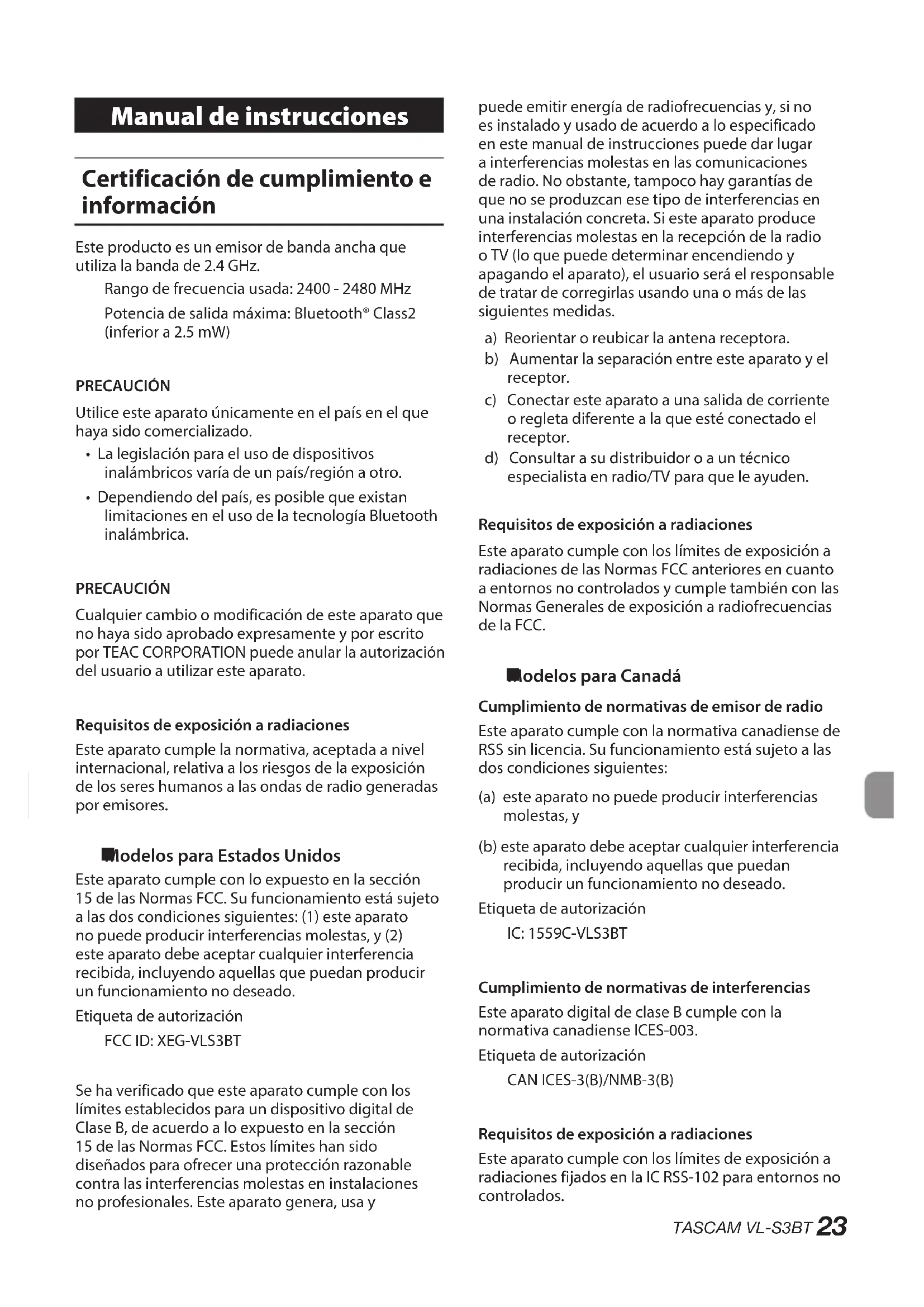 Modelos para Europa Por la presente, TEAC Corporation declara que este dispositivo de radio de tipo VL-S3BT cumple con la Directiva 2014/53/EU y otras Directivas y Normativas fijadas por la Comisión Europea.El texto completo de la declaración de conformidad EU está disponible en la siguiente dirección de internet: http://tascam.eu/en/kontakt.htmlEn caso de cualquier duda, póngase en contacto con nosotros vía emailImportador para Europa: TEAC Europe GmbHBahnstrasse 12, 65205 Wiesbaden-Erbenheim, GermanyRequisitos de exposición a radiacionesEste aparato cumple con la EN.62311; Fijación de límites de los dispositivos eléctricos y electrónicos relativa a restricciones a la exposición de los seres humanos a campos electromagnéticos y el standard armonizado de la DIRECTIVA 2014/53/EU. INSTRUCCIONES IMPORTANTES DE SEGURIDAD 1 Lea estas instrucciones.2 Conserve estas instrucciones.3 Cumpla con lo indicado en los avisos.4 Siga todas las instrucciones.5 No utilice este aparato cerca del agua.6 Límpielo solo con un trapo seco.7 No bloquee ninguna de las ranuras de ventilación. Instale este aparato de acuerdo con las instrucciones del fabricante.8 No instale este aparato cerca de fuentes de calor como radiadores, calentadores, hornos u otros aparatos (incluyendo amplificadores) que produzcan calor.9 No elimine el sistema de seguridad que supone el enchufe polarizado o con toma de tierra. Un enchufe polarizado tiene dos bornes, uno más ancho que el otro. Uno con toma de tierra tiene dos bornes iguales y una tercera lámina para la conexión a tierra. El borne ancho o la lámina se incluyen para su seguridad. Si el enchufe que venga con la unidad no encaja en su salida de corriente, haga que un electricista cambie su salida anticuada.10 Evite que el cable de corriente quede de forma que pueda ser pisado o quedar retorcido o aplastado, especialmente en los enchufes, receptáculos o en el punto en el que salen del aparato.11 Use solo accesorios / complementos especificados por el fabricante.12 Utilice este aparato solo con un soporte, trípode, o bastidor especificado por el fabricante o que se venda con el propio aparato. Cuando utilice un bastidor con ruedas, tenga cuidado al mover la combinación de aparato/bastidor para evitar que vuelque y puedan producirse daños.13 Desconecte este aparato de la corriente durante las tormentas eléctricas o cuando no lo vaya a usar durante un periodo de tiempo largo.14 Dirija cualquier posible reparación solo al servicio técnico oficial. Este aparato deberá ser reparado si se ha dañado de alguna forma, como por ejemplo si el cable de corriente o el enchufe están rotos, si ha sido derramado algún líquido sobre la unidad o algún objeto ha sido introducido en ella, si ha quedado expuesto a la lluvia o la humedad, si no funciona normalmente o si ha caído al suelo en algún momento.• Este aparato recibe corriente nominal no operativa de la salida de corriente AC aun cuando su interruptor POWER o STANDBY/ON no esté en la posición ON.• Dado que el cable de alimentación es el sistema de desconexión de esta unidad debe ubicarla de forma que siempre pueda acceder a él.• Tenga cuidado al usar auriculares de cualquier tipo con este aparato dado que una presión sonora excesiva en los auriculares puede producirle daños auditivos.• Si detecta cualquier tipo de problema mientras utiliza este aparato, póngase en contacto con TEAC para informar de ello y hacer que la unidad sea revisada o reparada.PRECAUCIÓN• No permita que este aparato quede expuesto a salpicaduras de ningún tipo.• No coloque objetos que contengan líquidos, como jarrones, sobre este aparato.• No instale este aparato encastrado en una librería o mueble similar.• El aparato debe estar colocado lo suficientemente cerca de la salida de corriente como para poder acceder al enchufe en cualquier momento.TASCAM VL-S3BT