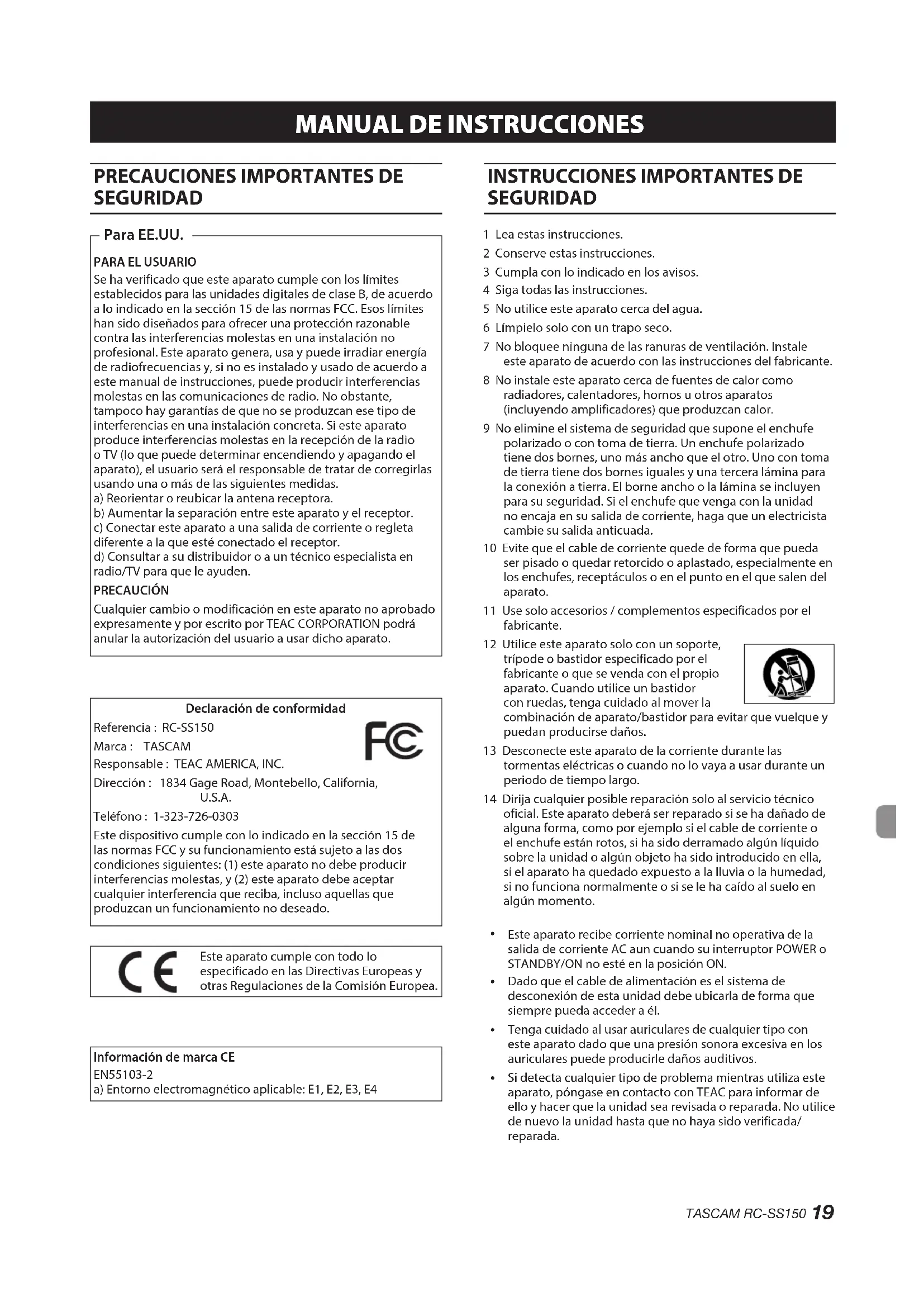 Se ha verificado que este aparato cumple con los límites establecidos para las unidades digitales de clase B, de acuerdo a lo indicado en la sección 15 de las normas FCC. Esos límites han sido diseñados para ofrecer una protección razonable contra las interferencias molestas en una instalación no profesional. Este aparato genera, usa y puede irradiar energía de radiofrecuencias y, si no es instalado y usado de acuerdo a este manual de instrucciones, puede producir interferencias molestas en las comunicaciones de radio. No obstante, tampoco hay garantías de que no se produzcan ese tipo de interferencias en una instalación concreta. Si este aparato produce interferencias molestas en la recepción de la radio o TV (lo que puede determinar encendiendo y apagando el aparato), el usuario será el responsable de tratar de corregirlas usando una o más de las siguientes medidas. a) Reorientar o reubicar la antena receptora. b) Aumentar la separación entre este aparato y el receptor. c) Conectar este aparato a una salida de corriente o regleta diferente a la que esté conectado el receptor. d) Consultar a su distribuidor o a un técnico especialista en radio/TV para que le ayuden. PRECAUCIÓN Cualquier cambio o modificación en este aparato no aprobado expresamente y por escrito por TEAC CORPORATION podrá anular la autorización del usuario a usar dicho aparato. Para EE.UU. Declaración de conformidad Referencia : RC-SS150 Marca : TASCAM Responsable : TEAC AMERICA, INC. Dirección : 1834 Gage Road, Montebello, California, U.S.A. Teléfono : 1-323-726-0303 Este dispositivo cumple con lo indicado en la sección 15 de las normas FCC y su funcionamiento está sujeto a las dos condiciones siguientes: (1) este aparato no debe producir interferencias molestas, y (2) este aparato debe aceptar cualquier interferencia que reciba, incluso aquellas que produzcan un funcionamiento no deseado. Este aparato cumple con todo lo especificado en las Directivas Europeas y otras Regulaciones de la Comisión Europea. Información de marca CE EN55103-2 a) Entorno electromagnético aplicable: E1, E2, E3, E4