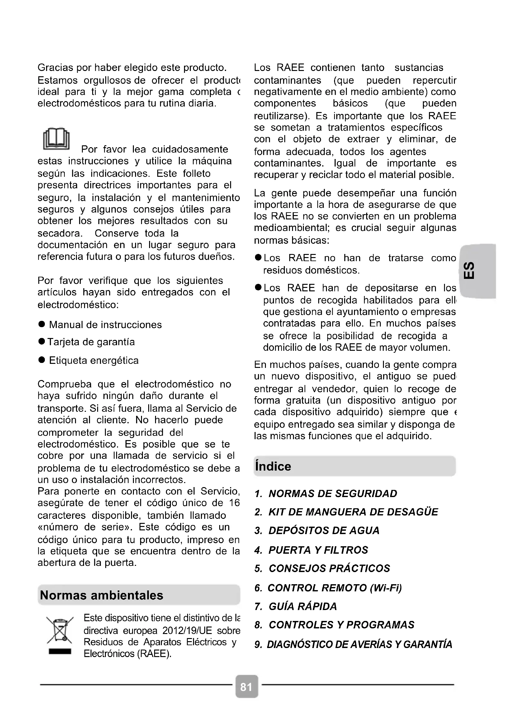 Gracias por haber elegido este producto. Estamos orgullosos de ofrecer el producto ideal para ti y la mejor gama completa de electrodomésticos para tu rutina diaria. Por favor lea cuidadosamente estas instrucciones y utilice la máquina según las indicaciones. Este folleto presenta directrices importantes para el seguro, la instalación y el mantenimiento seguros y algunos consejos útiles para obtener los mejores resultados con su secadora. Conserve toda la documentación en un lugar seguro para referencia futura o para los futuros dueños. Por favor verifique que los siguientes artículos hayan sido entregados con el electrodoméstico: l Manual de instrucciones l Tarjeta de garantía l Etiqueta energética Comprueba que el electrodoméstico no haya sufrido ningún daño durante el transporte. Si así fuera, llama al Servicio de atención al cliente. No hacerlo puede comprometer la seguridad del electrodoméstico. Es posible que se te cobre por una llamada de servicio si el problema de tu electrodoméstico se debe a un uso o instalación incorrectos. Para ponerte en contacto con el Servicio, asegúrate de tener el código único de 16 caracteres disponible, también llamado «número de serie». Este código es un código único para tu producto, impreso en la etiqueta que se encuentra dentro de la abertura de la puerta.