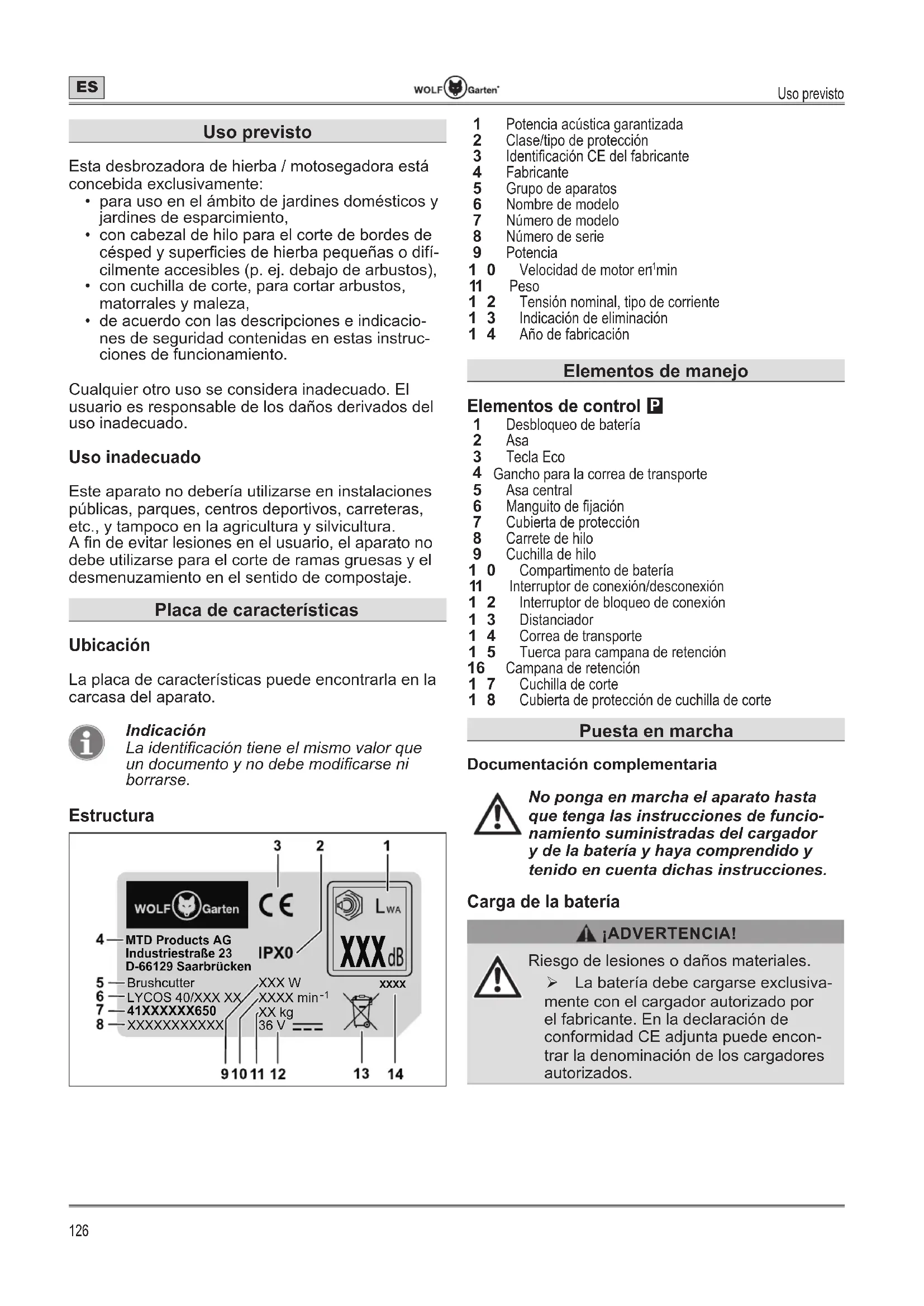 - de acuerdo con las descripciones e indicacio- nes de seguridad contenidas en estas instruc- ciones de funcionamiento. Cualquier otro uso se considera inadecuado. El usuario es responsable de los daños derivados del uso inadecuado. 8VRLQDGHFXDGR Este aparato no debería utilizarse en instalaciones públicas, parques, centros deportivos, carreteras, etc., y tampoco en la agricultura y silvicultura. $¿QGHHYLWDUOHVLRQHVHQHOXVXDULRHODSDUDWRQR debe utilizarse para el corte de ramas gruesas y el desmenuzamiento en el sentido de compostaje. 3ODFDGHFDUDFWHUtVWLFDV 8ELFDFLyQ La placa de características puede encontrarla en la carcasa del aparato. Indicación /DLGHQWL¿FDFLyQWLHQHHOPLVPRYDORUTXH