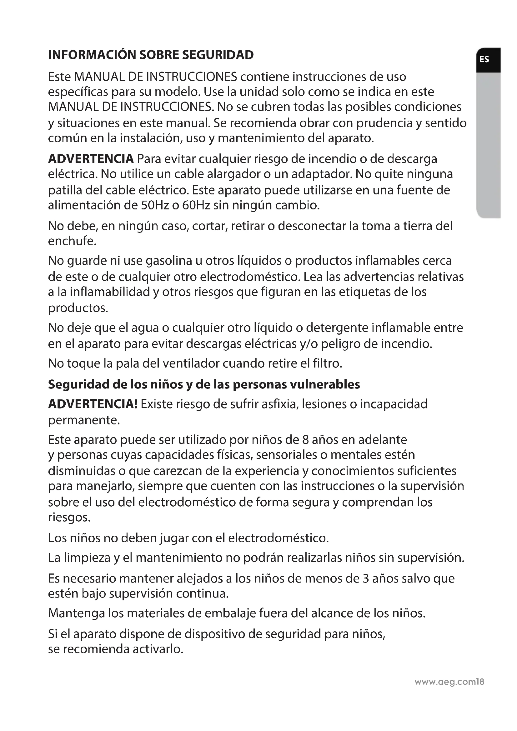 Este MANUAL DE INSTRUCCIONES contiene instrucciones de uso específicas para su modelo. Use la unidad solo como se indica en este MANUAL DE INSTRUCCIONES. No se cubren todas las posibles condiciones y situaciones en este manual. Se recomienda obrar con prudencia y sentido común en la instalación, uso y mantenimiento del aparato. ADVERTENCIA Para evitar cualquier riesgo de incendio o de descarga eléctrica. No utilice un cable alargador o un adaptador. No quite ninguna patilla del cable eléctrico. Este aparato puede utilizarse en una fuente de alimentación de 50Hz o 60Hz sin ningún cambio. No debe, en ningún caso, cortar, retirar o desconectar la toma a tierra del enchufe. No guarde ni use gasolina u otros líquidos o productos inflamables cerca de este o de cualquier otro electrodoméstico. Lea las advertencias relativas a la inflamabilidad y otros riesgos que figuran en las etiquetas de los productos. No deje que el agua o cualquier otro líquido o detergente inflamable entre en el aparato para evitar descargas eléctricas y/o peligro de incendio. No toque la pala del ventilador cuando retire el filtro. Seguridad de los niños y de las personas vulnerables ADVERTENCIA! Existe riesgo de sufrir asfixia, lesiones o incapacidad permanente. Este aparato puede ser utilizado por niños de 8 años en adelante y personas cuyas capacidades físicas, sensoriales o mentales estén disminuidas o que carezcan de la experiencia y conocimientos suficientes para manejarlo, siempre que cuenten con las instrucciones o la supervisión sobre el uso del electrodoméstico de forma segura y comprendan los riesgos. Los niños no deben jugar con el electrodoméstico. La limpieza y el mantenimiento no podrán realizarlas niños sin supervisión. Es necesario mantener alejados a los niños de menos de 3 años salvo que estén bajo supervisión continua. Mantenga los materiales de embalaje fuera del alcance de los niños. Si el aparato dispone de dispositivo de seguridad para niños, serecomienda activarlo. ESwww.aeg.com 19 Información sobre electricidad ¡ADEVERTNECIA! Para evitar cualquier riesgo de incendio ode descarga eléctrica. Si no está seguro de que la toma de corriente está puesta a tierra o protegida con un diferencial, haga que un electricista cualificado instale la toma de corriente de acuerdo con el Reglamento electrotécnico o las normativas locales. No utilice un cable alargador o un adaptador. Nunca desenchufe la unidad tirando del cable de alimentación. Sujete el enchufe con firmeza y tire de él. No pince, doble o ate el cable de alimentación. No corte ni dañe el cable eléctrico. Si se daña el cable eléctrico, debe sustituirlo solamente un servicio técnico autorizado de AEG. Esta unidad no contiene piezas que puedan ser reparadas por el usuario. Para cualquier reparación, acuda siempre a un servicio técnico autorizado de AEG. Si el cable de alimentación estuviera dañado, debe ser reemplazado por el fabricante, su agente de servicio opersonas con capacidad similar para evitar peligros. Asegúrese de que desenchufa la unidad antes de limpiarla para evitar riesgos de descargas o incendios. Precauciones de seguridad ¡PRECAUCIÓN! Evite lesiones graves o la muerte. No introduzca los dedos ni otros objetos en la salida deaire ni en la rejilla frontal del aparato. No encienda ni apague la unidad desenchufando elcableeléctrico ni desconectando la corriente enelcuadro eléctrico. En caso de fallo de funcionamiento (chispas, olor aquemado, etc.), apague inmediatamente el aparato, desconecte el cable eléctrico y llame a un servicio técnico autorizado de AEG. No utilice la unidad con las manos mojadas. No tire del cable eléctrico. PRECAUCIÓN! Evite lesiones o daños a la unidad u otros objetos. No dirija el flujo de aire a chimeneas u otras fuentes decalor, ya que podría causar llamaradas. No se suba al aparato ni coloque objetos sobre él. No cuelgue objetos del aparato. No coloque contenedores con líquidos sobre el aparato. Desenchufe la unidad de la fuente de alimentación cuando no vaya a utilizarla durante un período prolongado de tiempo. Utilice el aparato con el filtro de aire. No obstruya ni cubra la rejilla de entrada, el área de salida ni los orificios de descarga. Asegúrese de que cualquier equipo eléctrico/electrónico esté a 30 cm de la unidad. DESECHO Este símbolo en el producto indica que este producto contiene una batería que no debe serdesechada con la basura doméstica normal. Este símbolo que aparece en el producto osuembalaje indica que este producto nodebetratarse como residuos domésticos Para reciclar su producto, llévelo a un punto de recogida oficial o a un centro de servicio AEG, donde se retirará y reciclará la batería y piezas eléctricas de forma segura y profesional. Siga las normas de su país en materia de recogida de baterías recargables y productos eléctricos. ESPAÑOL Gracias por elegir el purificador de aire AEG AX3. Use siempre accesorios y piezas de repuesto originales para lograr los mejores resultados. Este producto se ha diseñado pensando en el medio ambiente. Todas las piezas de plástico tienen marcas para su reciclaje.