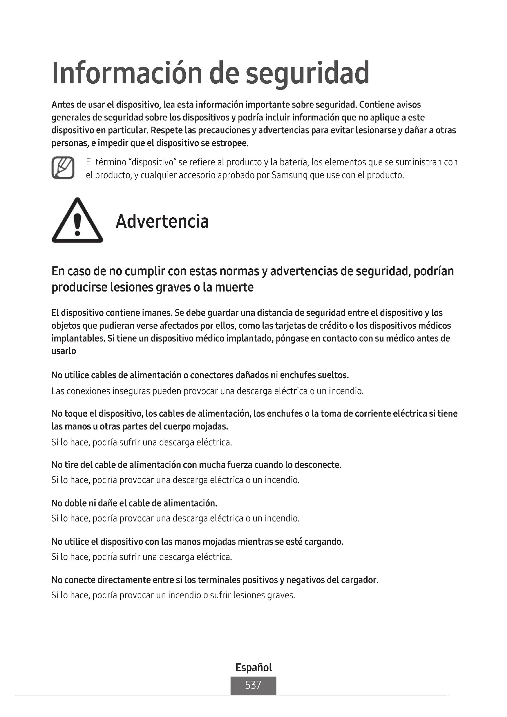 Información de seguridad Antes de usar el dispositivo, lea esta información importante sobre seguridad. Contiene avisos generales de seguridad sobre los dispositivos y podría incluir información que no aplique a este dispositivo en particular. Respete las precauciones y advertencias para evitar lesionarse y dañar a otras personas, e impedir que el dispositivo se estropee. El término “dispositivo” se refiere al producto y la batería, los elementos que se suministran con el producto, y cualquier accesorio aprobado por Samsung que use con el producto. Advertencia En caso de no cumplir con estas normas y advertencias de seguridad, podrían producirse lesiones graves o la muerte El dispositivo contiene imanes. Se debe guardar una distancia de seguridad entre el dispositivo y los objetos que pudieran verse afectados por ellos, como las tarjetas de crédito o los dispositivos médicos implantables. Si tiene un dispositivo médico implantado, póngase en contacto con su médico antes de usarlo No utilice cables de alimentación o conectores dañados ni enchufes sueltos. Las conexiones inseguras pueden provocar una descarga eléctrica o un incendio. No toque el dispositivo, los cables de alimentación, los enchufes o la toma de corriente eléctrica si tiene las manos u otras partes del cuerpo mojadas. Si lo hace, podría sufrir una descarga eléctrica. No tire del cable de alimentación con mucha fuerza cuando lo desconecte. Si lo hace, podría provocar una descarga eléctrica o un incendio. No doble ni dañe el cable de alimentación. Si lo hace, podría provocar una descarga eléctrica o un incendio. No utilice el dispositivo con las manos mojadas mientras se esté cargando. Si lo hace, podría sufrir una descarga eléctrica. No conecte directamente entre sí los terminales positivos y negativos del cargador. Si lo hace, podría provocar un incendio o sufrir lesiones graves.Español