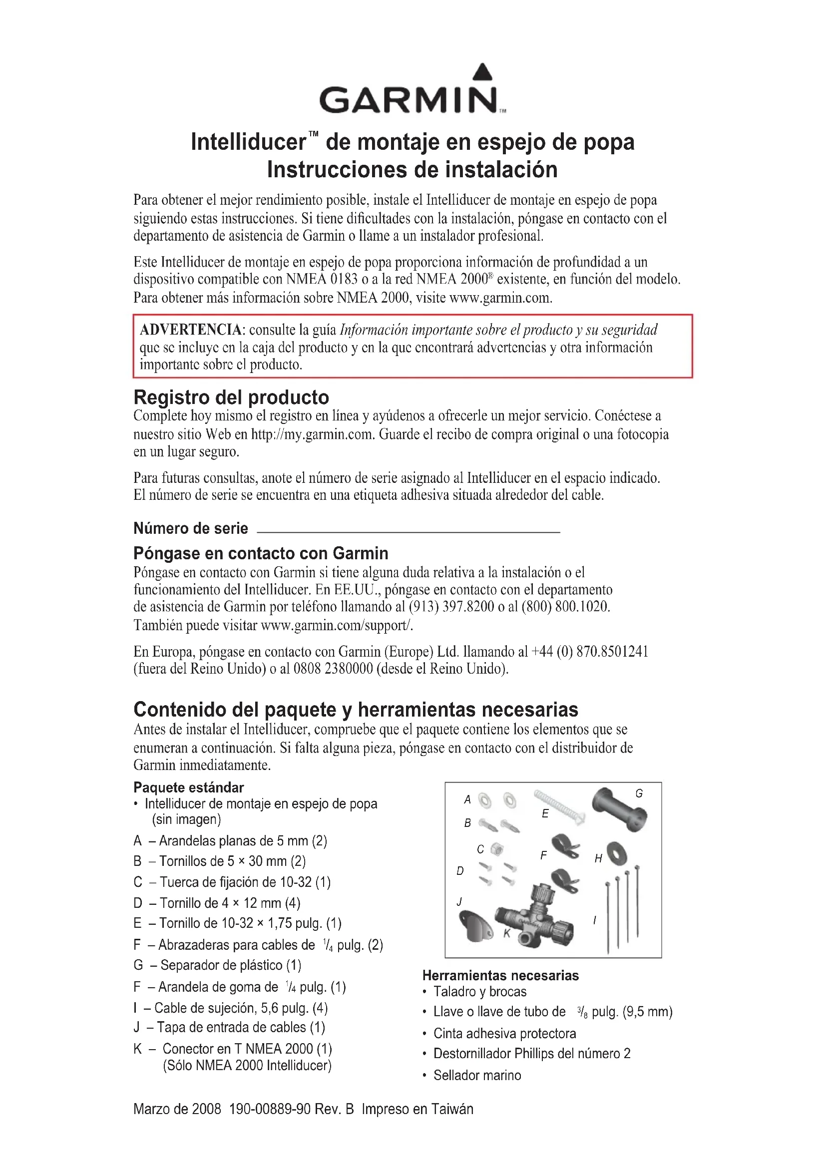 existente, en función del modelo. Para obtener más información sobre NMEA 2000, visite www.garmin.com. ADVERTENCIA: consulte la guía Información importante sobre el producto y su seguridad que se incluye en la caja del producto y en la que encontrará advertencias y otra información importante sobre el producto. Registro del producto Complete hoy mismo el registro en línea y ayúdenos a ofrecerle un mejor servicio. Conéctese a nuestro sitio Web en http://my.garmin.com. Guarde el recibo de compra original o una fotocopia en un lugar seguro. Para futuras consultas, anote el número de serie asignado al Intelliducer en el espacio indicado. El número de serie se encuentra en una etiqueta adhesiva situada alrededor del cable. Número de serie Póngase en contacto con Garmin Póngase en contacto con Garmin si tiene alguna duda relativa a la instalación o el funcionamiento del Intelliducer. En EE.UU., póngase en contacto con el departamento de asistencia de Garmin por teléfono llamando al (913) 397.8200 o al (800) 800.1020. También puede visitar www.garmin.com/support/. En Europa, póngase en contacto con Garmin (Europe) Ltd. llamando al +44 (0) 870.8501241 (fuera del Reino Unido) o al 0808 2380000 (desde el Reino Unido). Contenido del paquete y herramientas necesarias Antes de instalar el Intelliducer, compruebe que el paquete contiene los elementos que se enumeran a continuación. Si falta alguna pieza, póngase en contacto con el distribuidor de Garmin inmediatamente. Paquete estándar• Intelliducer de montaje en espejo de popa (sin imagen)A – Arandelas planas de 5 mm (2)B – Tornillos de 5 × 30 mm (2)C – Tuerca de jación de 10-32 (1)D – Tornillo de 4 × 12 mm (4)E – Tornillo de 10-32 × 1,75 pulg. (1)F – Abrazaderas para cables de