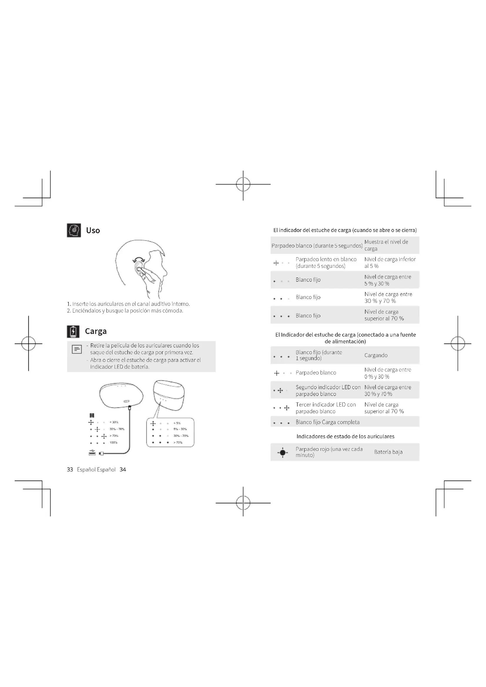Carga - Retire la película de los auriculares cuando los saque del estuche de carga por primera vez. - Abra o cierre el estuche de carga para activar el indicador LED de batería. < 30% 30% - 70% > 70% 100% 5% - 30% < 5% 30% - 70% > 70% El indicador del estuche de carga (cuando se abre o se cierra) Parpadeo blanco (durante 5 segundos) Muestra el nivel de carga Parpadeo lento en blanco (durante 5 segundos) Nivel de carga inferior al 5 % Blanco fijo Nivel de carga entre 5 % y 30 % Blanco fijo Nivel de carga entre 30 % y 70 % Blanco fijo Nivel de carga superior al 70 % El Indicador del estuche de carga (conectado a una fuente de alimentación) Blanco fijo (durante 1 segundo) Cargando Parpadeo blanco Nivel de carga entre 0 % y 30 % Segundo indicador LED con parpadeo blanco Nivel de carga entre 30 % y 70 % Tercer indicador LED con parpadeo blanco Nivel de carga superior al 70 % Blanco fijo Carga completa Indicadores de estado de los auriculares Parpadeo rojo (una vez cada minuto) Batería baja35 Español Español 36 Blanco fijo Cargando Apagado Carga completa Para conservar la vida útil de la batería, cárguela por completo al menos una vez cada 45 días. Encender / apagar