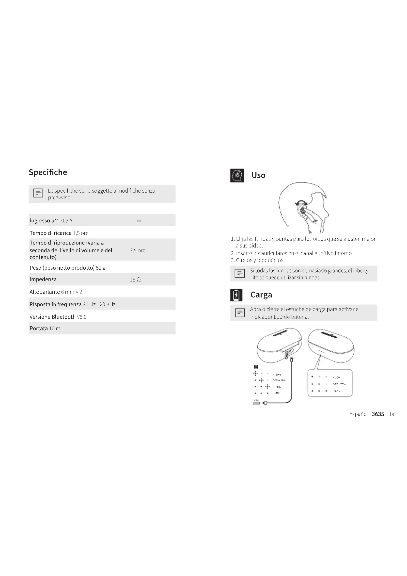 Si todas las fundas son demasiado grandes, el Liberty Lite se puede utilizar sin fundas. Carga Abra o cierre el estuche de carga para activar el indicador LED de batería. < 30% 30% - 70% > 70% 100% < 30% 30% - 70% 100%37 Español Español 38Indicador de estado de los auricularesParpadeo rojo (una vez cada minuto)Batería bajaBlanco fijo CargaApagado Carga completaPara conservar la vida útil de la batería, cárguela por completo al menos una vez cada 45 días. Encender / apagar 1. Los auriculares se encienden automáticamente al sacarlos del estuche de carga. Para encender manualmente los auriculares, pulse el botón multifunción en ambos auriculares a la vez.