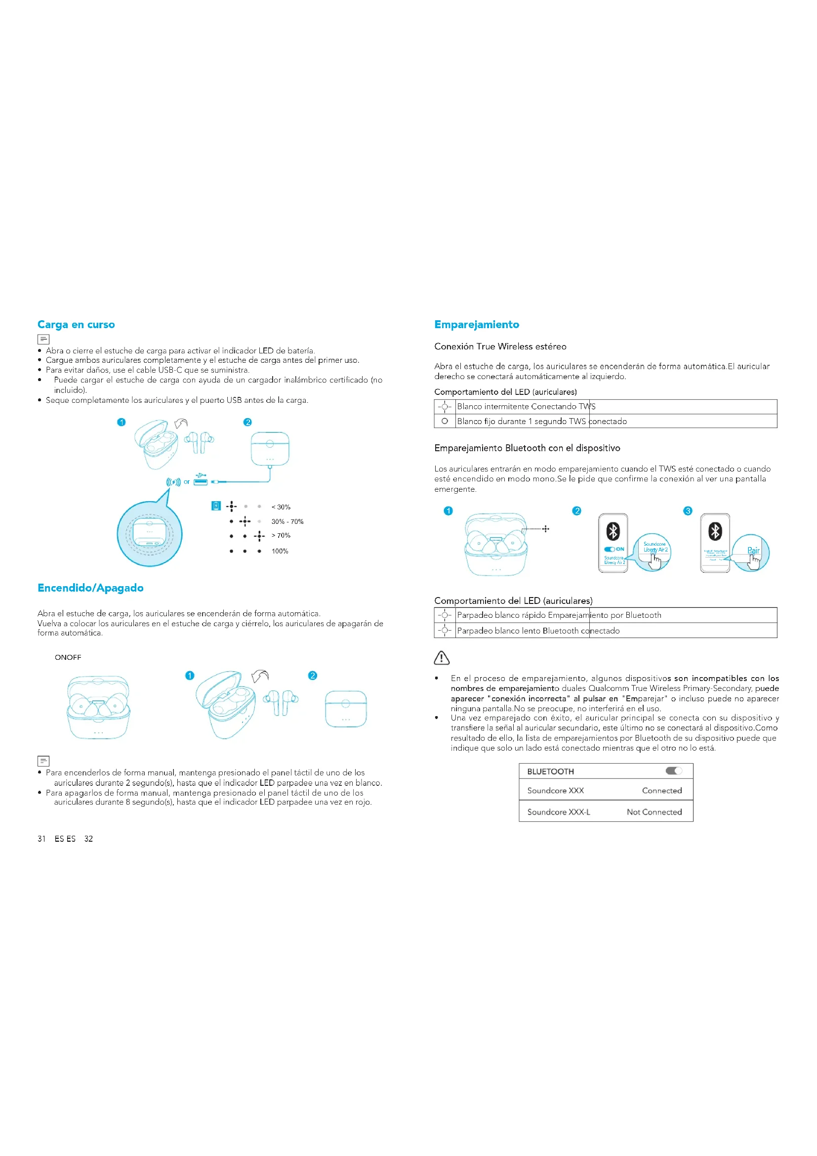- Una vez emparejado con éxito, el auricular principal se conecta con su dispositivo y transere la señal al auricular secundario, este último no se conectará al dispositivo.Como resultado de ello, la lista de emparejamientos por Bluetooth de su dispositivo puede que indique que solo un lado está conectado mientras que el otro no lo está.33 ES ES 34 Para emparejar otro dispositivo Bluetooth, vuelva a colocar los auriculares en el estuche de carga y asegúrese de que se están cargando, mantenga la tapa abierta y mantenga pulsado el botón de la parte inferior del estuche de carga durante 3 segundo(s), hasta que los indicadores LED de los auriculares parpadeen rápidamente en blanco.