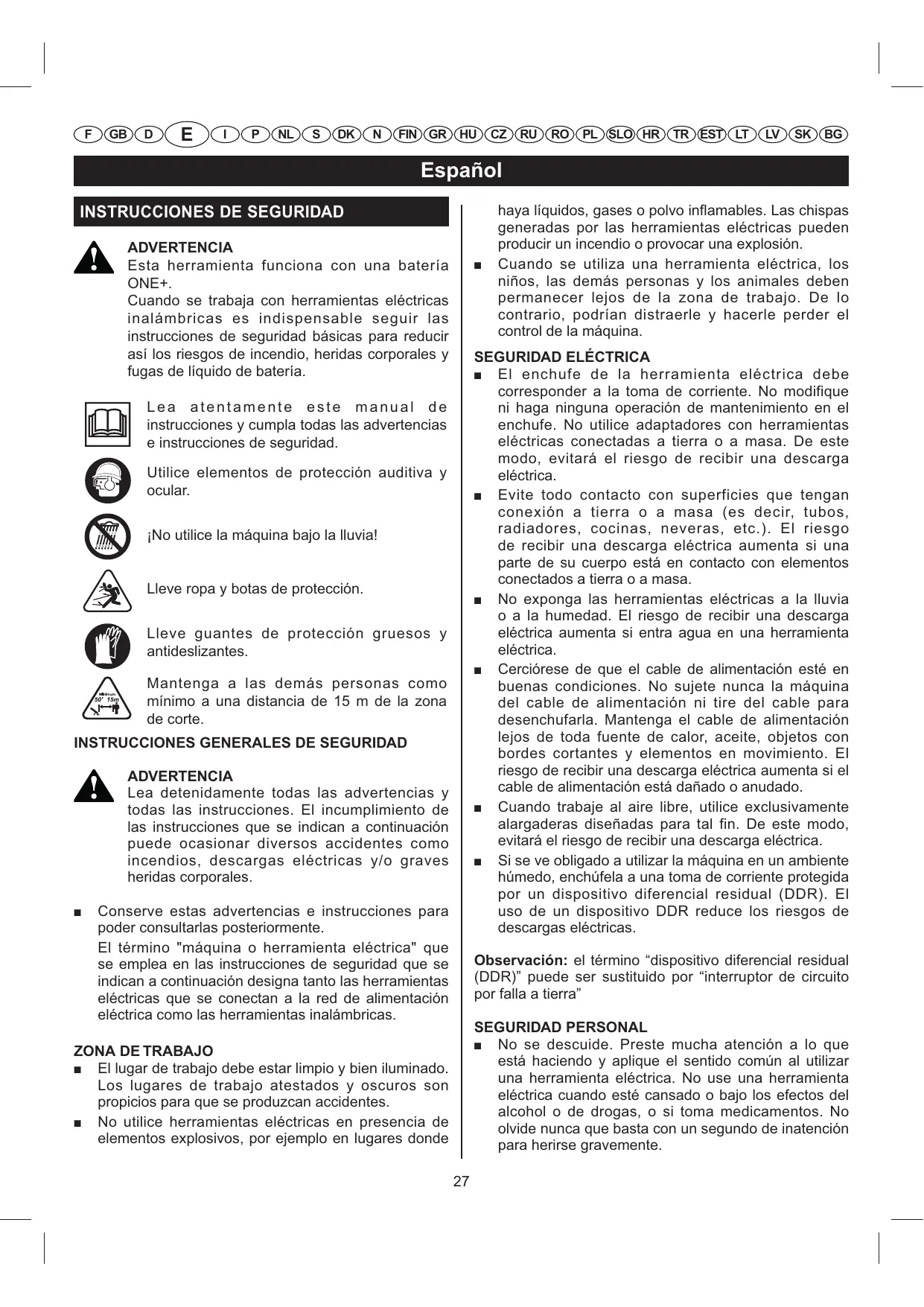 Lleve guantes de protección gruesos y antideslizantes. Mantenga a las demás personas como mínimo a una distancia de 15 m de la zona de corte. INSTRUCCIONES GENERALES DE SEGURIDAD ADVERTENCIA Lea detenidamente todas las advertencias y todas las instrucciones. El incumplimiento de las instrucciones que se indican a continuación puede ocasionar diversos accidentes como incendios, descargas eléctricas y/o graves heridas corporales. Q