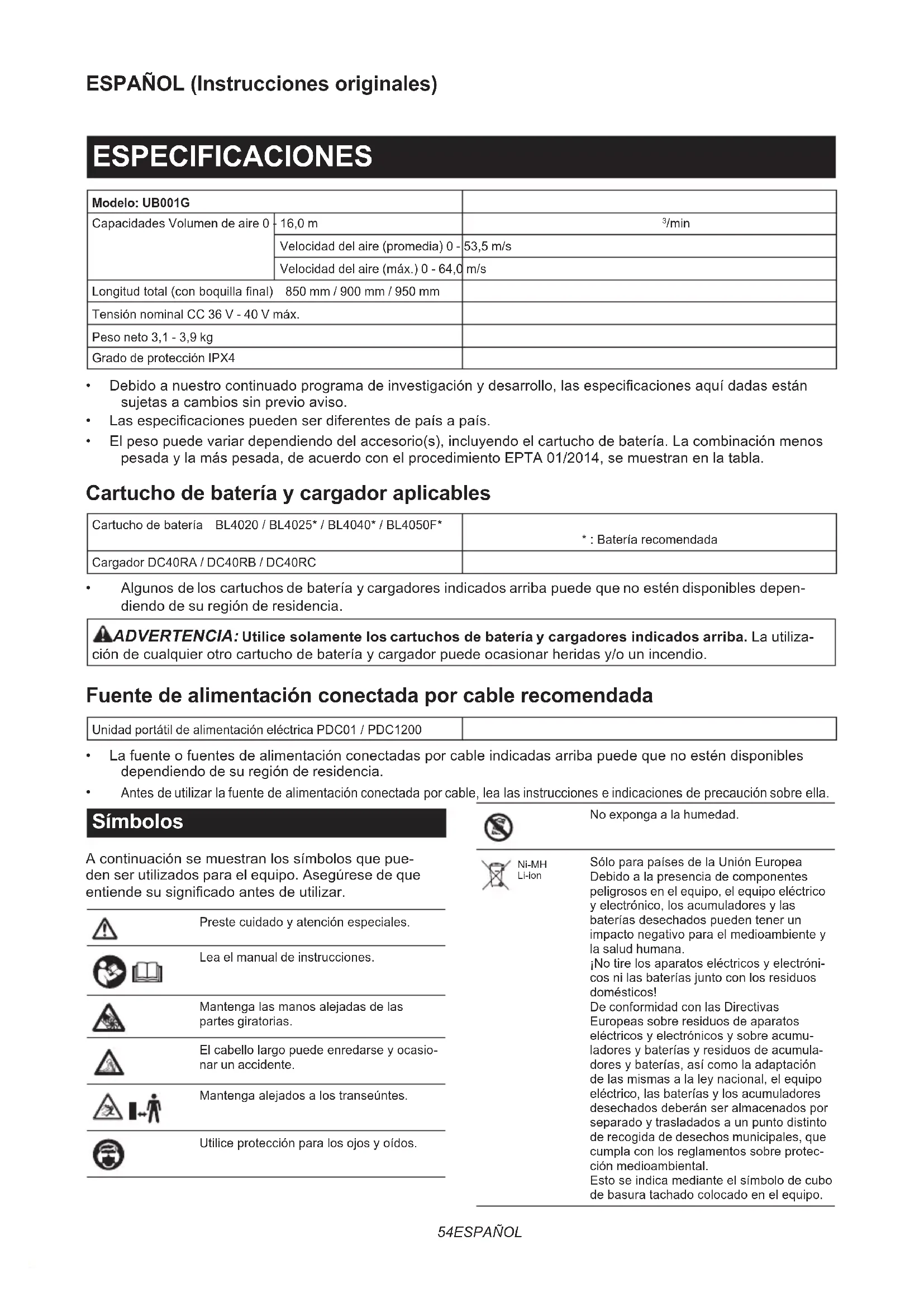 Antesdeutilizarlafuentedealimentaciónconectadaporcable,lealasinstruccioneseindicacionesdeprecauciónsobreella. Símbolos Acontinuaciónsemuestranlossímbolosquepue- den ser utilizados para el equipo. Asegúrese de que entiendesusignicadoantesdeutilizar. Prestecuidadoyatenciónespeciales. Lea el manual de instrucciones. Mantengalasmanosalejadasdelas partes giratorias. Elcabellolargopuedeenredarseyocasio- nar un accidente. Mantengaalejadosalostranseúntes. Utiliceprotecciónparalosojosyoídos. No exponga a la humedad. Ni-MH Li-ion SóloparapaísesdelaUniónEuropea Debidoalapresenciadecomponentes peligrosos en el equipo, el equipo eléctrico yelectrónico,losacumuladoresylas bateríasdesechadospuedentenerun impactonegativoparaelmedioambientey la salud humana. ¡Notirelosaparatoseléctricosyelectróni- cosnilasbateríasjuntoconlosresiduos domésticos! De conformidad con las Directivas Europeassobreresiduosdeaparatos eléctricosyelectrónicosysobreacumu- ladoresybateríasyresiduosdeacumula- doresybaterías,asícomolaadaptación delasmismasalaleynacional,elequipo eléctrico,lasbateríasylosacumuladores desechadosdeberánseralmacenadospor separadoytrasladadosaunpuntodistinto de recogida de desechos municipales, que cumplaconlosreglamentossobreprotec- ciónmedioambiental. Estoseindicamedianteelsímbolodecubo debasuratachadocolocadoenelequipo.55 ESPAÑOL Nivel de potencia del sonido garantizado deacuerdoconlaDirectivaUEsobreruidoambiental.Nivel de potencia del sonido de acuerdo con el reglamento para el control de ruido en NSW, Australia Uso previsto La máquina ha sido prevista para quitar polvo soplando. Ruido ElnivelderuidoA-ponderadotípicodeterminadode acuerdoconlanormaEN50636-2-100: Nivel de presión sonora (L