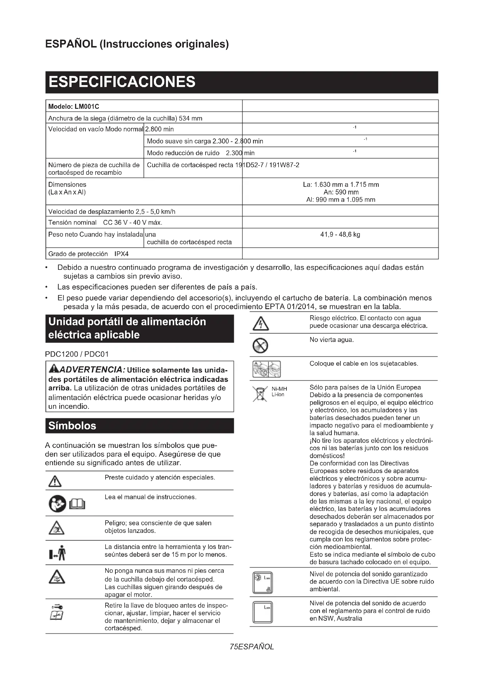 - Elpesopuedevariardependiendodelaccesorio(s),incluyendoelcartuchodebatería.Lacombinaciónmenos pesadaylamáspesada,deacuerdoconelprocedimientoEPTA01/2014,semuestranenlatabla. Unidad portátil de alimentación eléctrica aplicable PDC1200 / PDC01 ADVERTENCIA: Utilice solamente las unida- des portátiles de alimentación eléctrica indicadas arriba.Lautilizacióndeotrasunidadesportátilesde alimentacióneléctricapuedeocasionarheridasy/o un incendio. Símbolos Acontinuaciónsemuestranlossímbolosquepue- den ser utilizados para el equipo. Asegúrese de que entiendesusignicadoantesdeutilizar. Prestecuidadoyatenciónespeciales. Lea el manual de instrucciones. Peligro; sea consciente de que salen objetoslanzados. Ladistanciaentrelaherramientaylostran- seúntes deberá ser de 15 m por lo menos. No ponga nunca sus manos ni pies cerca delacuchilladebajodelcortacésped. Las cuchillas siguen girando después de apagar el motor. Retire la llave de bloqueo antes de inspec- cionar,ajustar,limpiar,hacerelservicio demantenimiento,dejaryalmacenarel cortacésped. Riesgo eléctrico. El contacto con agua puede ocasionar una descarga eléctrica. No vierta agua. Coloqueelcableenlossujetacables. Ni-MH Li-ion SóloparapaísesdelaUniónEuropea Debido a la presencia de componentes peligrosos en el equipo, el equipo eléctrico yelectrónico,losacumuladoresylas baterías desechados pueden tener un impactonegativoparaelmedioambientey la salud humana. ¡Notirelosaparatoseléctricosyelectróni- cosnilasbateríasjuntoconlosresiduos domésticos! De conformidad con las Directivas Europeas sobre residuos de aparatos eléctricosyelectrónicosysobreacumu- ladoresybateríasyresiduosdeacumula- doresybaterías,asícomolaadaptación delasmismasalaleynacional,elequipo eléctrico,lasbateríasylosacumuladores desechados deberán ser almacenados por separadoytrasladadosaunpuntodistinto de recogida de desechos municipales, que cumpla con los reglamentos sobre protec- ciónmedioambiental. Esto se indica mediante el símbolo de cubo de basura tachado colocado en el equipo. Nivel de potencia del sonido garantizado de acuerdo con la Directiva UE sobre ruido ambiental. Nivel de potencia del sonido de acuerdo con el reglamento para el control de ruido en NSW, Australia76 ESPAÑOL Uso previsto La máquina ha sido prevista para segar césped. Acerca de este manual de instrucciones El término "batería" o "cartucho de batería" en este manual de instrucciones hace referencia a lo siguiente: