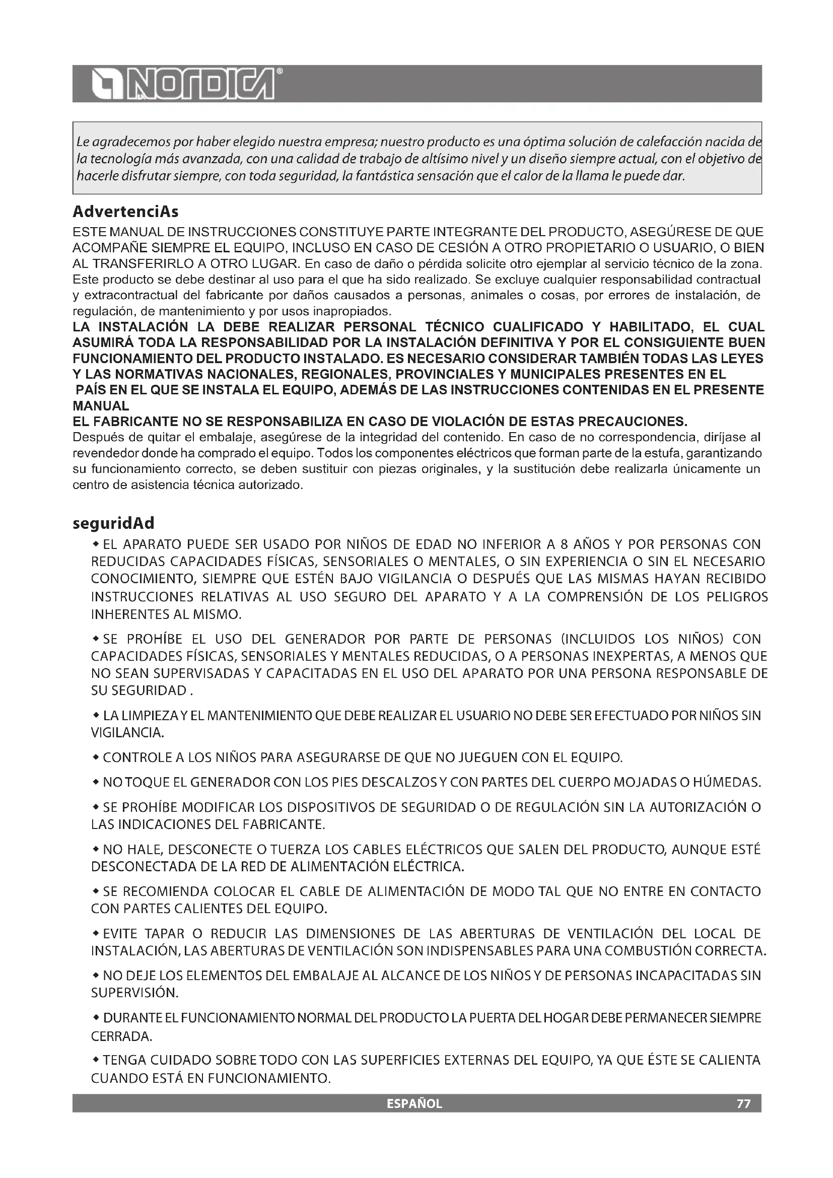Qué hacer en caso de funcionamiento anómalo del producto: Consulte el manual de instrucciones para ver si la anomalía puede ser resuelta mediante la aplicación correcta de las funciones del producto en cuestión. Asegúrese de que el defecto se incluye en el tipo de anomalías cubiertas por la garantía; de lo contrario, el coste de la intervención correrá en su totalidad a cargo del consumidor. Solicite la intervención del Servicio de Asistencia o la dirección del Centro de Asistencia Técnica Autorizado al vendedor, indicando siempre: la naturaleza del defecto, el modelo de su aparato, la dirección completa y el número de teléfono. En caso de falta de conformidad que se manieste en los 6 primeros meses de vida del producto, el consumidor tiene derecho a la reparación del defecto de forma gratuita. Del séptimo al vigésimo cuarto mes, en caso de que se compruebe una falta de conformidad, el consumidor tendrá que asumir el coste de la llamada, mientras que el vendedor seguirá haciéndose cargo del coste de la mano de obra y de posibles recambios funcionales utilizados. 2. Si el defecto observado es atribuible a condiciones o eventos externos, tales como, a modo de ejemplo y sin ser exhaustivos, la insuciente capacidad de las instalaciones; la instalación o mantenimiento erróneo llevado a cabo por personal que no cumple los requisitos establecidos por la legislación vigente en el país de residencia del consumidor; la negligencia; la imposibilidad de uso y el mantenimiento incorrecto por parte del consumidor respecto a lo indicado y recomendado en el manual de instrucciones del producto, que forma parte del contrato de venta, se anula la presente garantía. Tampoco se incluyen en esta garantía los daños sufridos por el producto en ausencia de causas comprobadas imputables a defectos de fabricación. Del mismo modo, quedan excluidos de la presente garantía los defectos atribuidos al funcionamiento incorrecto del conducto de humos, en virtud de la legislación vigente en el país en el momento de la compra, así como todos los defectos del producto debidos a desidia, rotura accidental, manipulación o daños en el transporte (arañazos, abolladuras, etc.), intervenciones realizadas por personal no autorizado y otros daños causados por intervenciones erróneas del consumidor en un intento de remediar la avería inicial. Se excluyen de la garantía los siguientes consumibles: juntas, cristales cerámicos o templados, revestimientos y rejillas de hierro fundido, materiales refractarios (p. ej., Nordiker u otros), componentes pintados, cromados o dorados, elementos de mayólica, manillas, brasero y componentes relacionados. En los productos Idro, el intercambiador de calor está excluido de la garantía si no se realiza un circuito anticondensación adecuado que garantice una temperatura de retorno del aparato de al menos 55 grados. Por lo general, se excluyen de la garantía todos los componentes externos al producto en los que el consumidor puede intervenir directamente durante el uso o mantenimiento, o que pueden estar sujetos a desgaste, o la formación de óxido y manchas en el acero debido al uso de productos de limpieza agresivos. En caso de indicar defectos no observados después en la fase de comprobación por parte de un técnico autorizado, la intervención correrá en su totalidad por cuenta del consumidor. 3. Si no fuera posible restablecer la conformidad mediante la reparación del producto/componente, se procederá a su sustitución, sin alterar el periodo de vencimiento y los términos de garantía adquiridos en el momento de la compra del producto/componente a sustituir. 4. La NORDICA S.p.A. declina toda responsabilidad por posibles daños que puedan sufrir, directa o indirectamente, personas, 92ESPAÑOL animales y objetos como consecuencia del incumplimiento de todas las prescripciones indicadas en el correspondiente manual de instrucciones y relativas advertencias en cuestión de instalación, uso y mantenimiento del producto, que también puede descargarse de la página web. 5. Se excluyen de la garantía las intervenciones para el calibrado o regulación del producto en relación con el tipo de combustible u otro. 6. Si el producto fuese reparado en uno de los Centros de Asistencia Técnica Autorizados indicados por La NORDICA S.p.A. y en caso de sustitución del producto, el transporte será gratuito. En los casos en los que el técnico fuera capaz de reparar el producto en el domicilio del usuario y este último se negara a ello, el transporte al laboratorio y la devolución estarán a su cargo. 7. Tras el periodo de 24 meses de garantía, cualquier intervención de reparación será abonada en su totalidad por el consumidor. 8. En caso de litigio, el órgano judicial de competencia será exclusivamente el foro de la sede legal de La NORDICA S.p.A. (Vicenza- Italia). AdvERTENcIAs AdIcIONALEs
